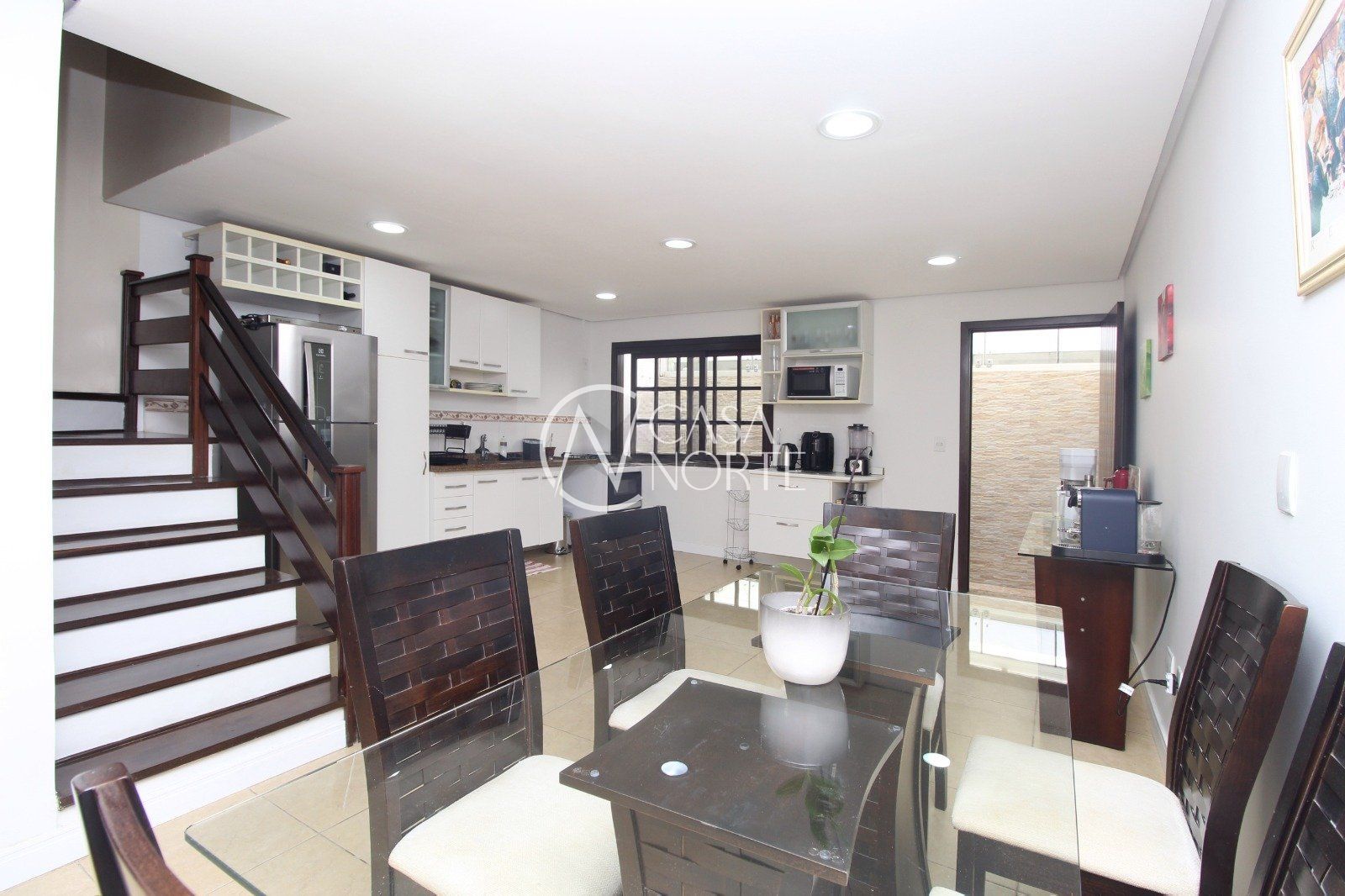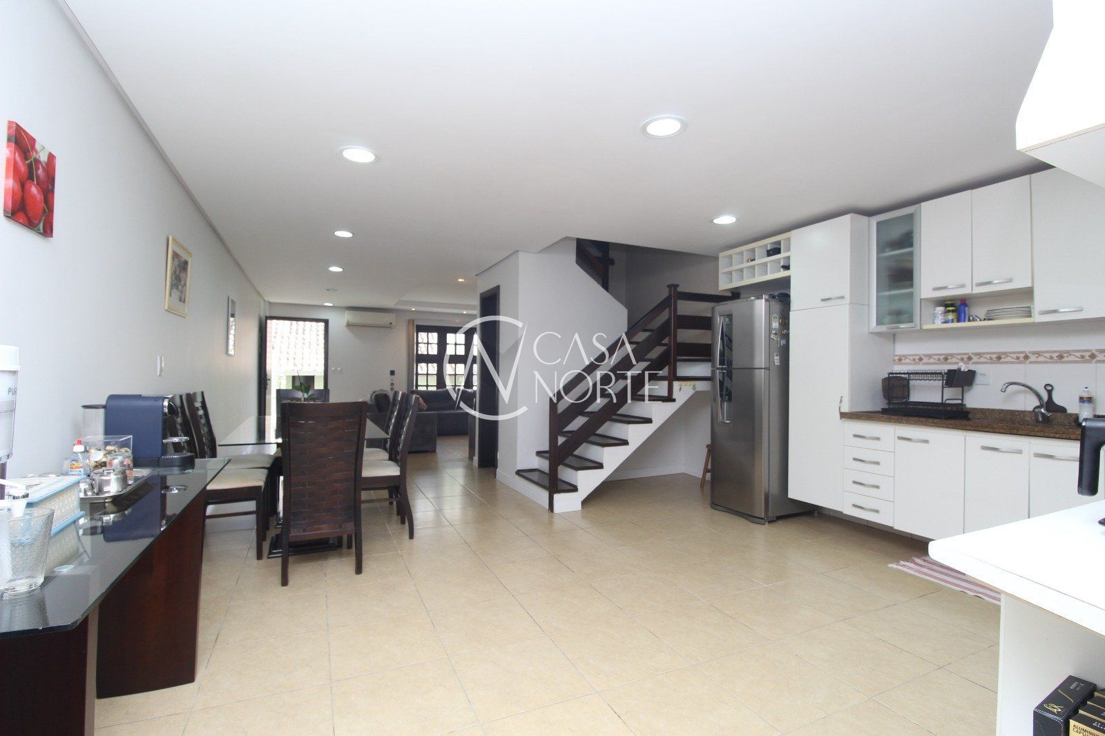 Esta casa oferece um living espaçoso integrado à cozinha e sala de jantar em conceito aberto, criando um ambiente funcional e acolhedor. O teto em gesso com iluminação realça ainda mais os espaços.