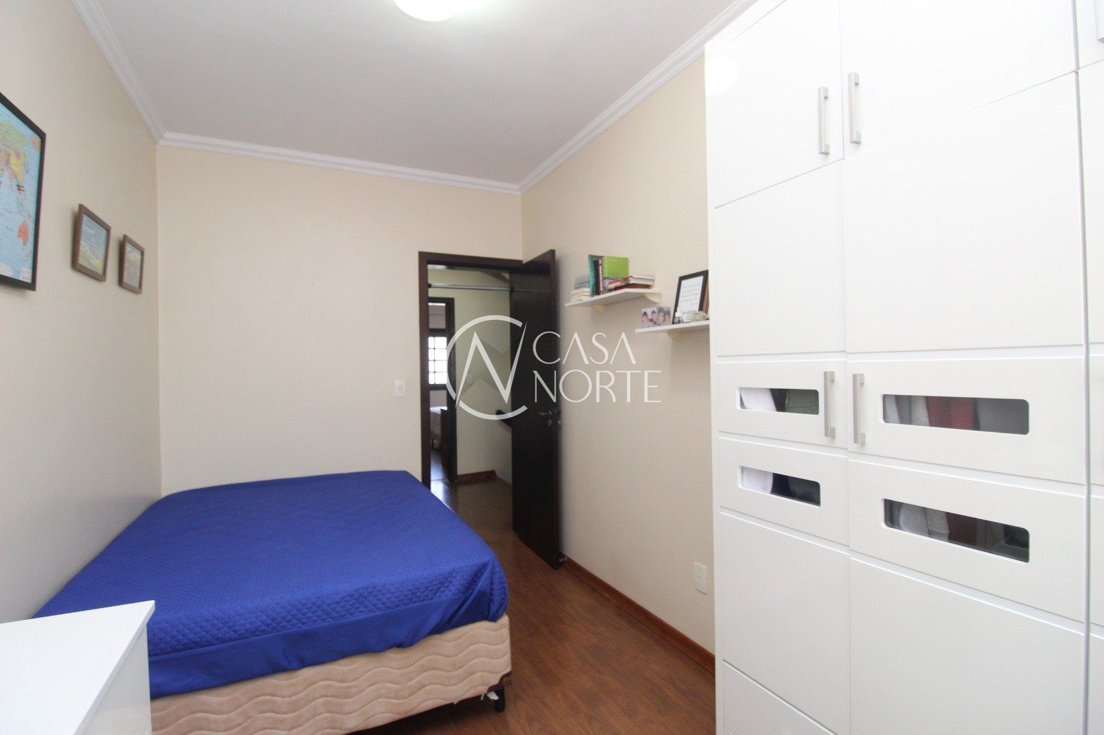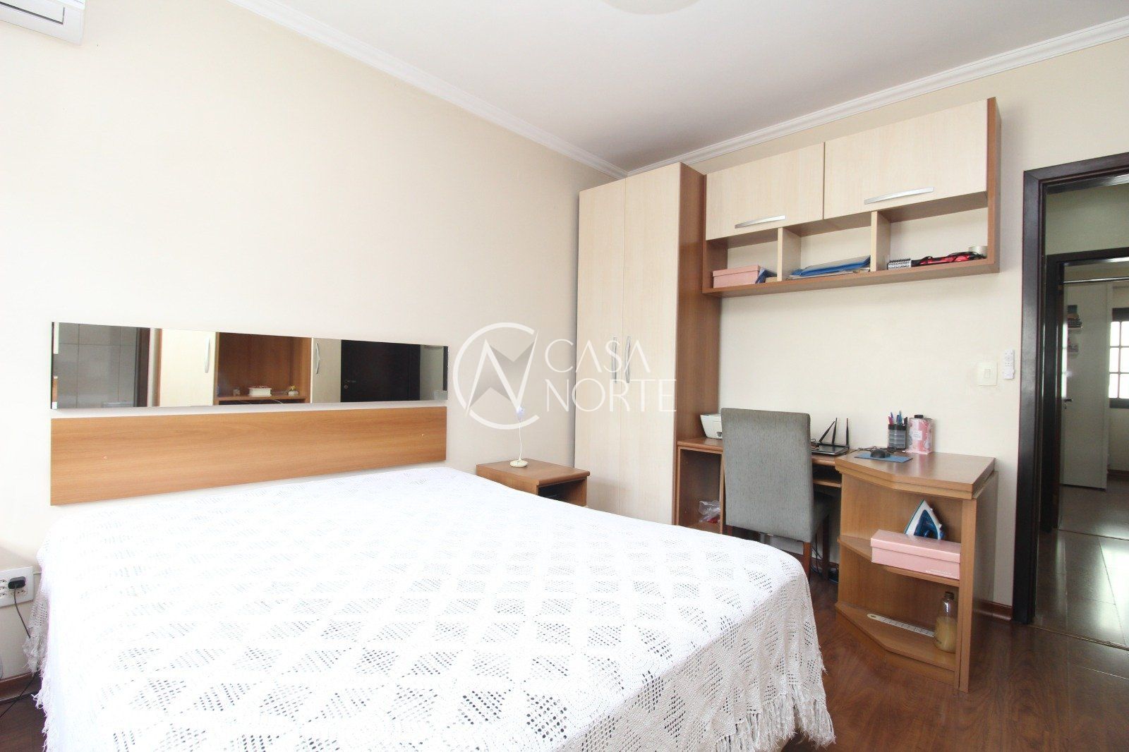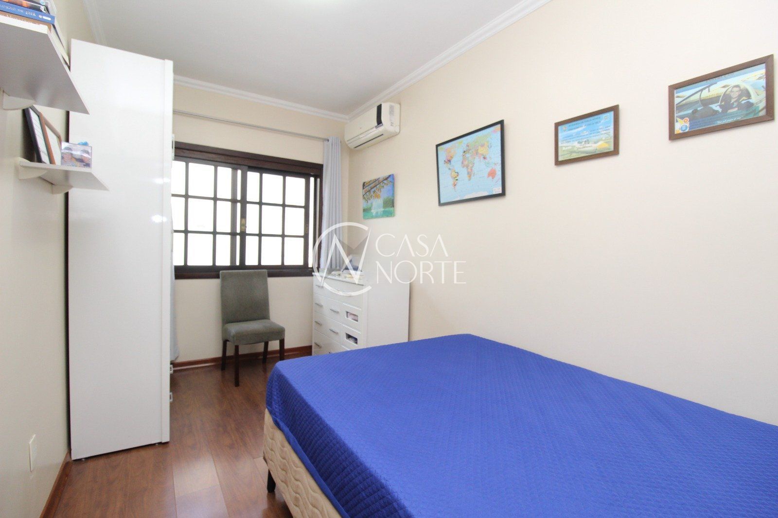A área íntima conta com uma suíte com sacada e vista para a praça, além de dois dormitórios amplos e um banheiro social.