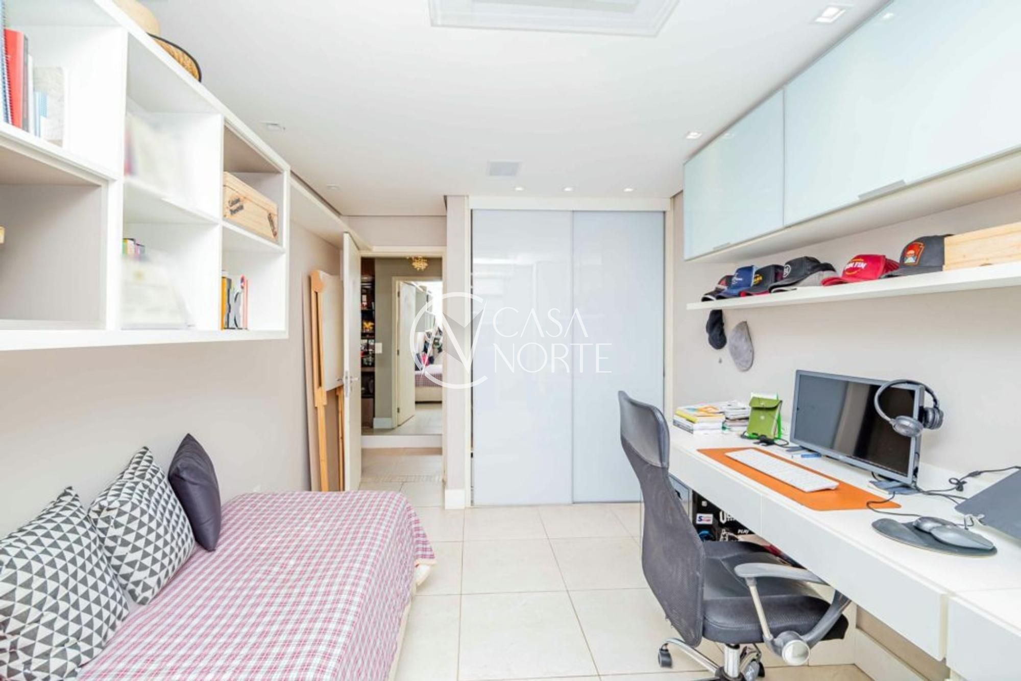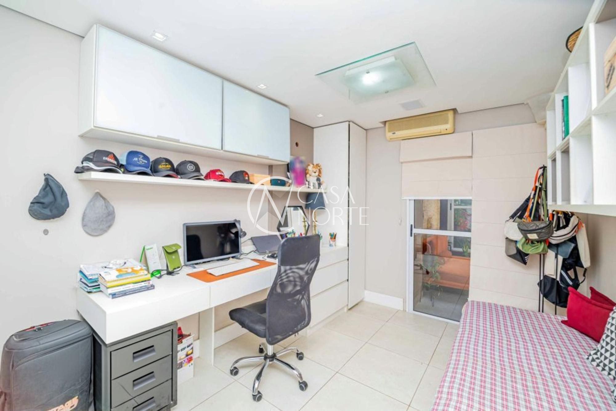 Suíte com ar-condicionado, janelas grandes, boa entrada de luz, banheiro com box de vidro e revestimento em cerâmica. Segundo dormitório espaçoso, janela ampla com ventilação natural, ar-condicionado, possibilidade de uso como escritório, closet ou quarto adicional.
