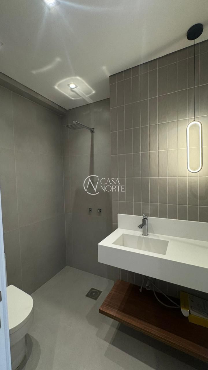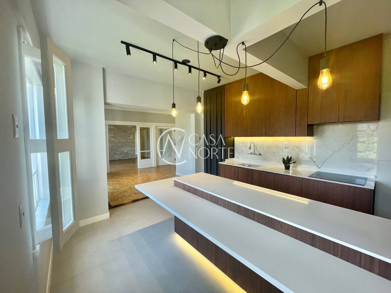 O living conta com parede em pedra estilo travertino, trazendo elegância ao ambiente. A cozinha é em conceito aberto, equipada com móveis sob medida, bancada em pedra branca e fogão por indução, além do pé-direito alto, proporcionando sensação de amplitude.