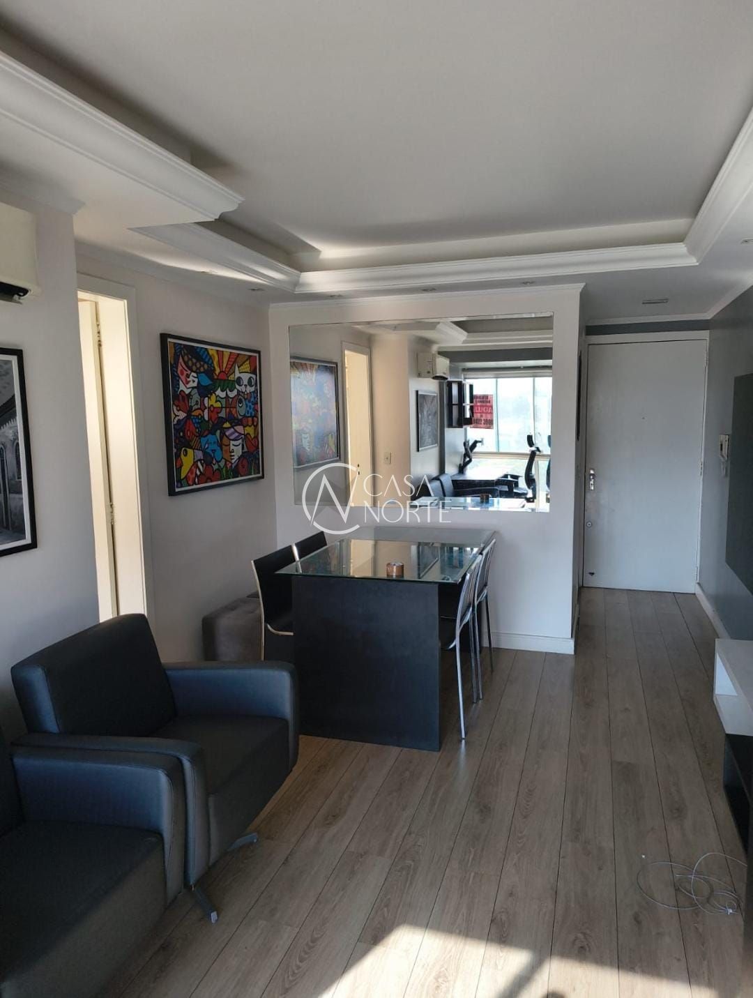 -SALA (Mesa de jantar em vidro e mais quatro cadeiras, duas poltronas, escrivania para estudo com cadeira de escritório, rac da tv, um split de ar, e decoração.