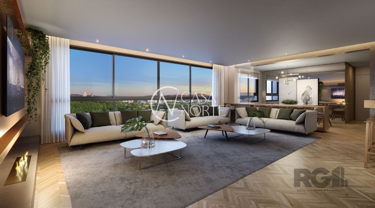 Living com janela panorâmica, comporta três ambientes: estar, jantar e espaço gourmet com churrasqueira;