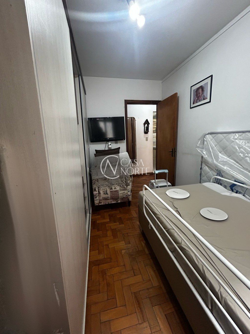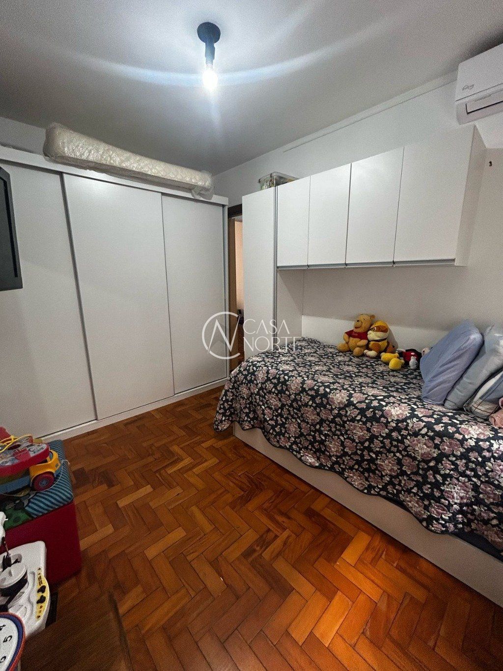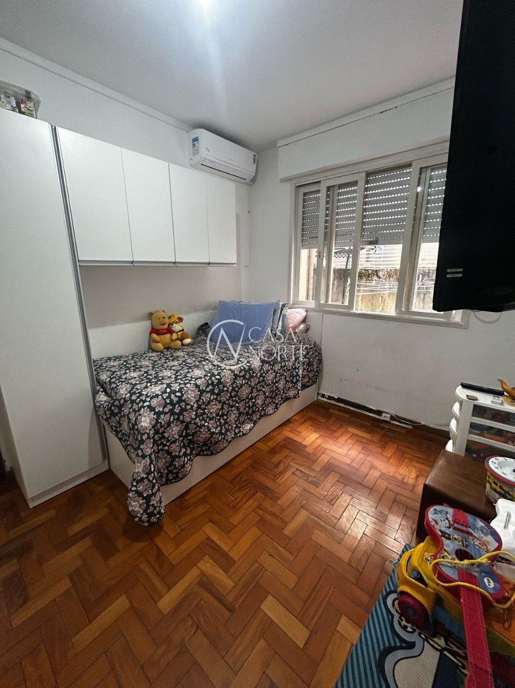 Apartamento a venda térreo elevado com 2 dormitórios, sendo um dormitório com split e guarda roupa grande. Cozinha com pia e armários fixos, area de serviço fechada. Banheiro social com box de vidro e auxiliar com ventilação natural. Todo em parquet bem conservado, bastante sol e arejado.