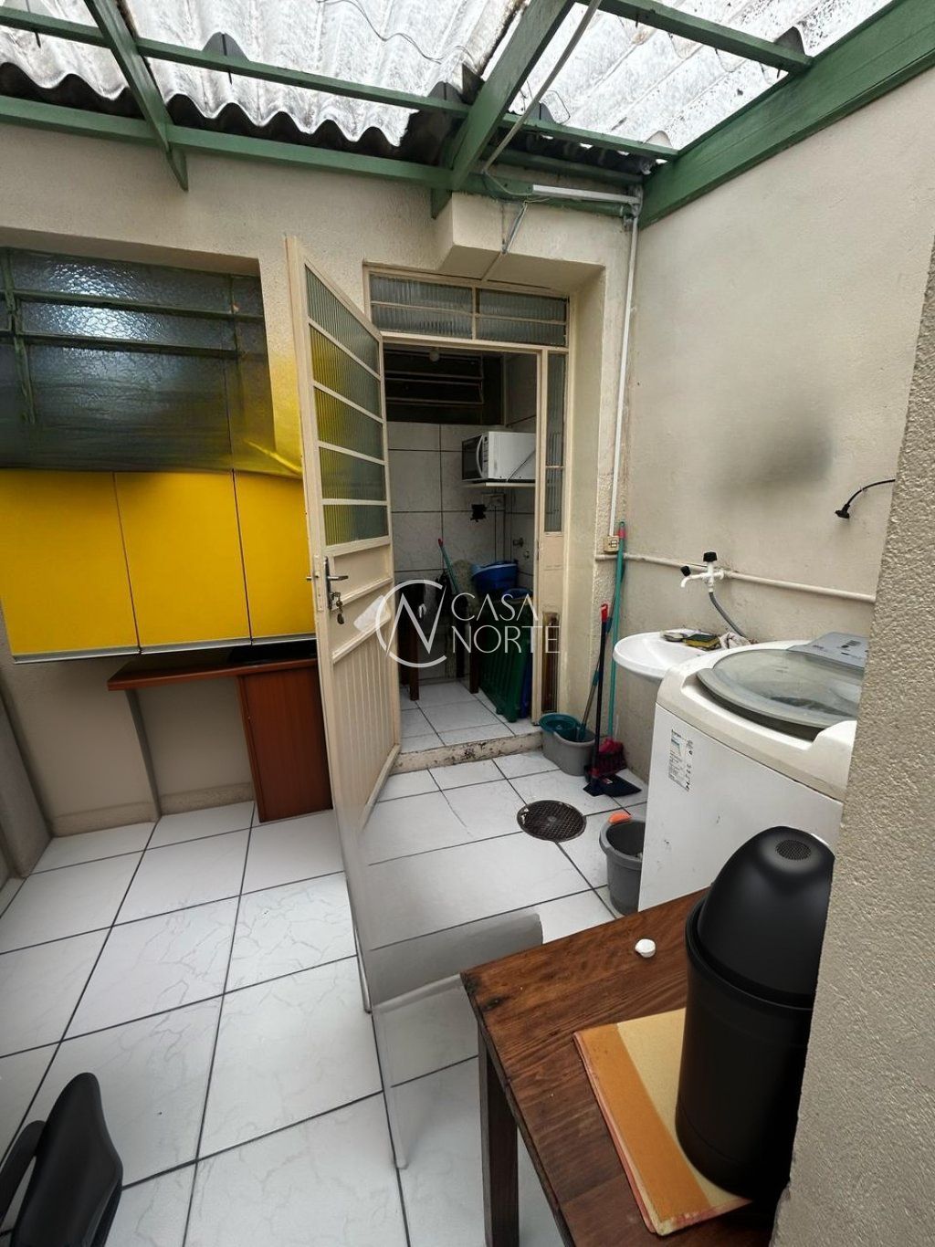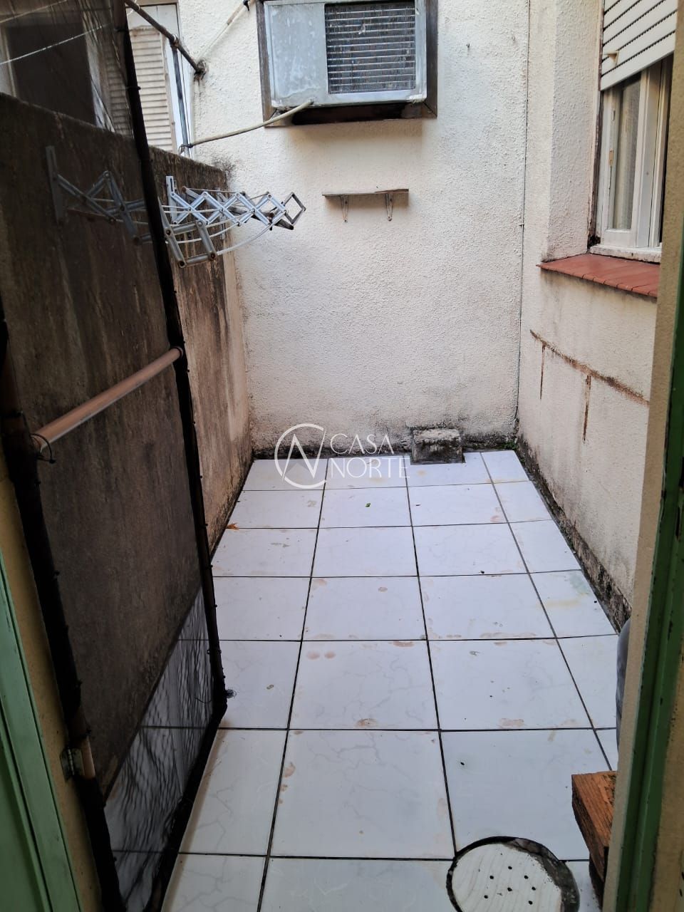 Com pátio e um lance de escadas.
