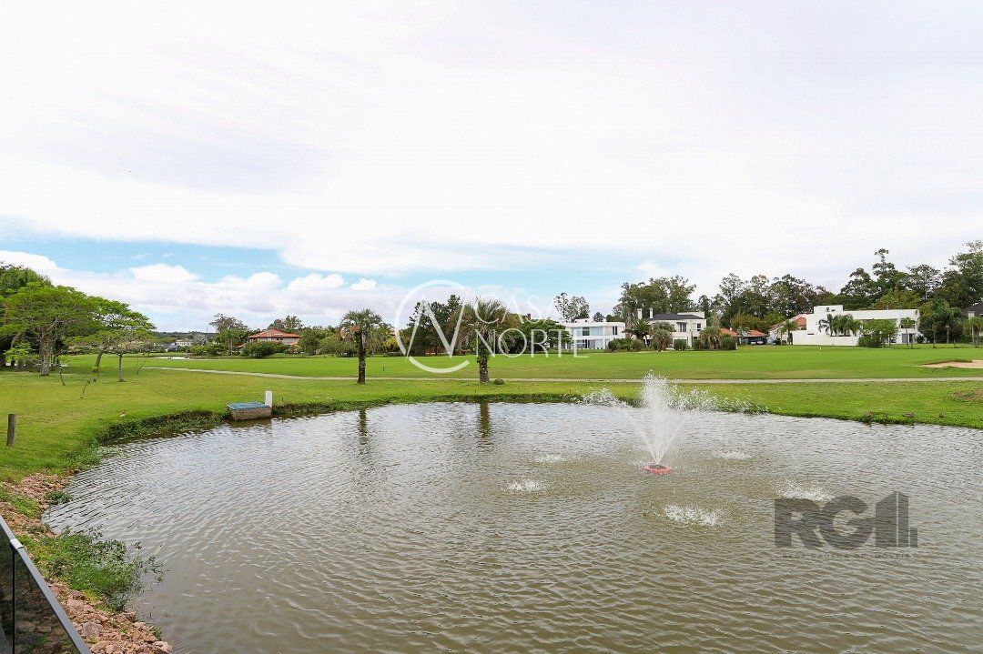 No andar superior, são quatro suítes confortáveis, incluindo uma suíte máster com sacada e vista panorâmica para um belíssimo lago com chafariz.