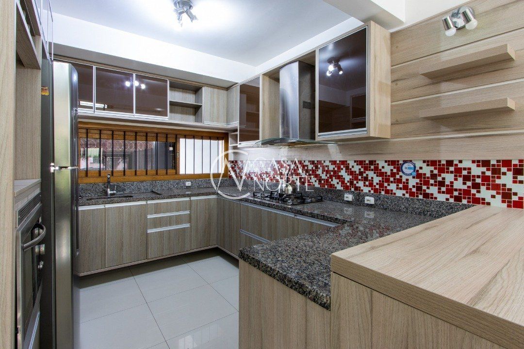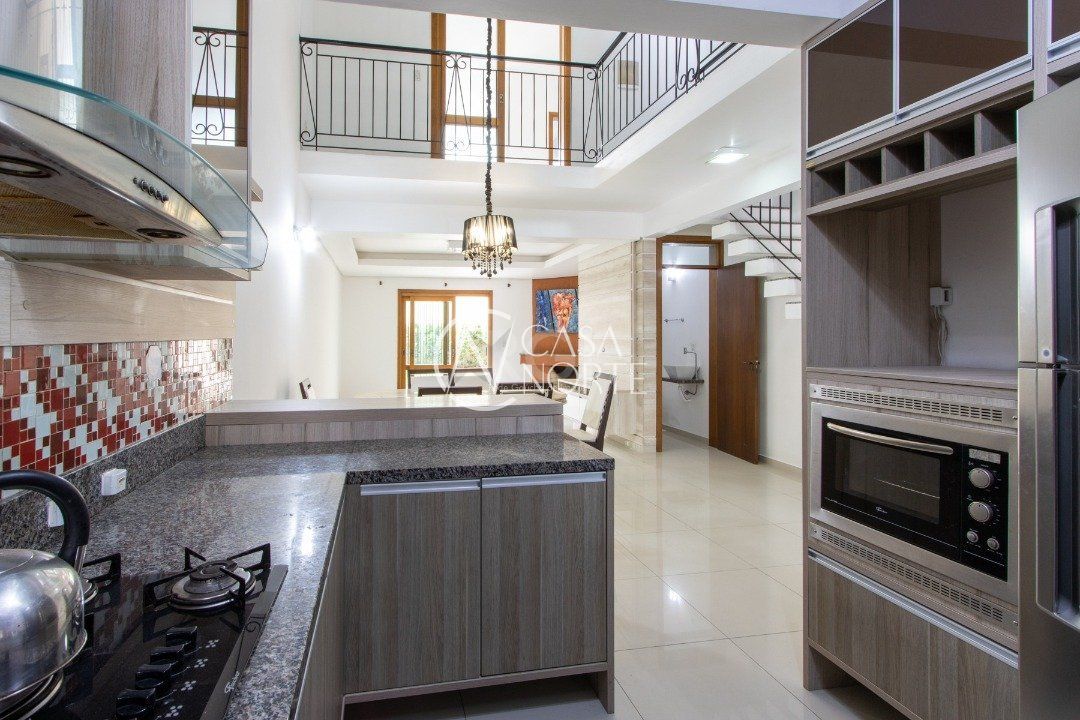 Minha Cozinha é linda com armários planejados nas cores chocolate com grafite e pastilhas em detalhes vermelho e branco, também tenho elétros domésticos embutidos, Cooktop, forno elétrico, coifa e uma linda torneira gourmet no moderno projeto, que me integra ao living e sala de jantar, lavabo, onde te espero nos dias frios com aprazível lareira.