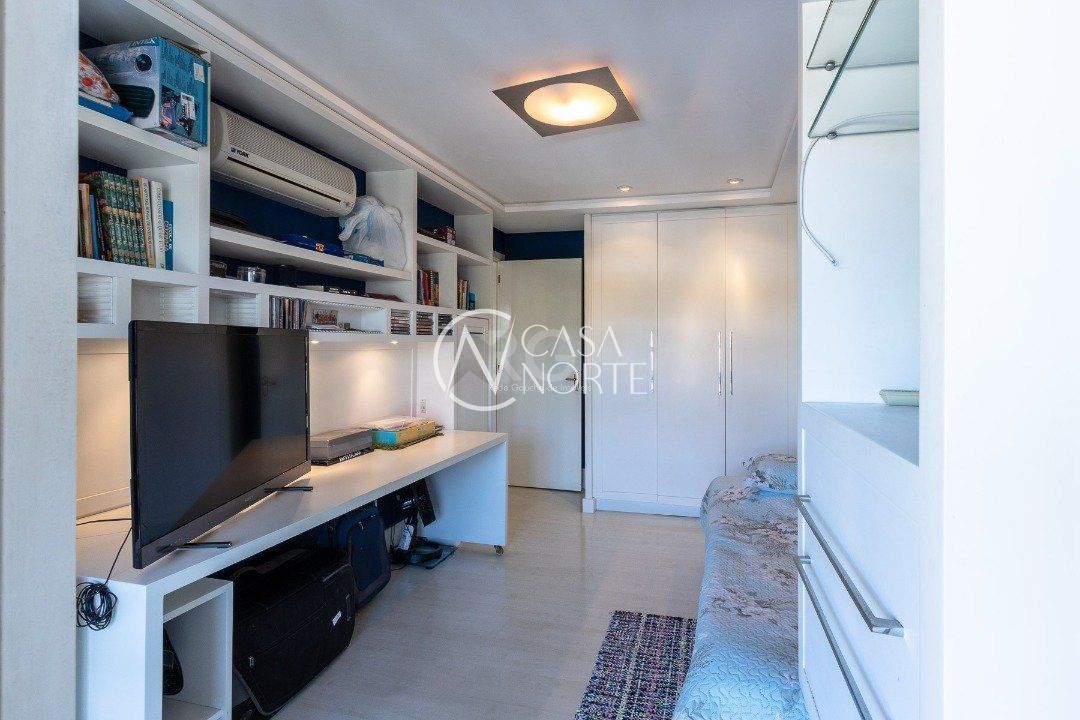 1 dormitório com móveis planejados (roupeiro com sapateira, bicama com iluminação na parte inferior e controle na cabeceira), além de escritório e minibiblioteca.