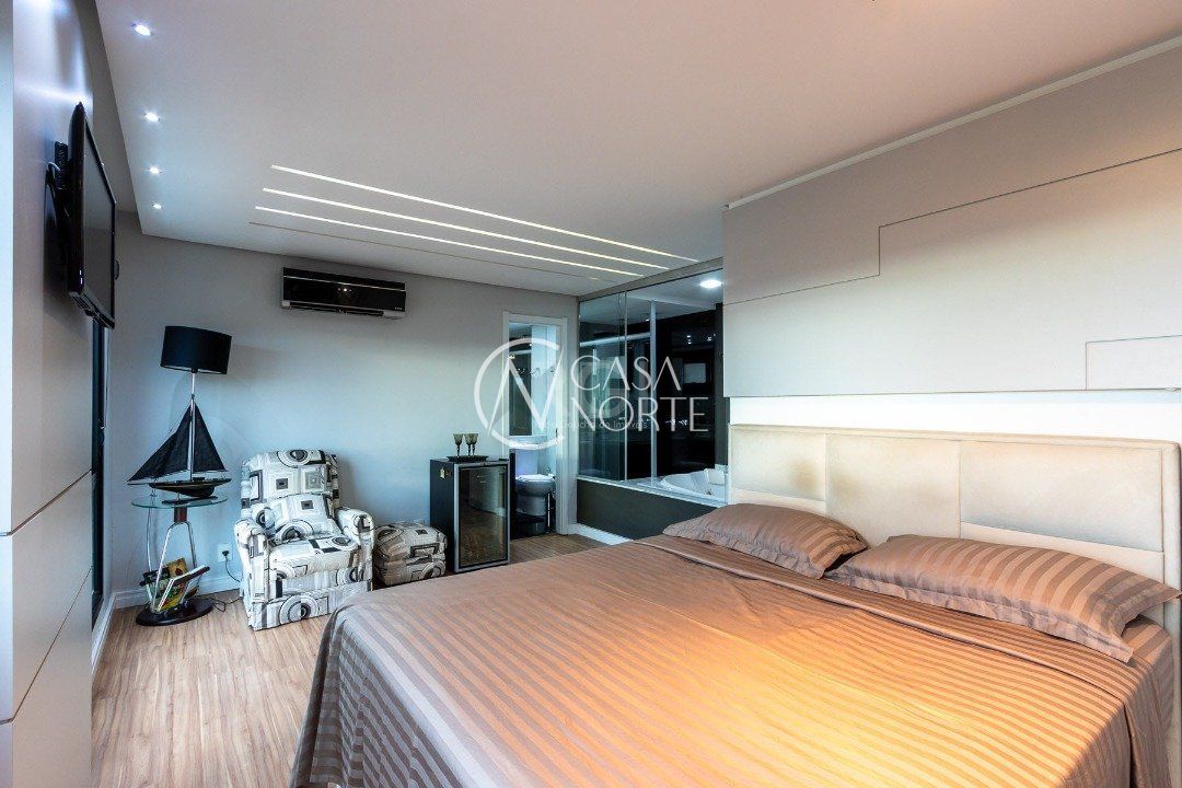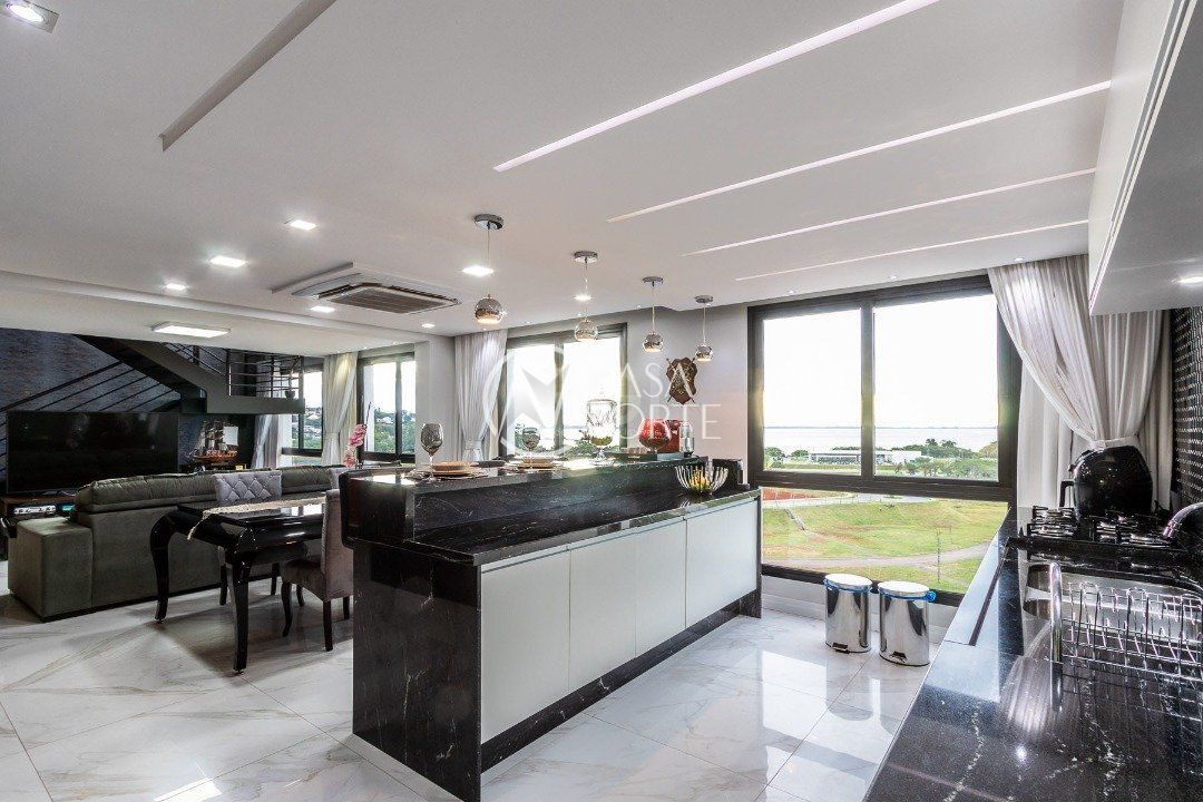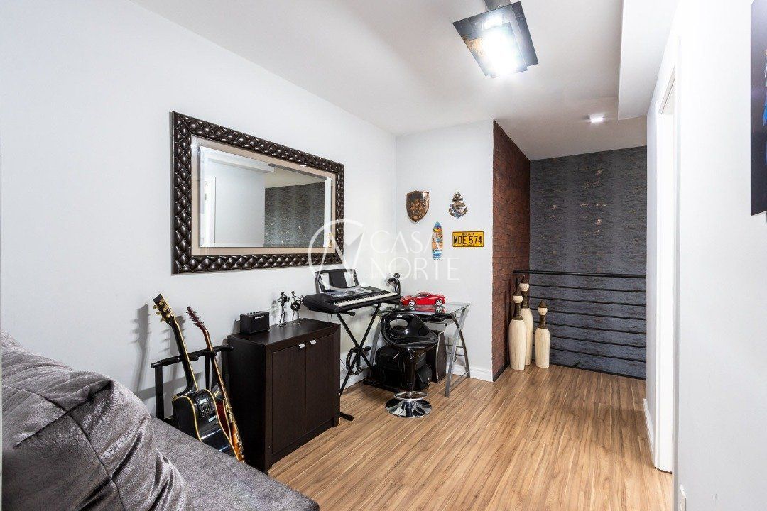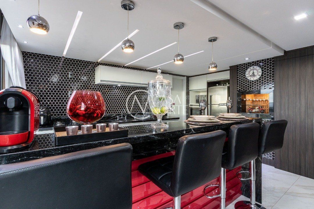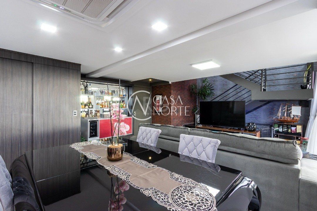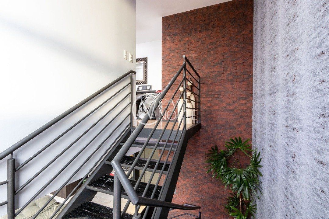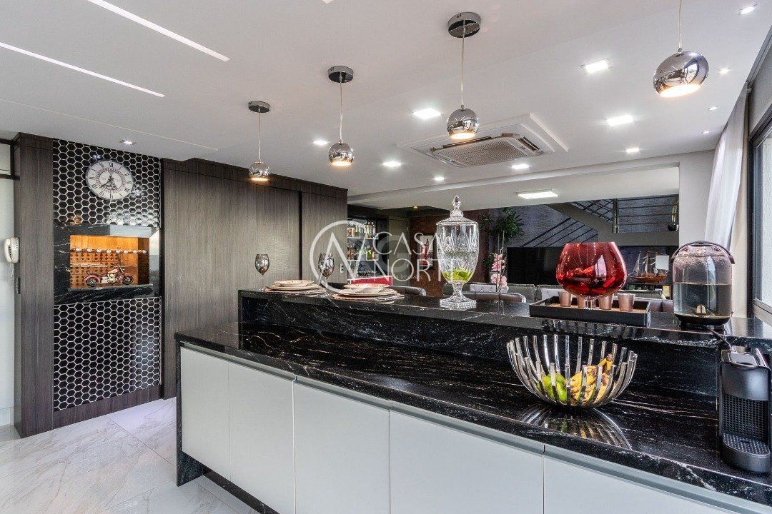 Duplex, dois dormitorios reversível para tres, com suíte master (hidromassagem), banheiro no andar superior e lavado social no piso inferior. Todas as peças com móveis sob medida, closet, escritório/sala de estudo, escada com mármore preto galáxia, bancadas e pias tbm, piso porcelanato no andar de baixo e laminado no superior, revestimento de parede com madeira, bar com iluminação e parece da escada com revestimento em tijolos. Área de serviço separada e tres vagas de garagem. Ar condicionado em todas as peças, sendo um K7 de 48 mil btus no andar inferior.