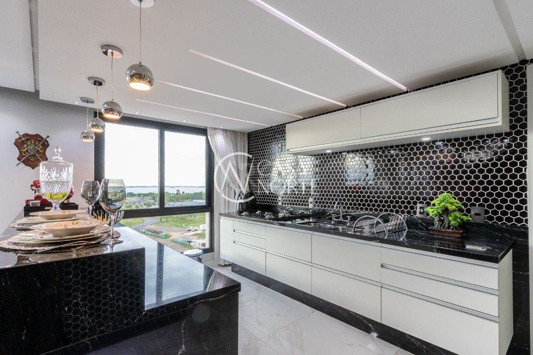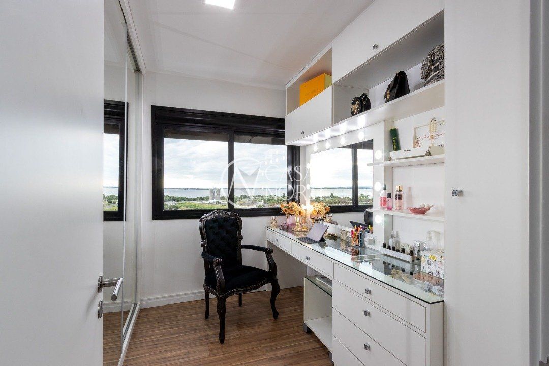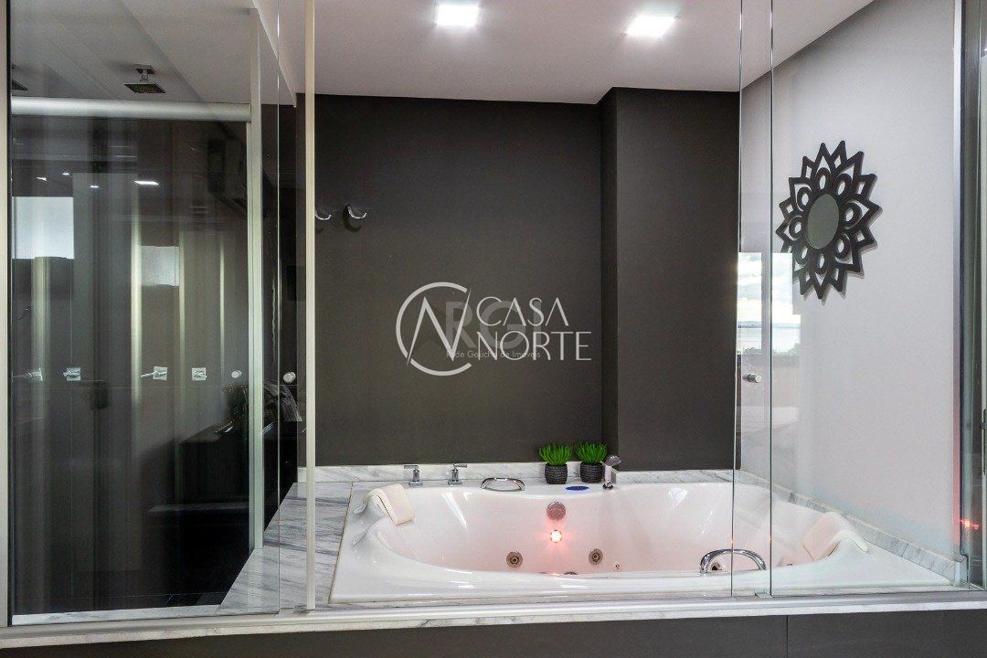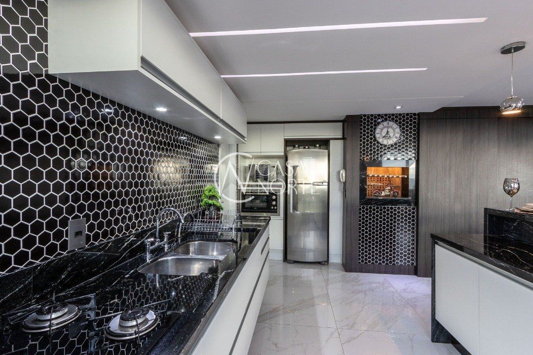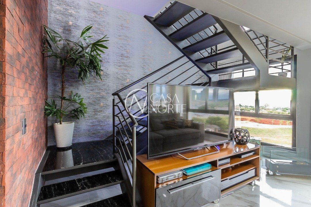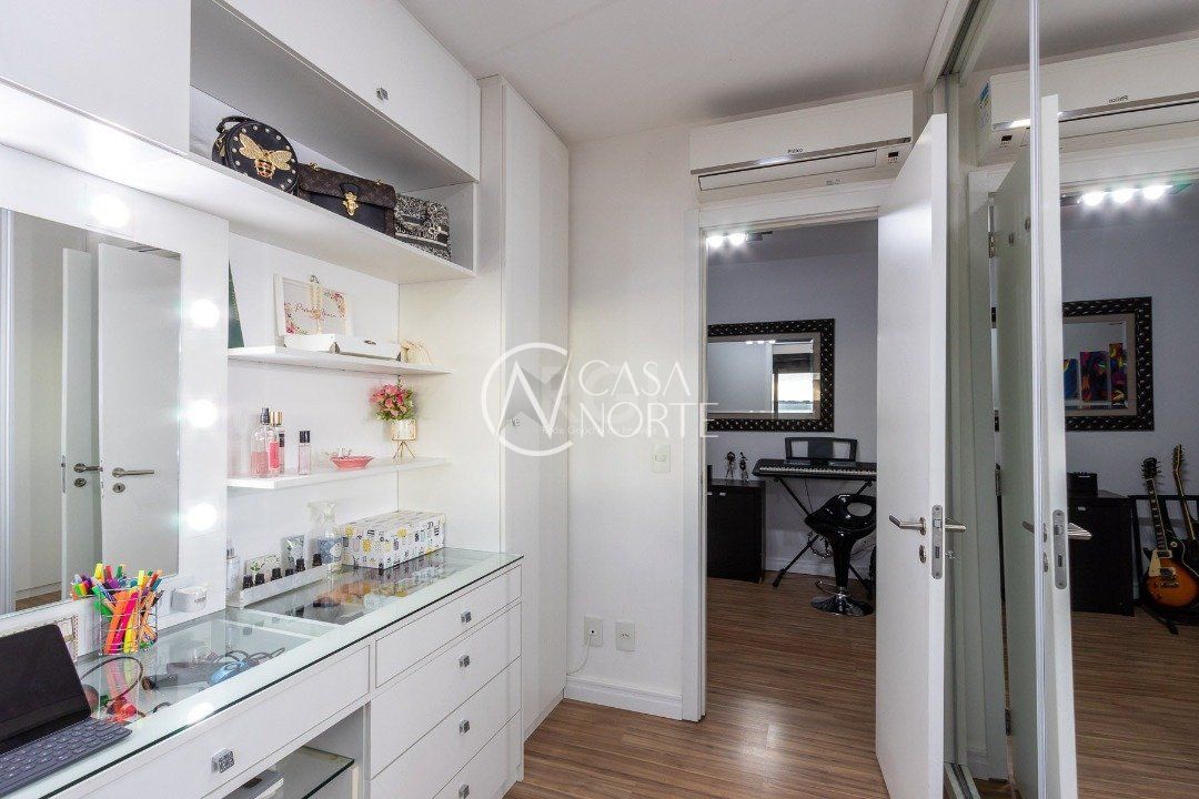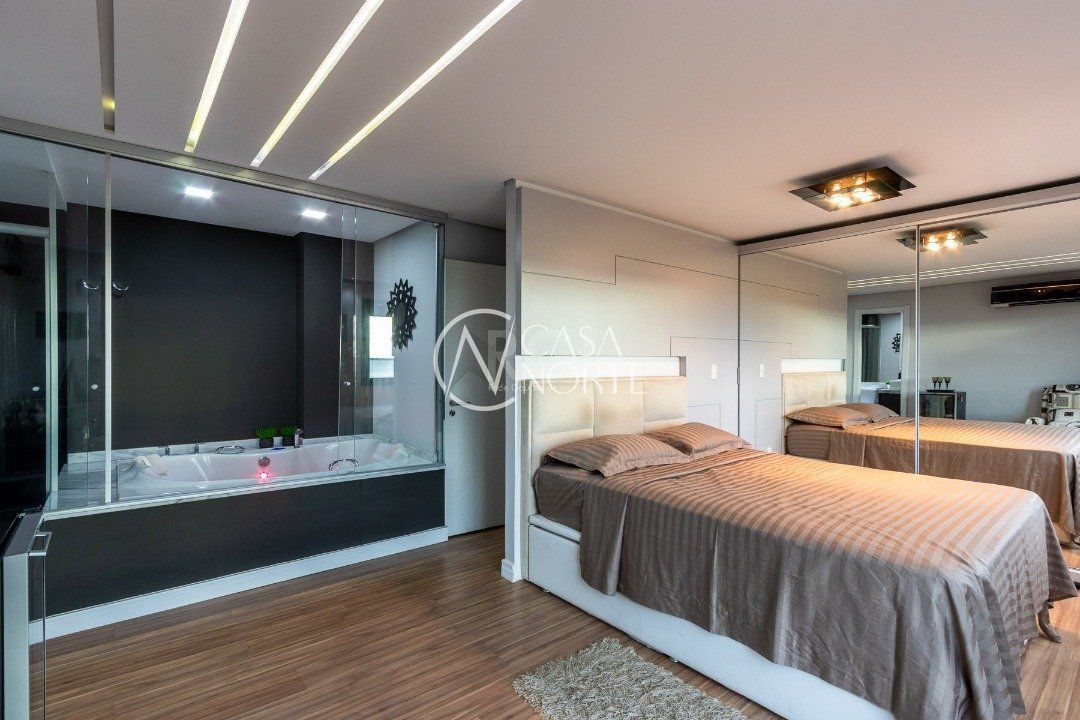 Duplex, dois dormitorios reversível para tres, com suíte master (hidromassagem), banheiro no andar superior e lavado social no piso inferior. Todas as peças com móveis sob medida, closet, escritório/sala de estudo, escada com mármore preto galáxia, bancadas e pias tbm, piso porcelanato no andar de baixo e laminado no superior, revestimento de parede com madeira, bar com iluminação e parece da escada com revestimento em tijolos. Área de serviço separada e tres vagas de garagem. Ar condicionado em todas as peças, sendo um K7 de 48 mil btus no andar inferior.