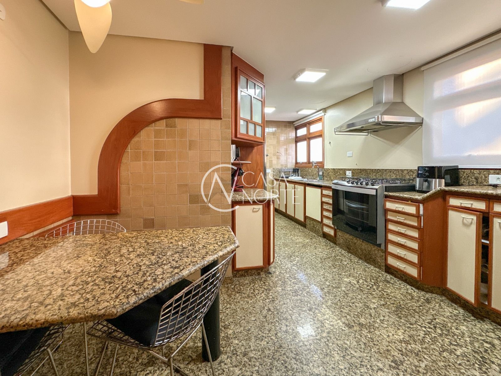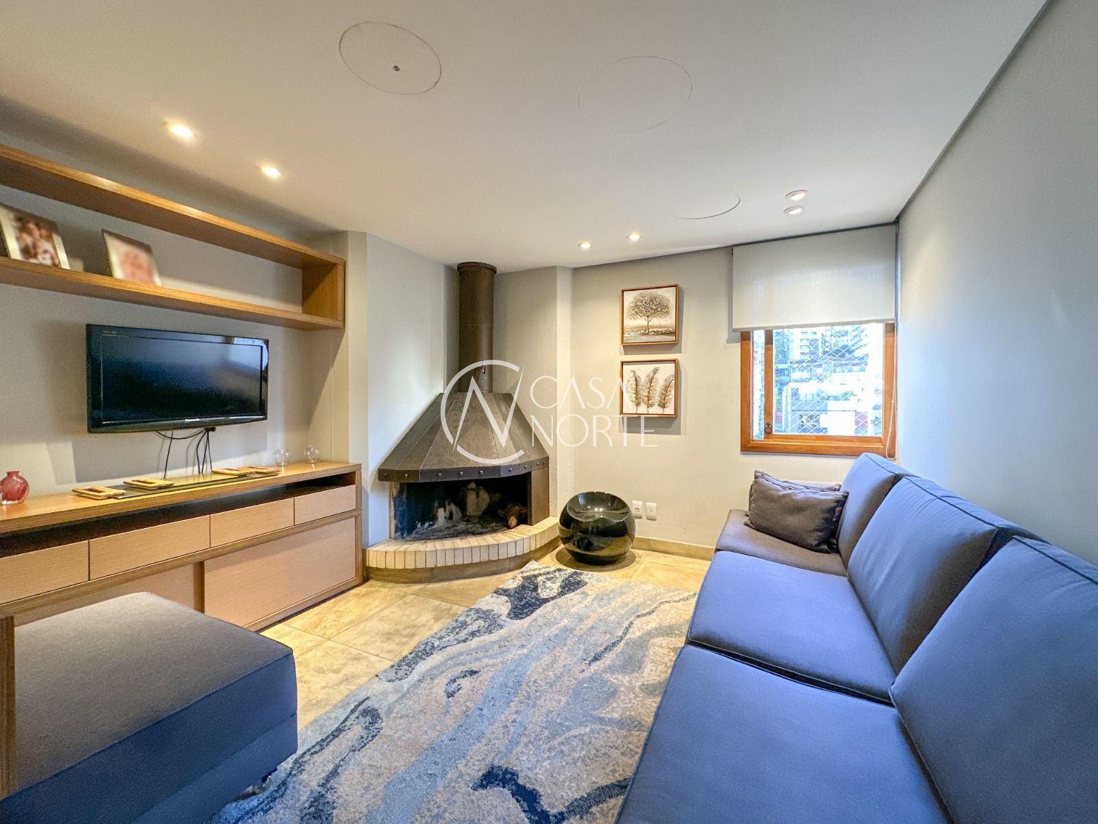 ** Parte inferior com living com lareira, estar/jantar, dormitórios, banheiro social, lavabo e dependência de empregada completa.