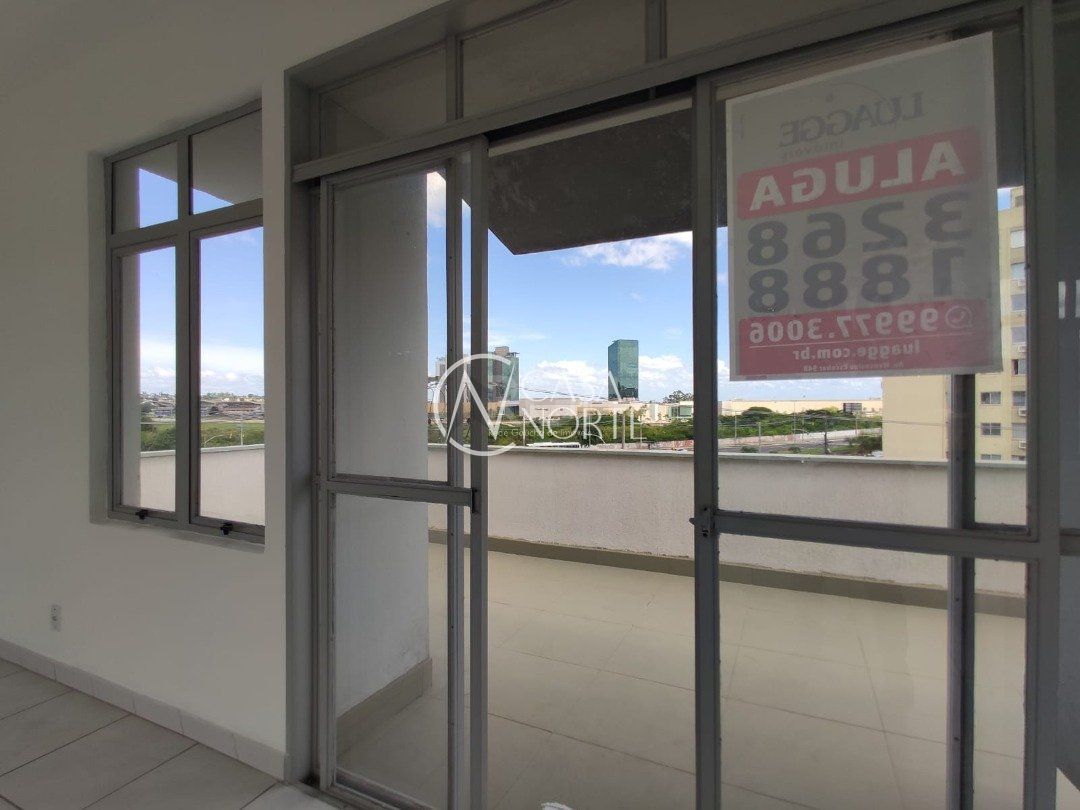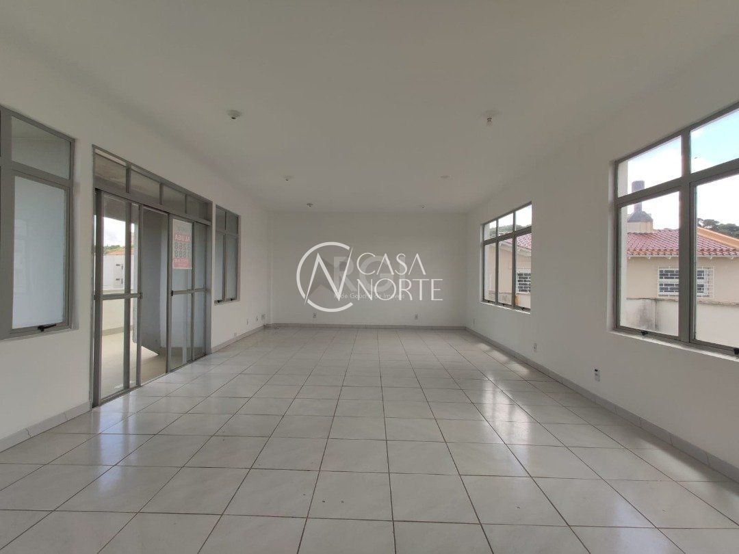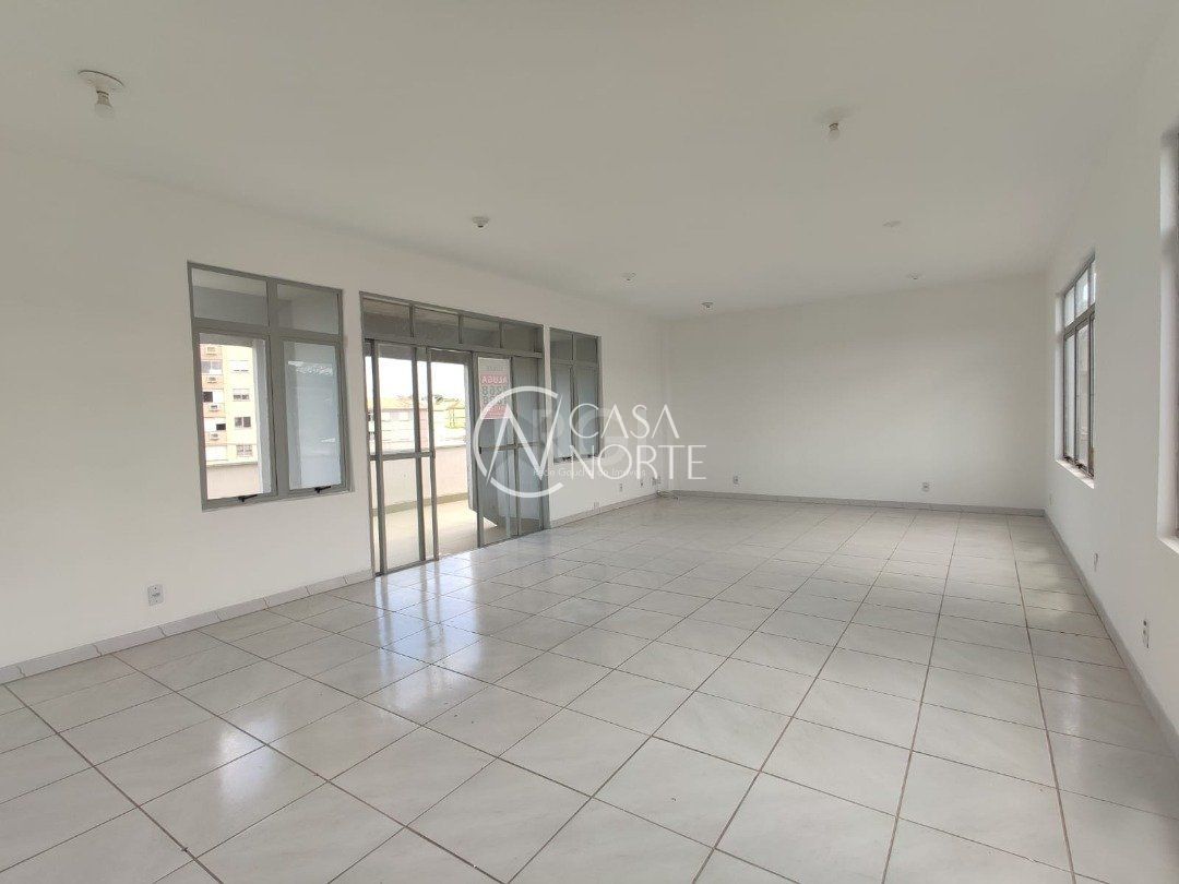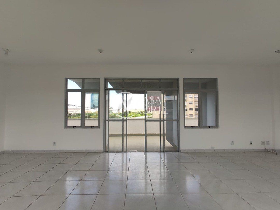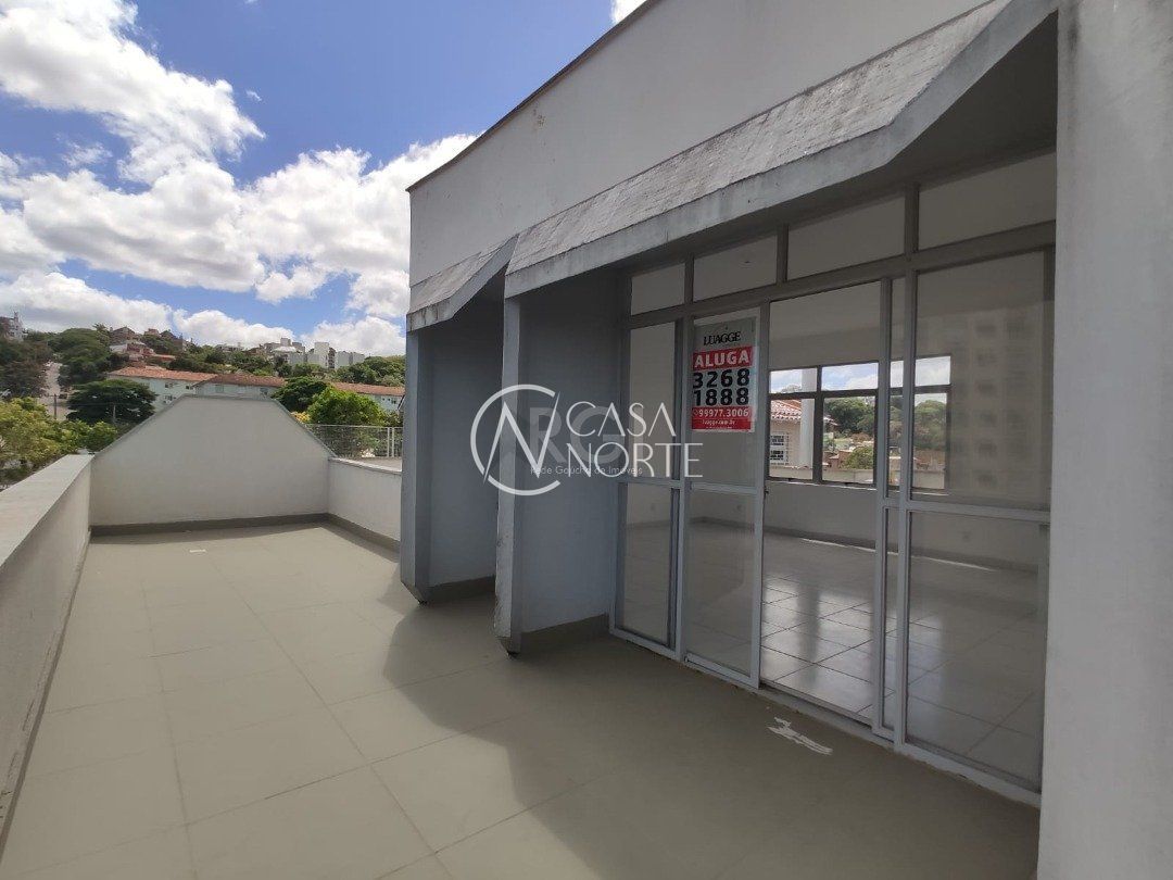 Ampla sala comercial com cerca de 97,47m² privativos, de frente, terceiro andar, com terraço, banheiro social e estacionamento em frente ao local.