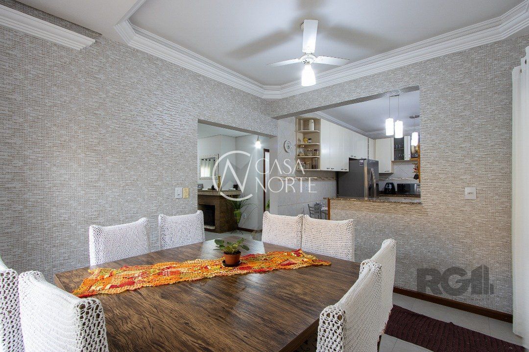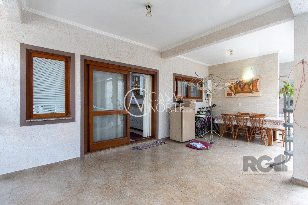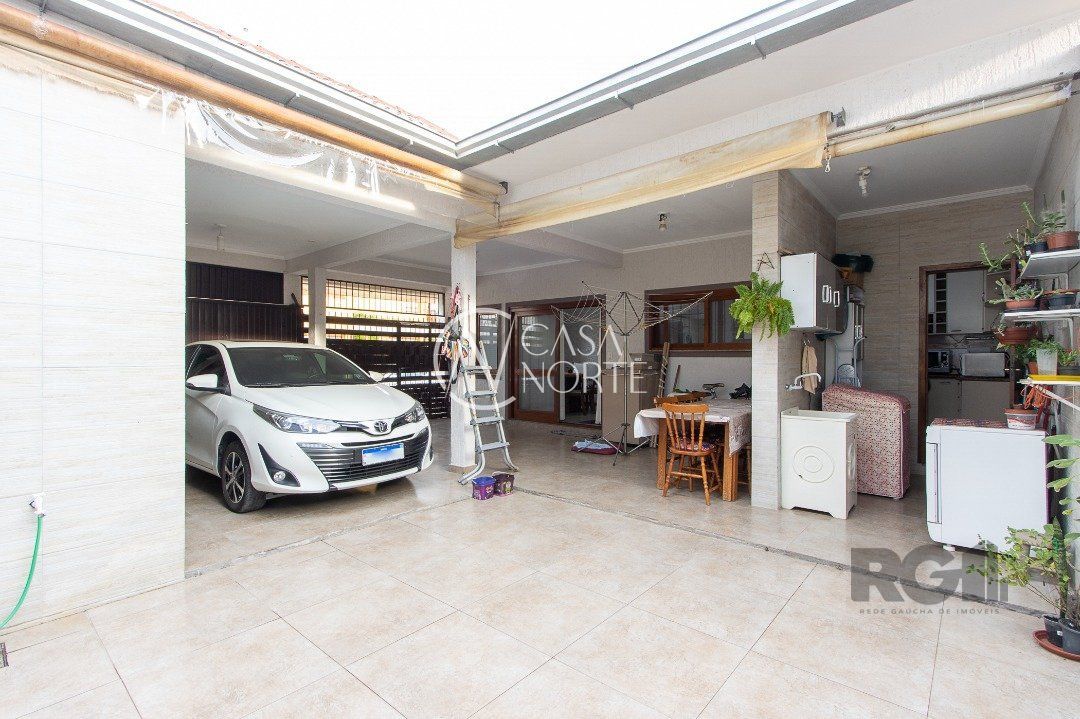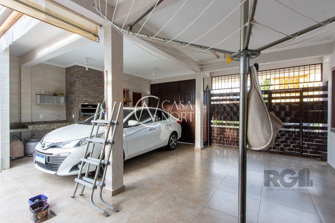 Sala ampla com lareira e ao lado lavabo, sala de jantar e cozinha com móveis planejados. todas ambientes com arcondicionado. Área de serviço, com acesso ao pátio e a garagem para 3 carros, sendo duas cobertas com os carros lado a lado, onde fica a churrasqueira com banheiro completo. A garagem tem dois portões, ambos eletrônicos.