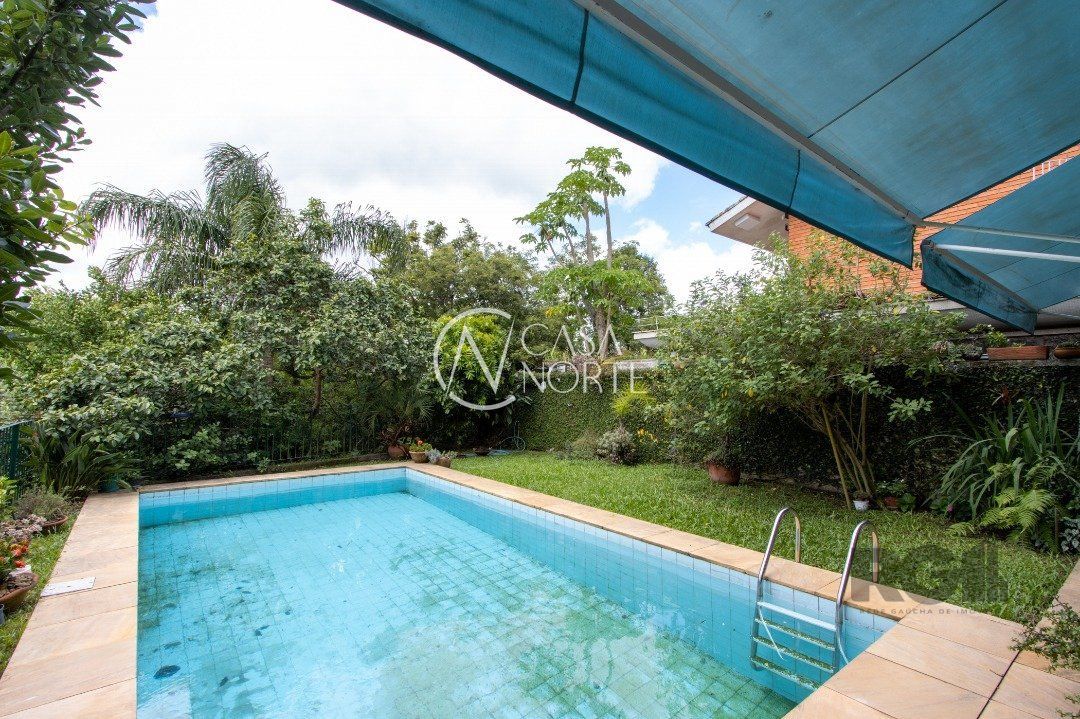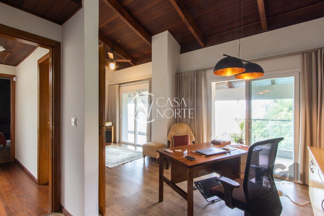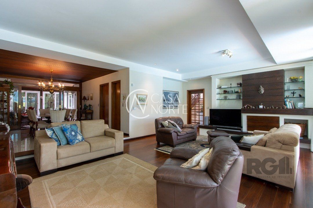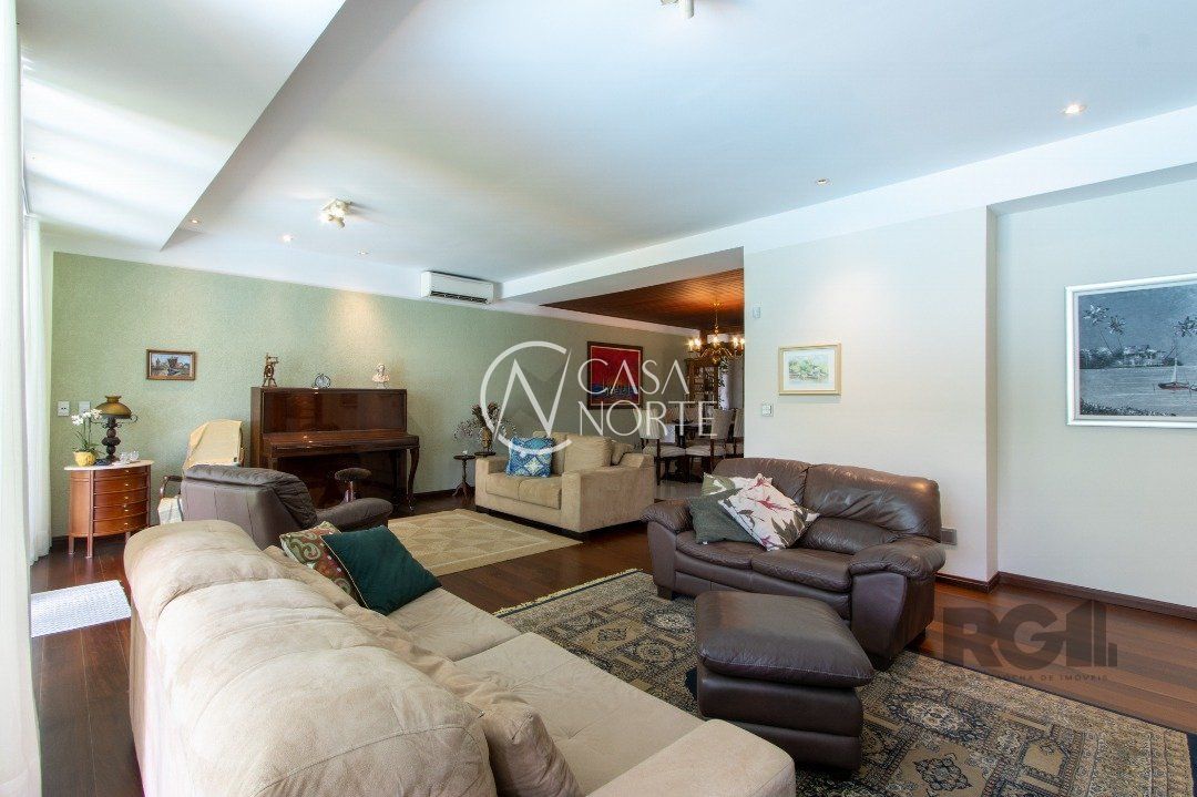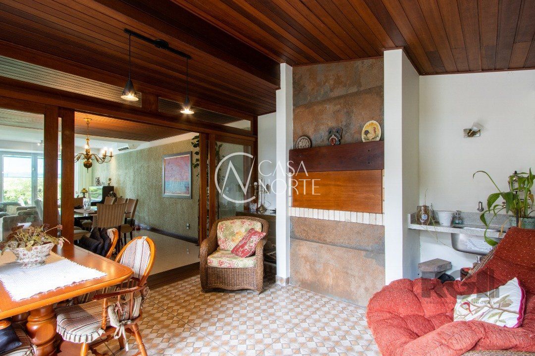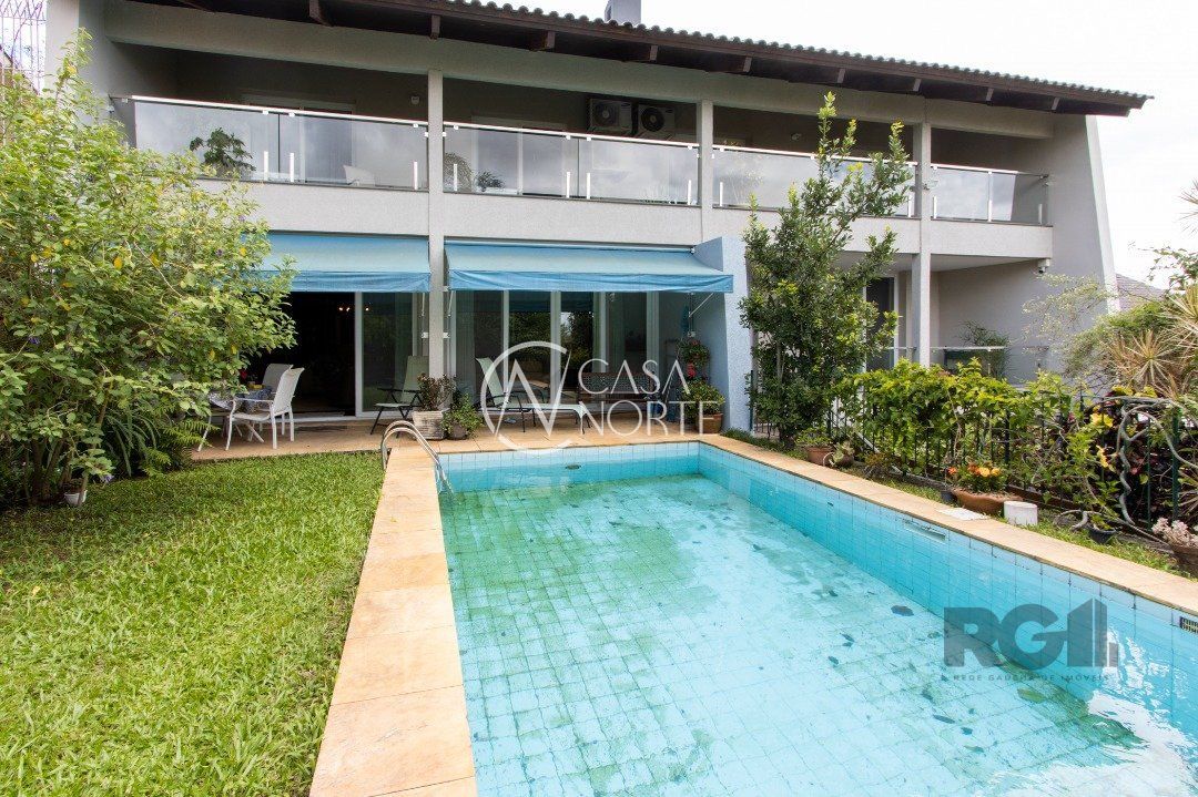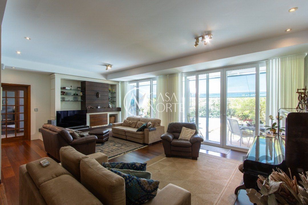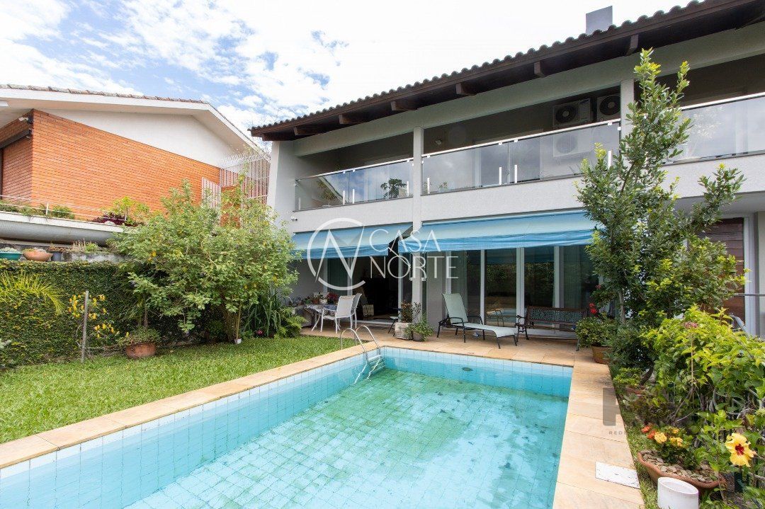 Impecável sobrado com bela vista para o Rio, 3 dormitórios, 2 suítes, sendo uma com closet e banheira de hidromassagem, living 3 ambientes com lareira, gabinete, lavabo, sala de jantar, cozinha com móveis sob medida, espaço gourmet com churrasqueira e fogão à lenha, lavanderia, dependência de empregada completa, garagem coberta para 4 carros e pátio com piscina. Com 460 m² de área construída, em terreno com 569 m².