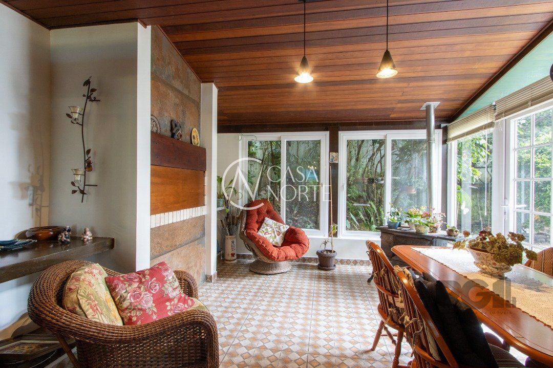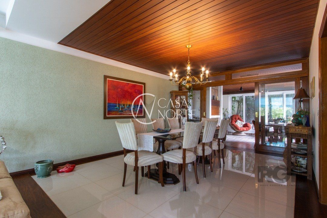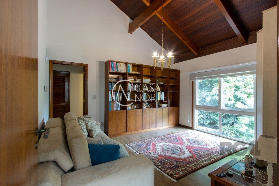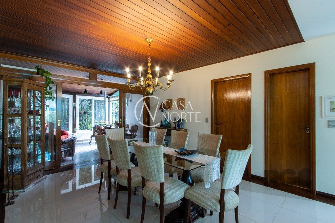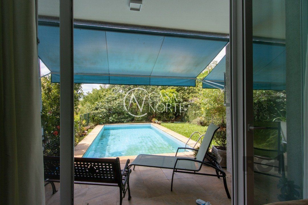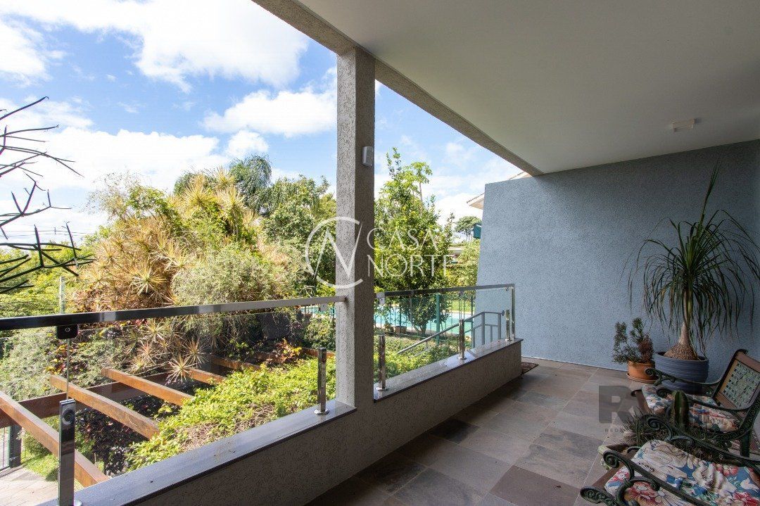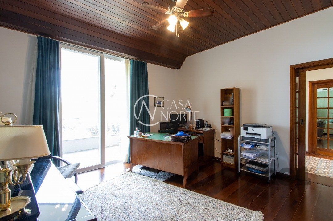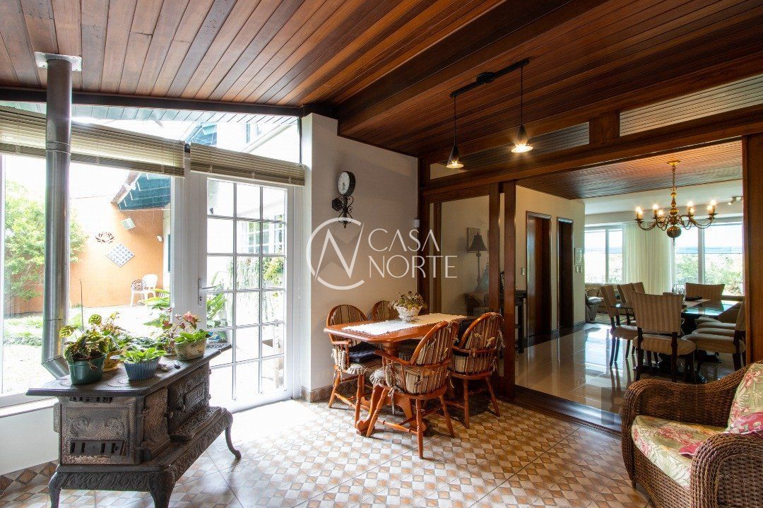 Impecável sobrado com bela vista para o Rio, 3 dormitórios, 2 suítes, sendo uma com closet e banheira de hidromassagem, living 3 ambientes com lareira, gabinete, lavabo, sala de jantar, cozinha com móveis sob medida, espaço gourmet com churrasqueira e fogão à lenha, lavanderia, dependência de empregada completa, garagem coberta para 4 carros e pátio com piscina. Com 460 m² de área construída, em terreno com 569 m².