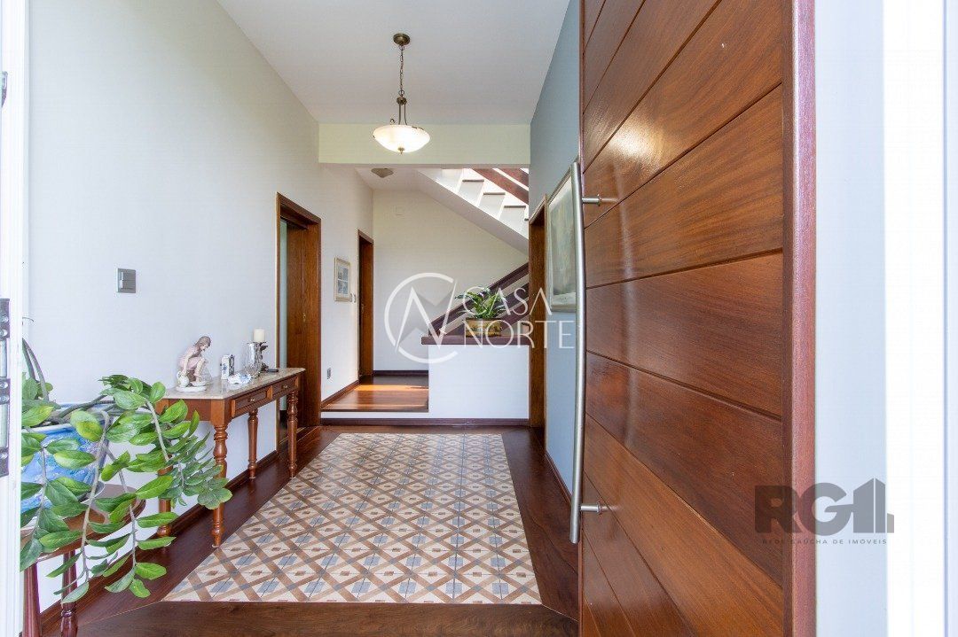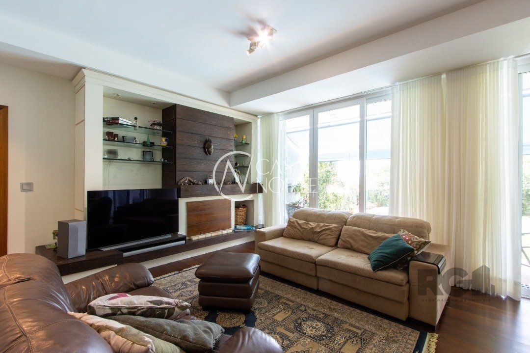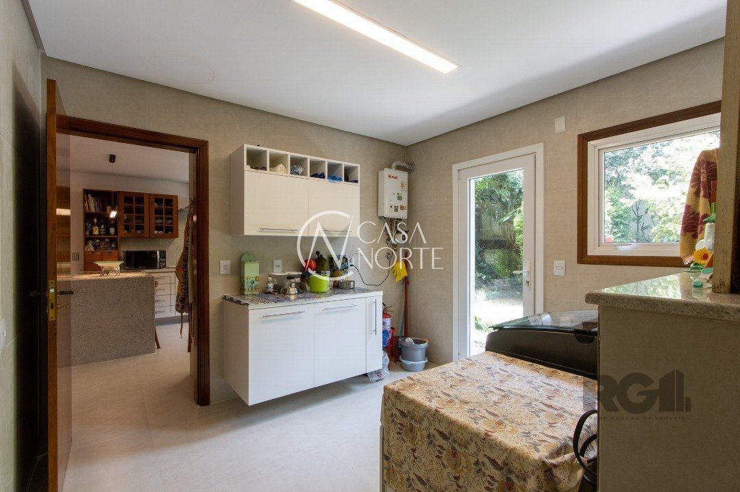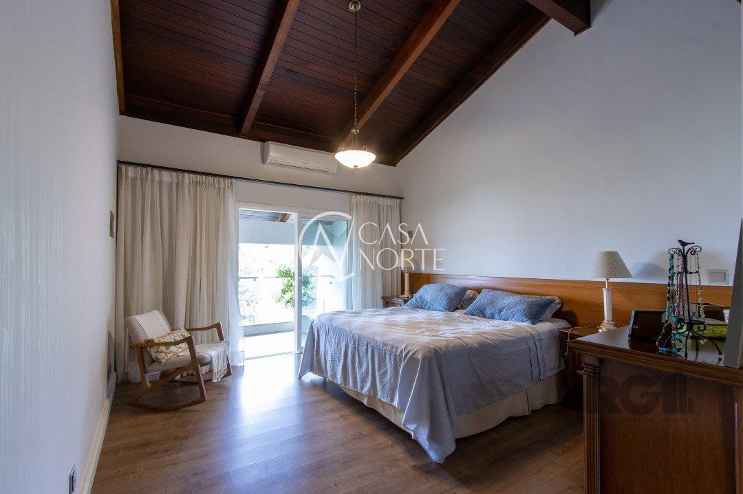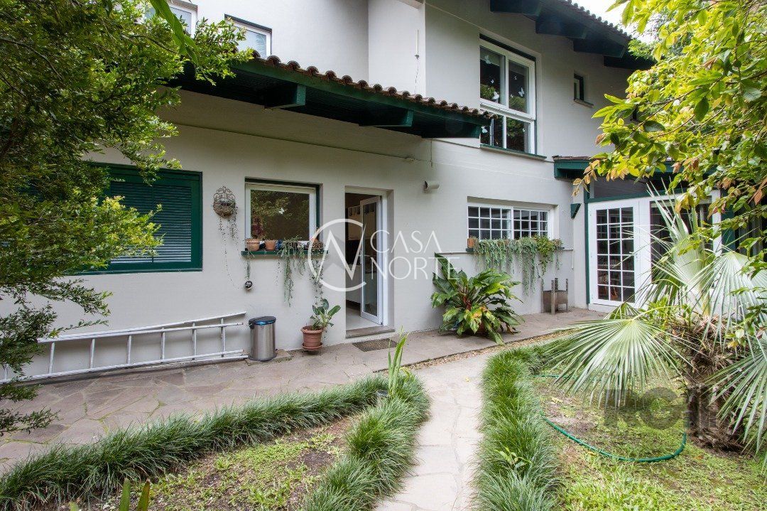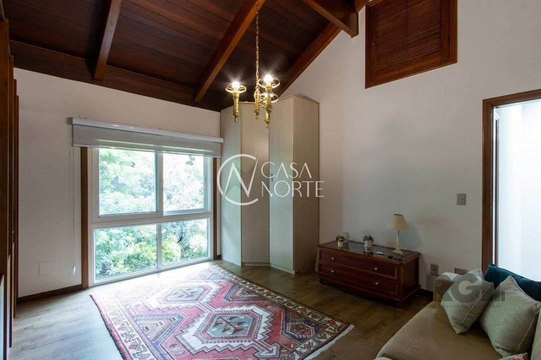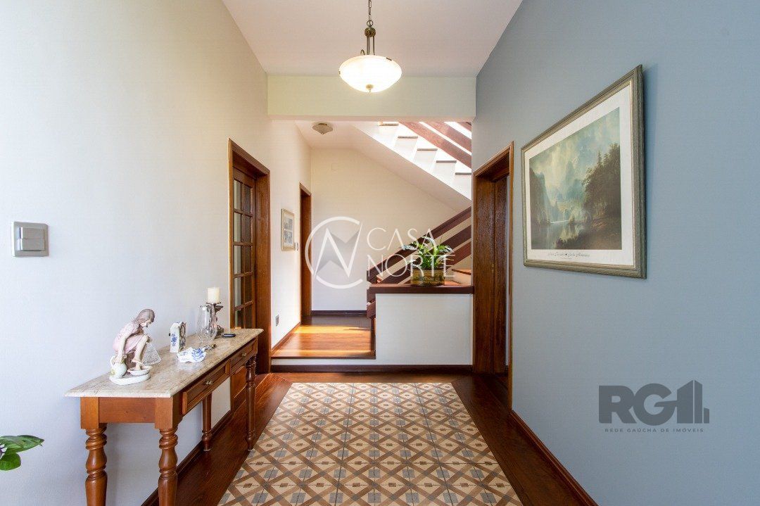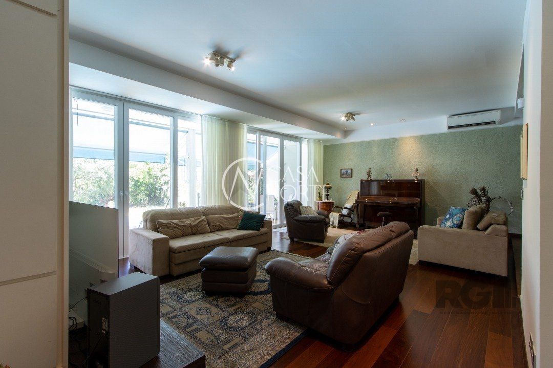 Impecável sobrado com bela vista para o Rio, 3 dormitórios, 2 suítes, sendo uma com closet e banheira de hidromassagem, living 3 ambientes com lareira, gabinete, lavabo, sala de jantar, cozinha com móveis sob medida, espaço gourmet com churrasqueira e fogão à lenha, lavanderia, dependência de empregada completa, garagem coberta para 4 carros e pátio com piscina. Com 460 m² de área construída, em terreno com 569 m².