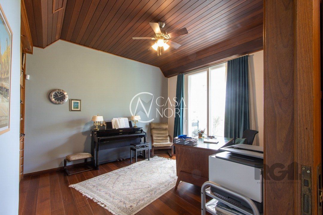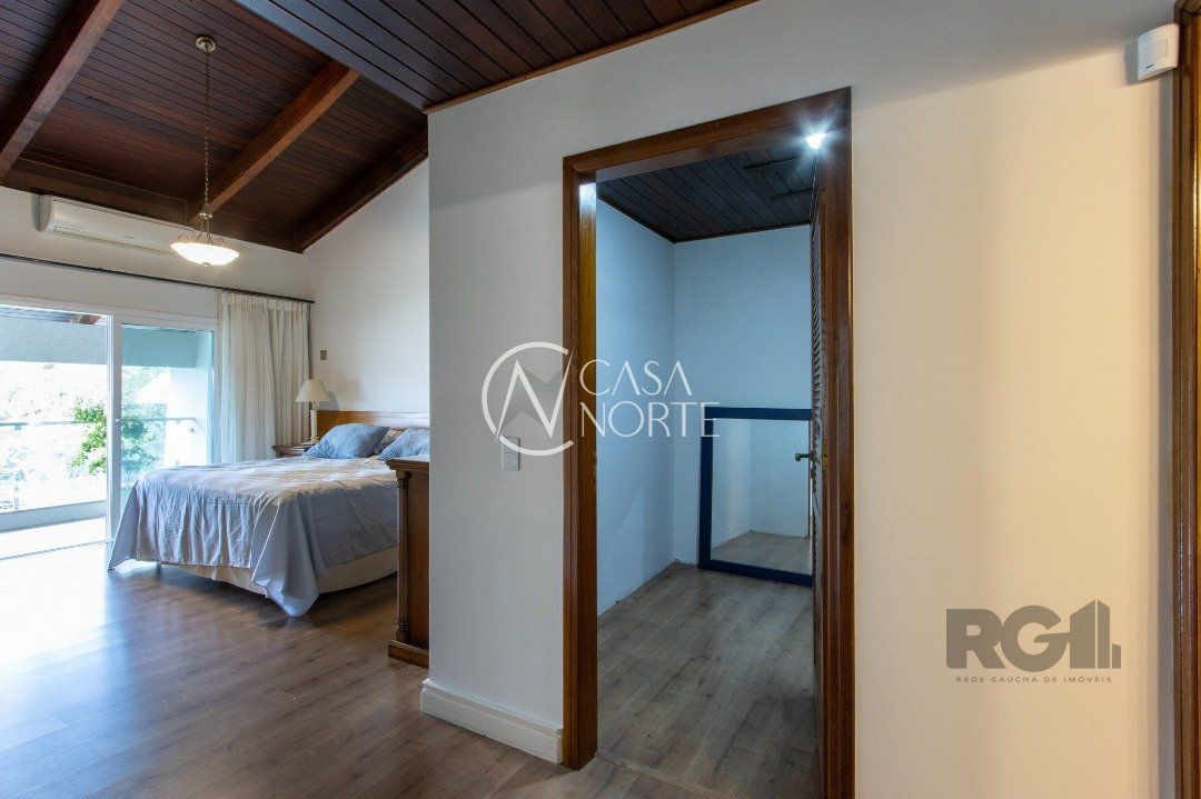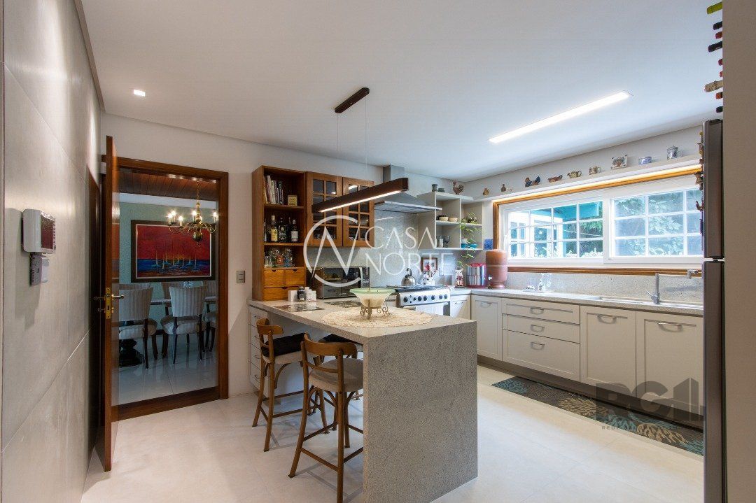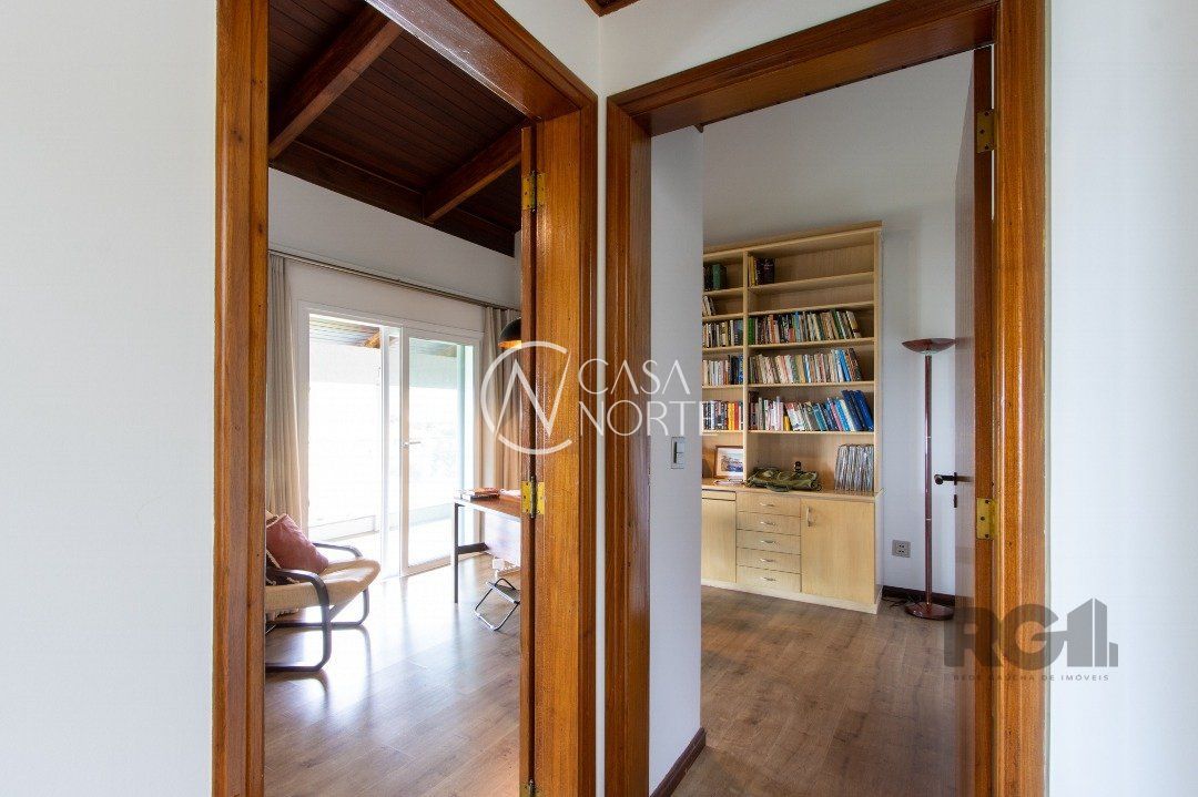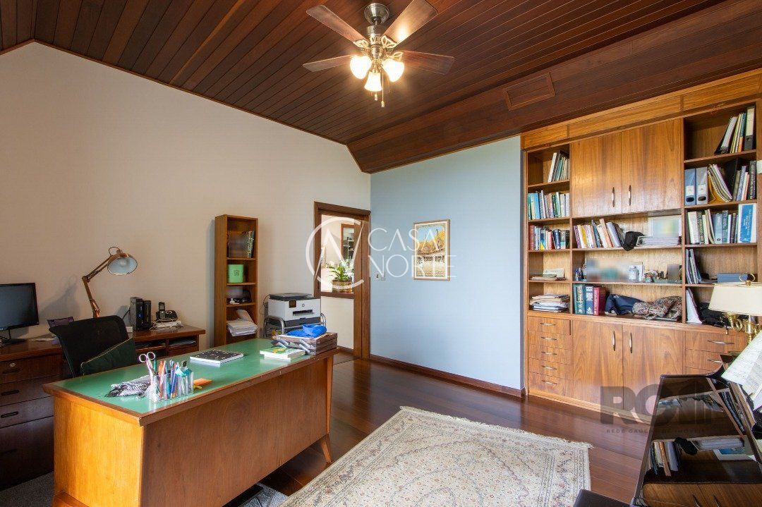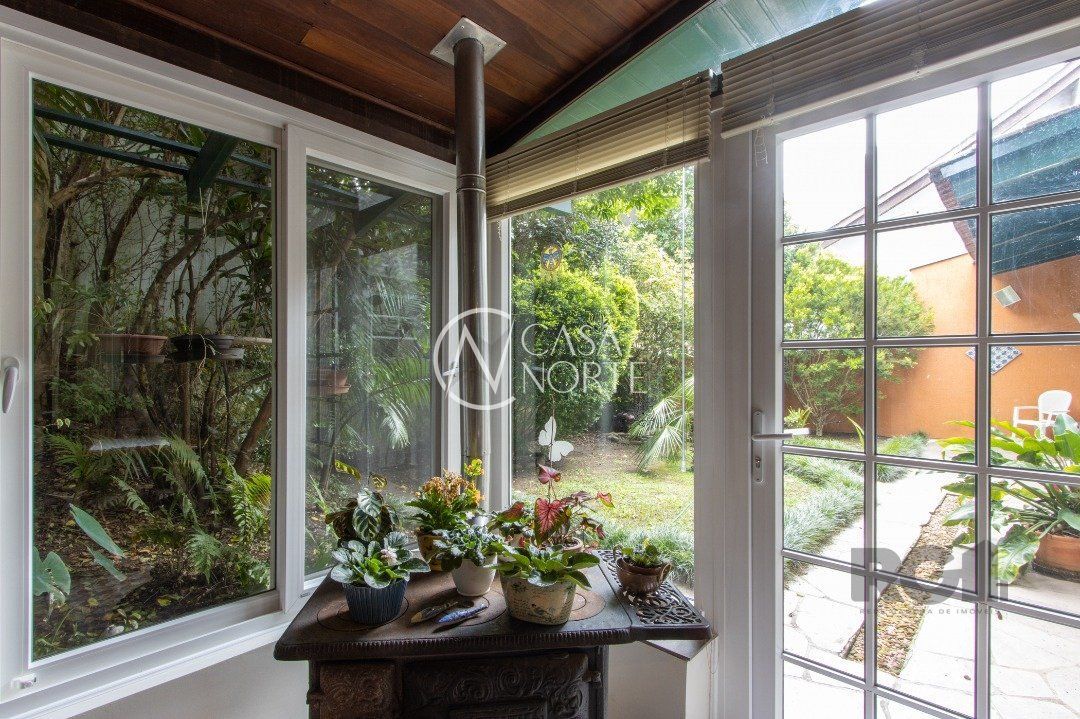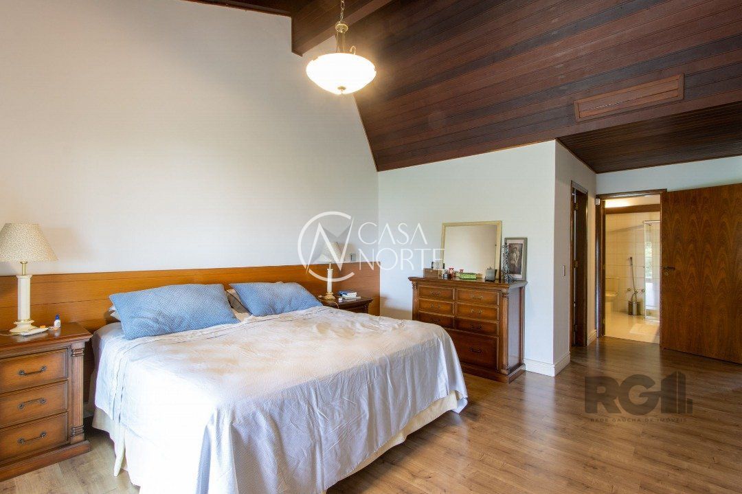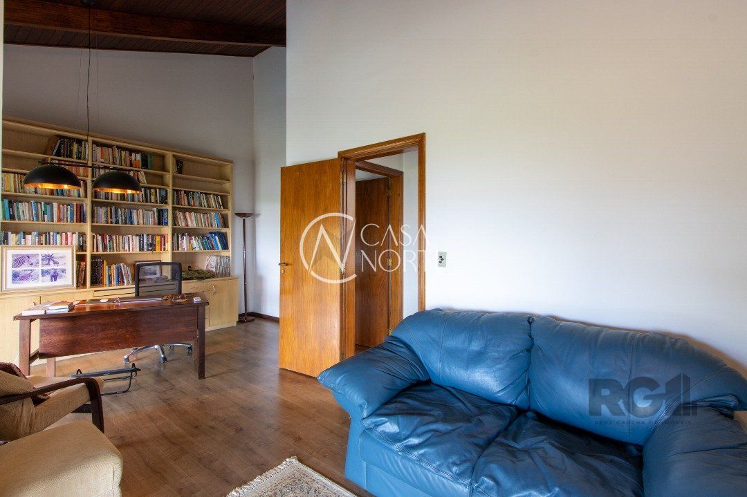 Impecável sobrado com bela vista para o Rio, 3 dormitórios, 2 suítes, sendo uma com closet e banheira de hidromassagem, living 3 ambientes com lareira, gabinete, lavabo, sala de jantar, cozinha com móveis sob medida, espaço gourmet com churrasqueira e fogão à lenha, lavanderia, dependência de empregada completa, garagem coberta para 4 carros e pátio com piscina. Com 460 m² de área construída, em terreno com 569 m².