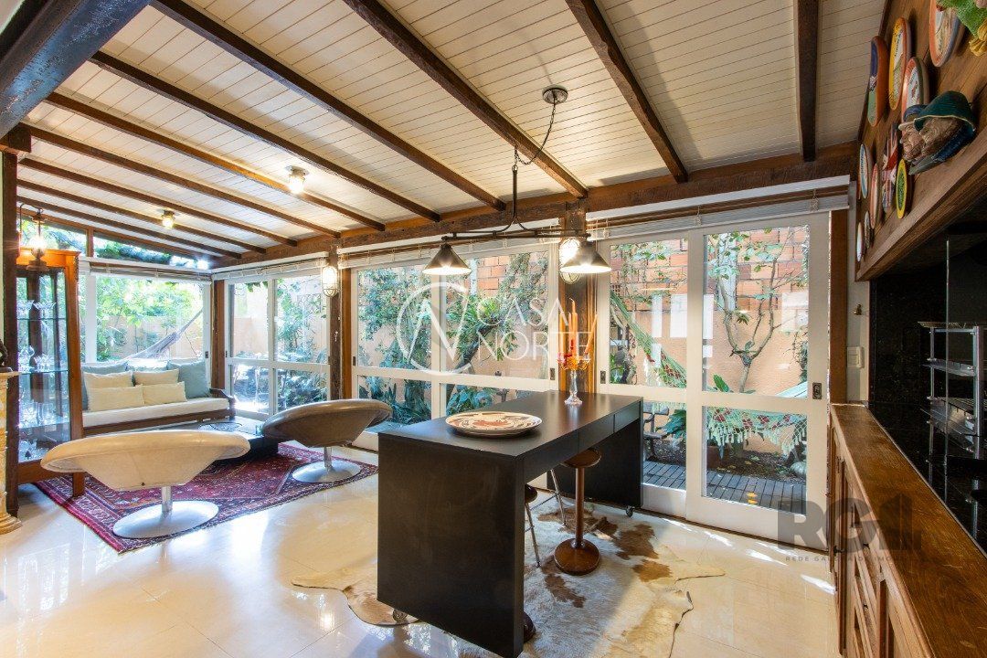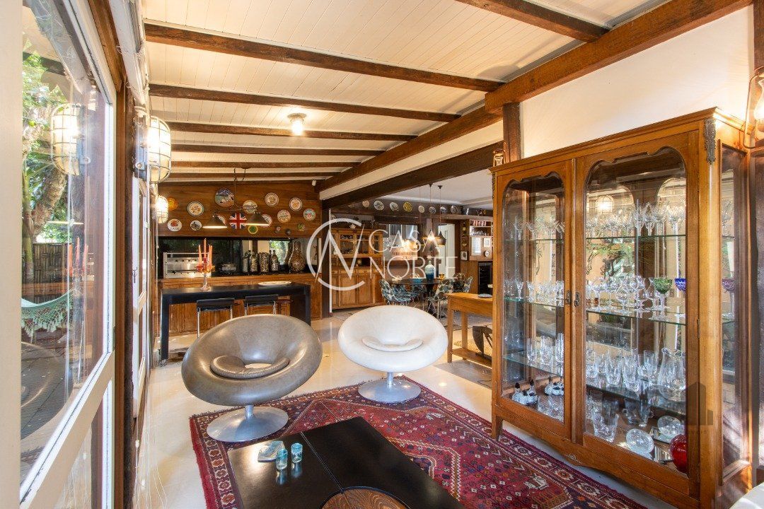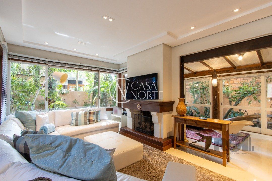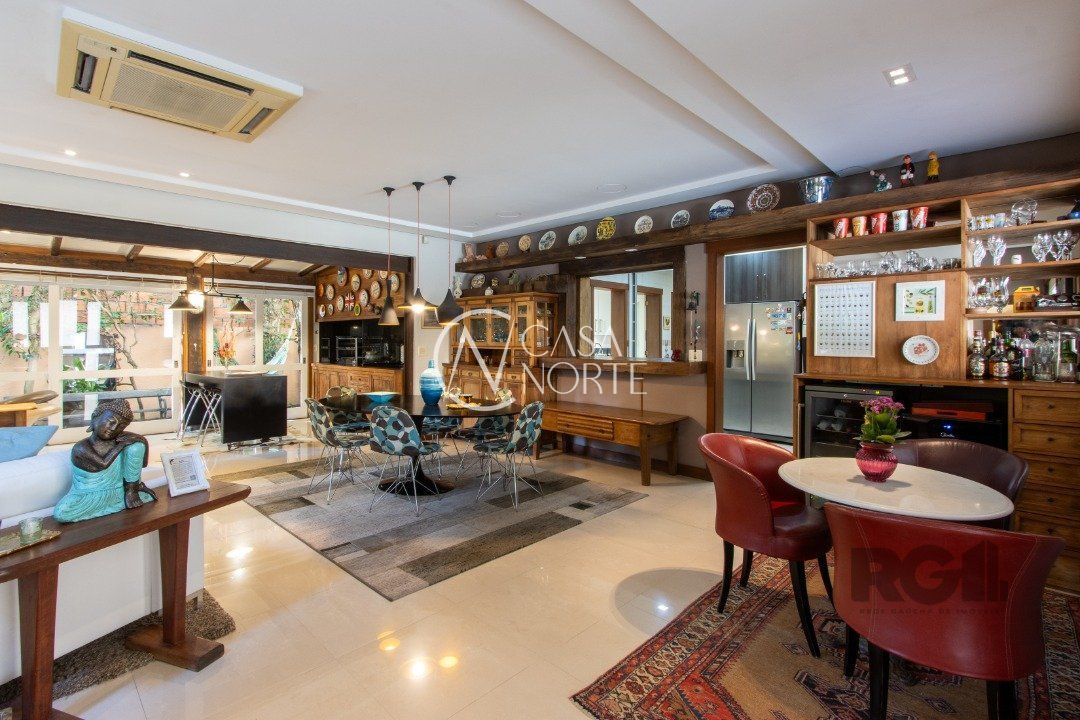 Living amplo distribuífo em 5 ambientes: Sala de Jantar, Estar com TV e Lareira, Espaço Gurmet com Churrasqueira e cook top, Espaço para Degustação de vinhos com 2 Adegas e Sala de Estar com aberturas para o Jardim. Garagem para 3 carros.
