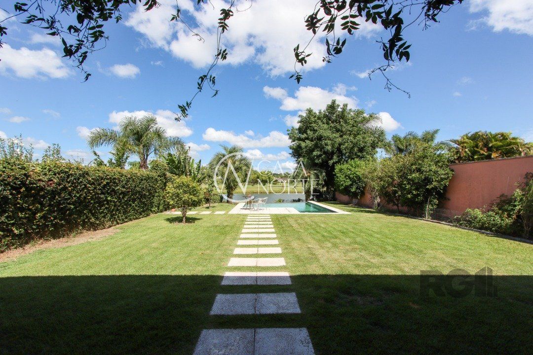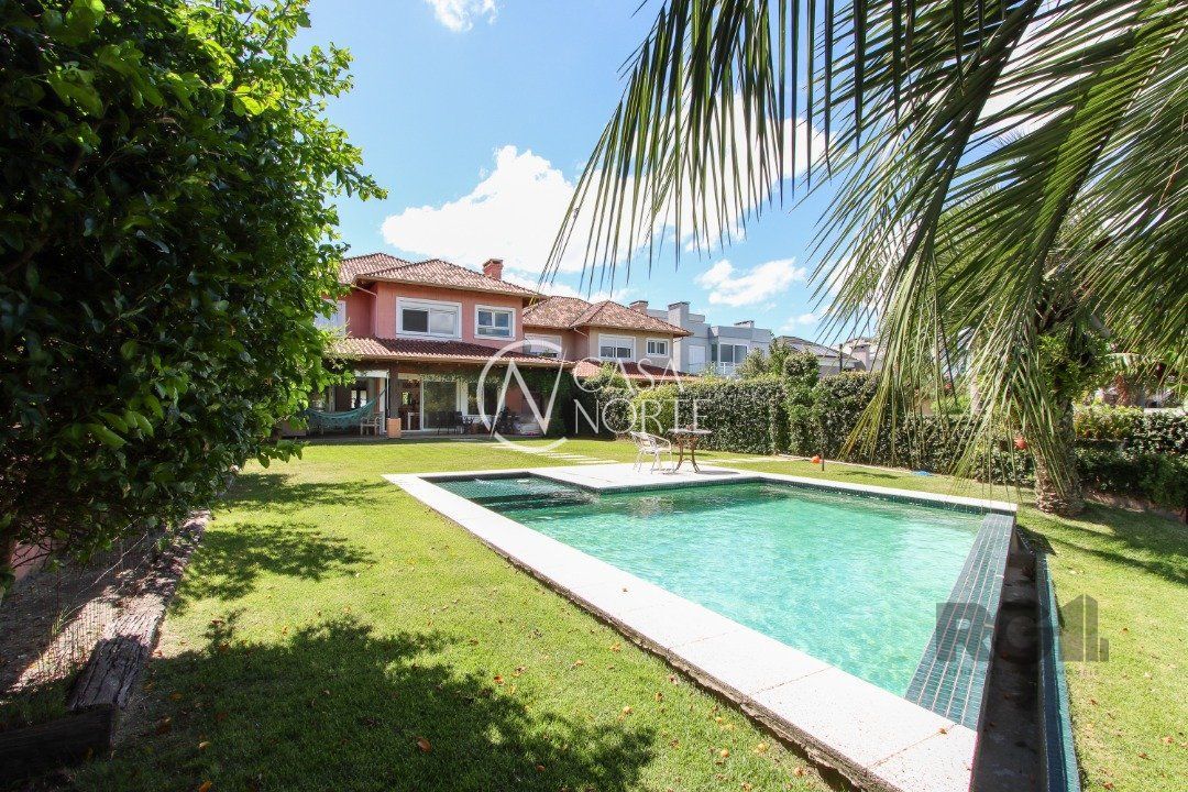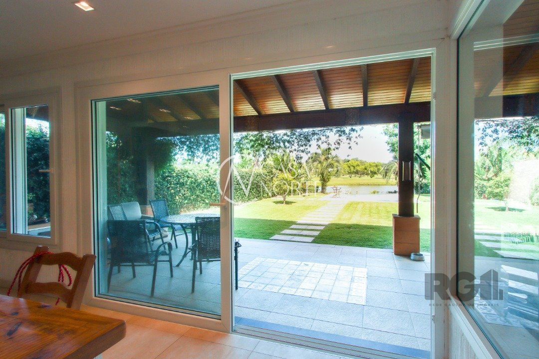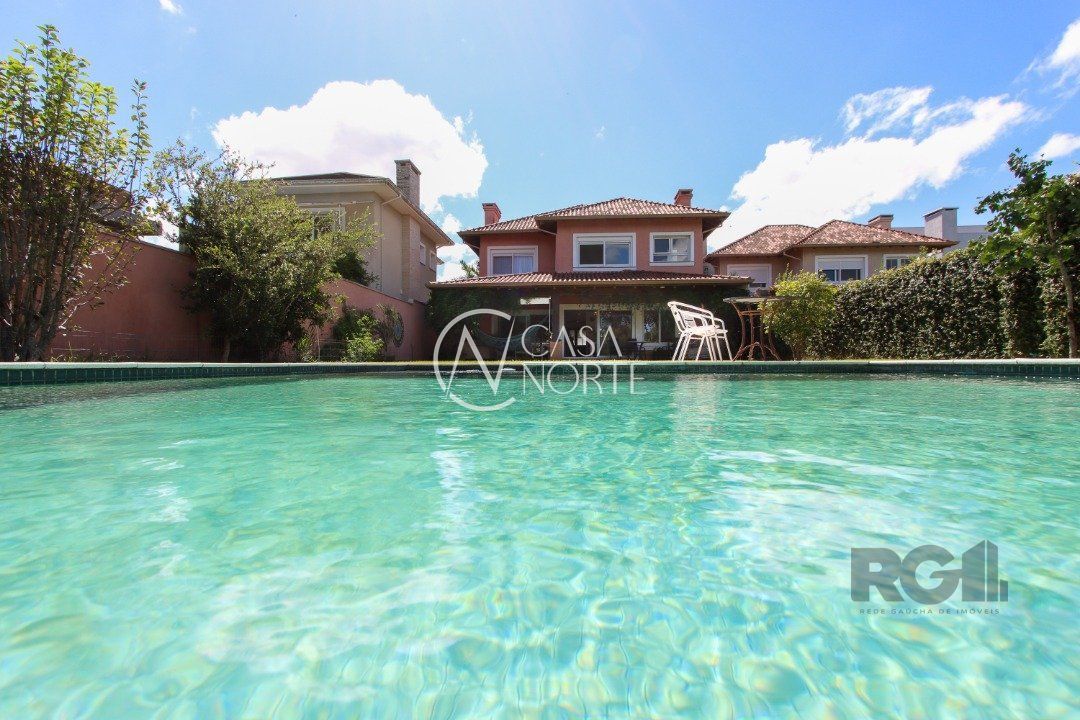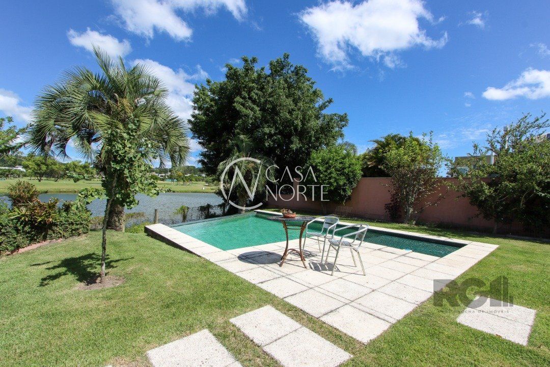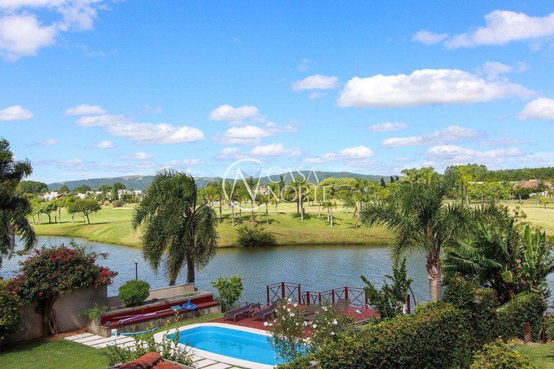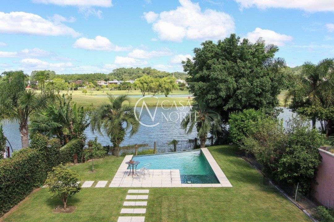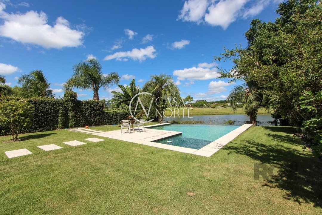 A área externa é um dos grandes destaques, com uma piscina de borda infinita à beira do lago, ideal para relaxar e apreciar a paisagem. Há também abrigo para quatro carros.