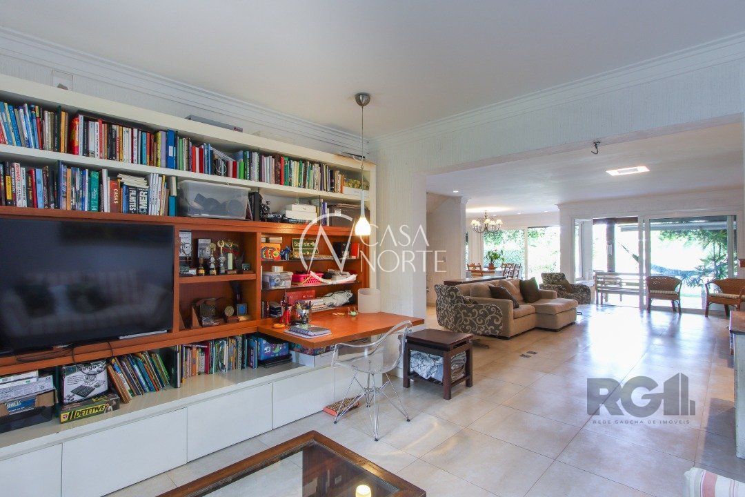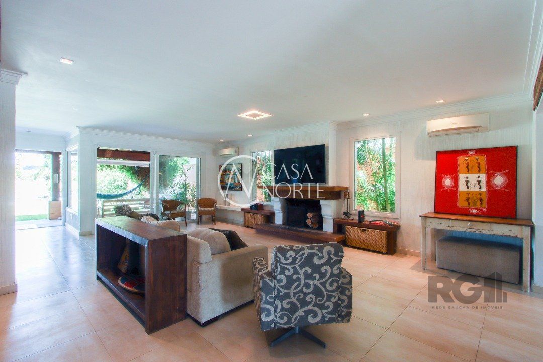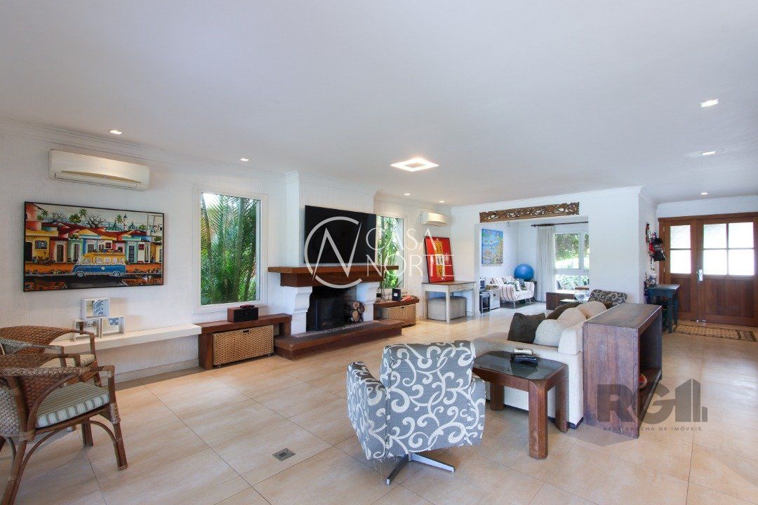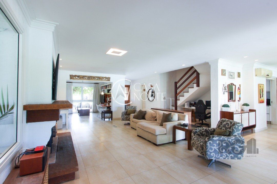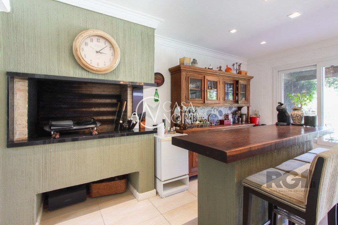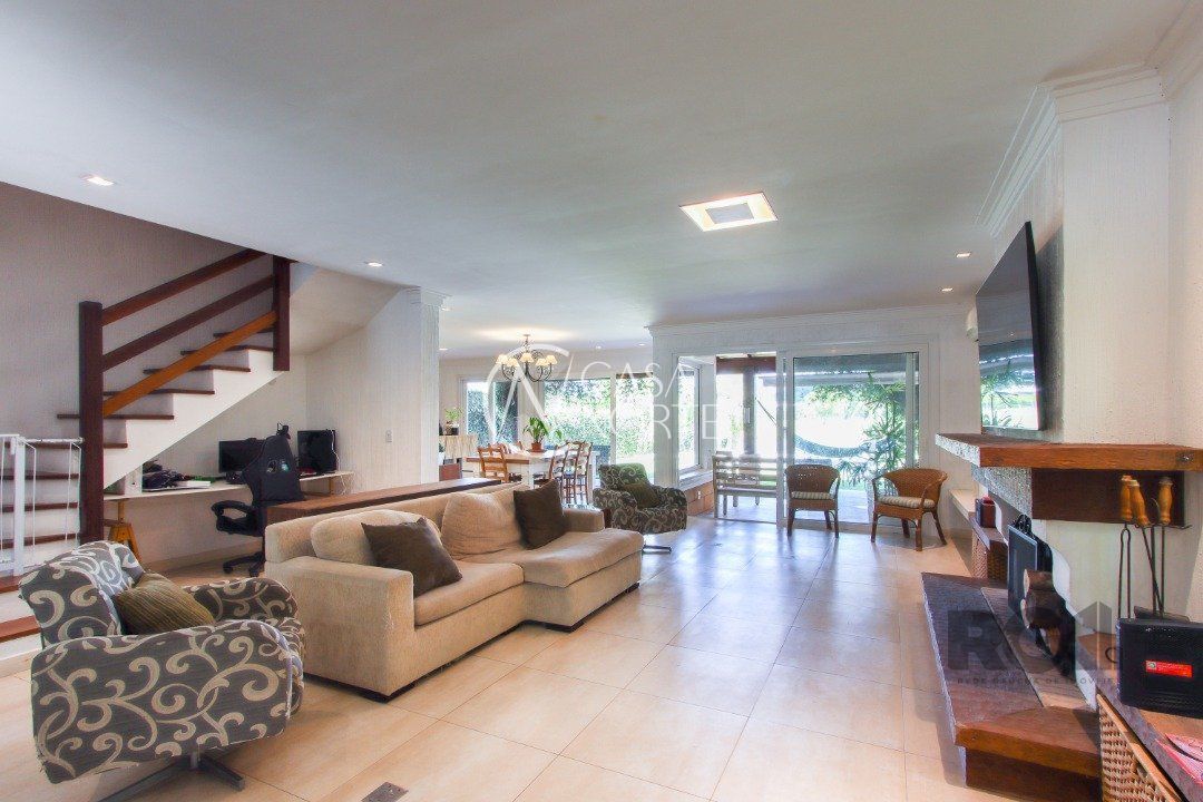 No térreo, encontram-se um lavabo, um espaço para gabinete, um living com dois ambientes integrados à lareira e à churrasqueira, cozinha, área de serviço e dependência completa.