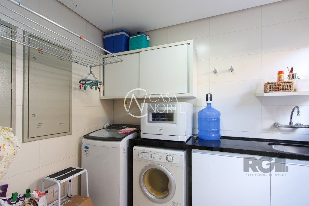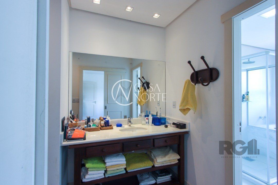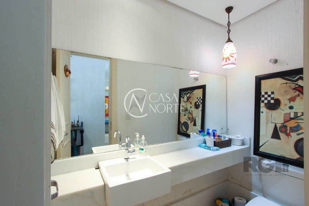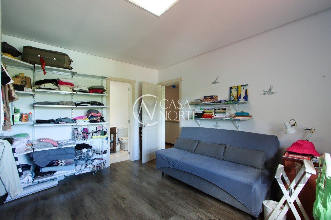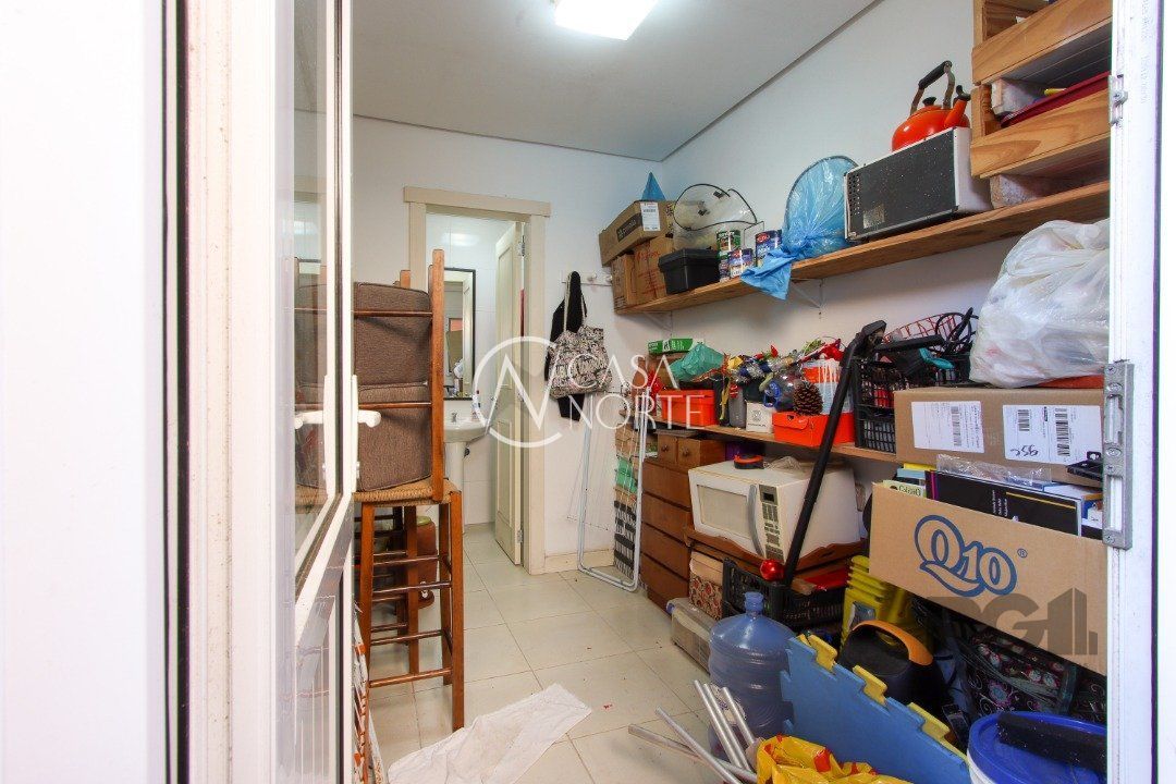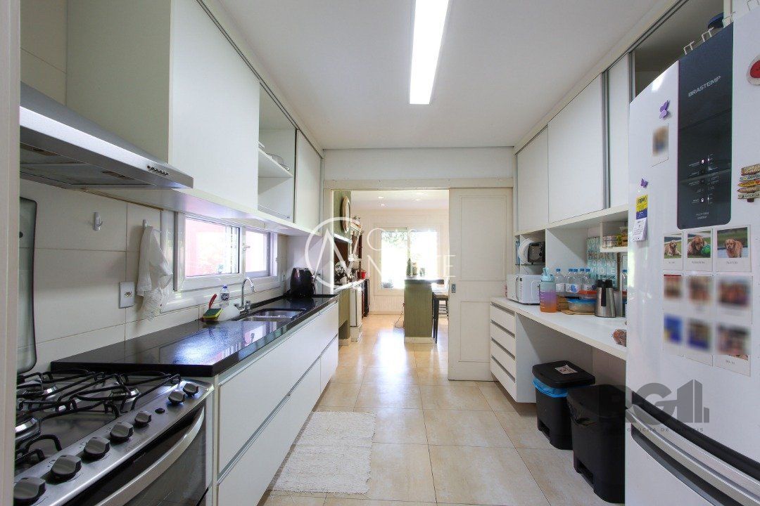 No térreo, encontram-se um lavabo, um espaço para gabinete, um living com dois ambientes integrados à lareira e à churrasqueira, cozinha, área de serviço e dependência completa.