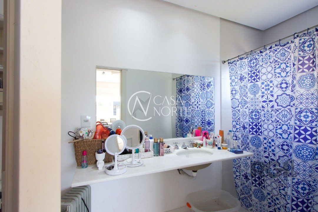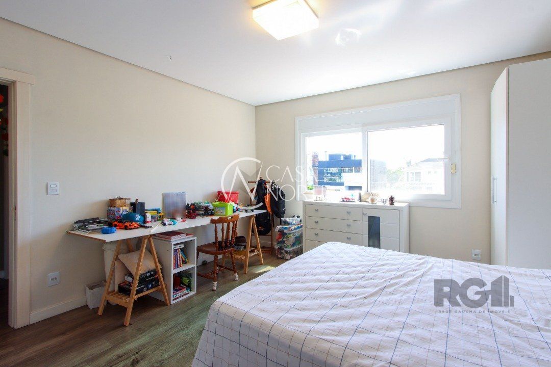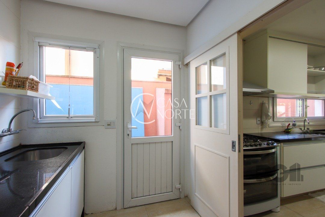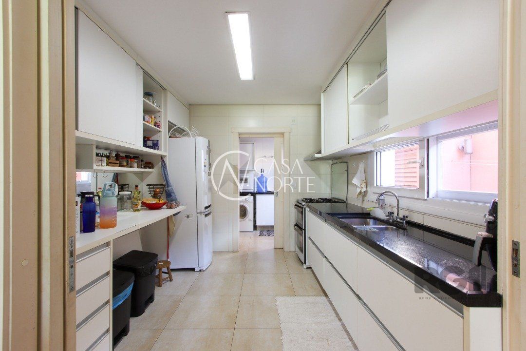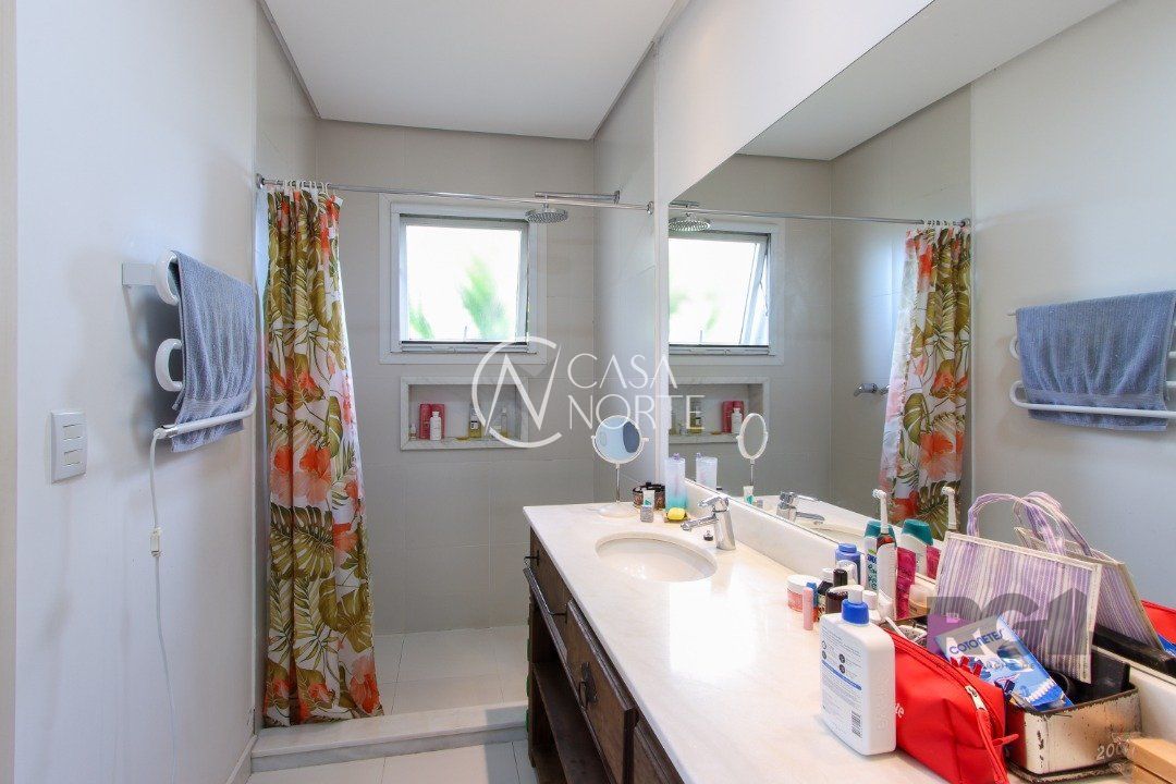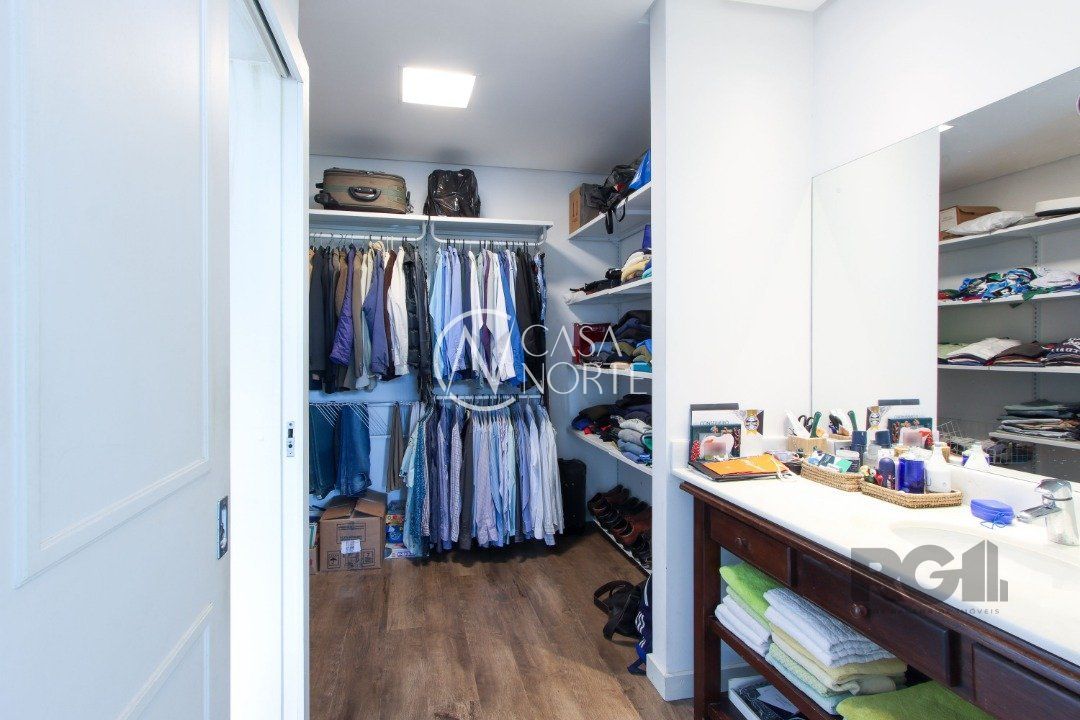 No térreo, encontram-se um lavabo, um espaço para gabinete, um living com dois ambientes integrados à lareira e à churrasqueira, cozinha, área de serviço e dependência completa.
