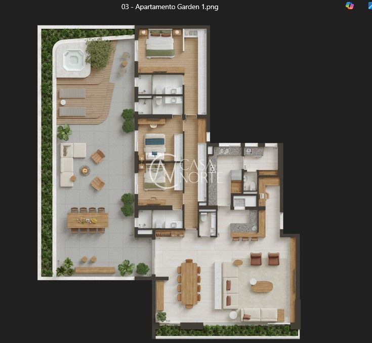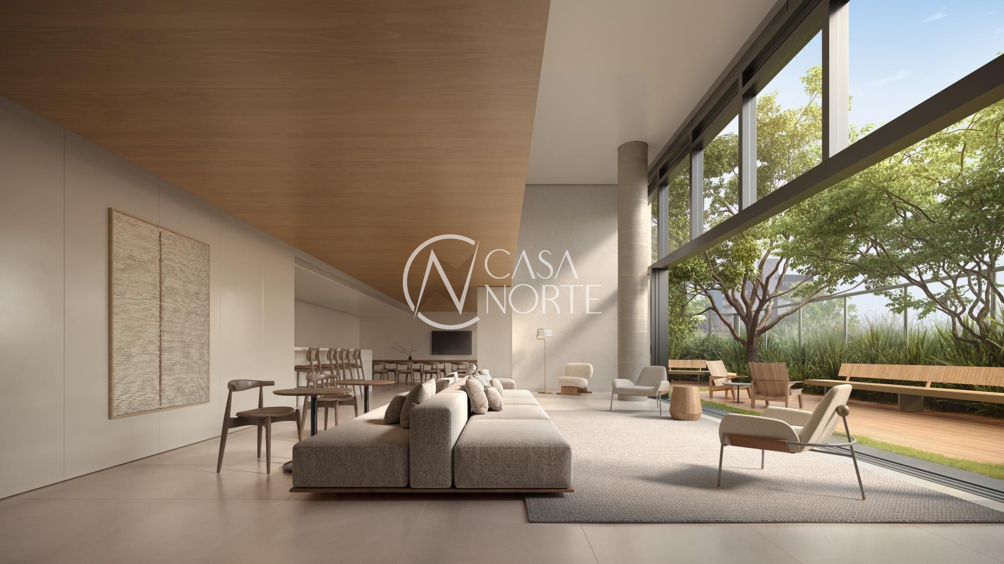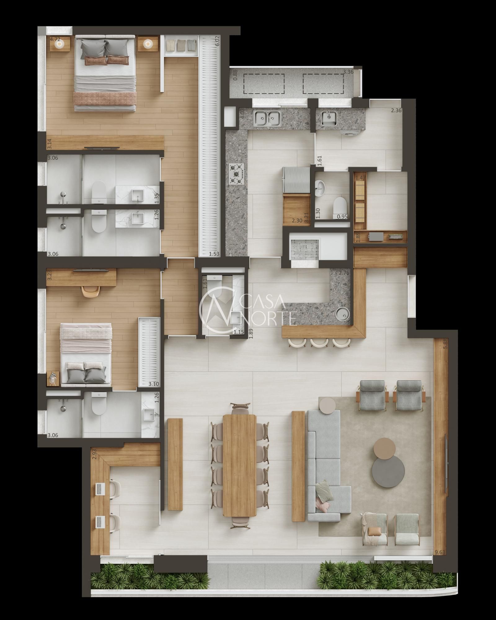 O movimento das sacadas nos diferentes pavimentos dá um toque especial a cada unidade, conferindo individualidade. As floreiras são estrategicamente posicionadas rente ao piso, criando a sensação de jardins contínuos que integram a natureza ao interior.O amplo salão possui grandes aberturas que se