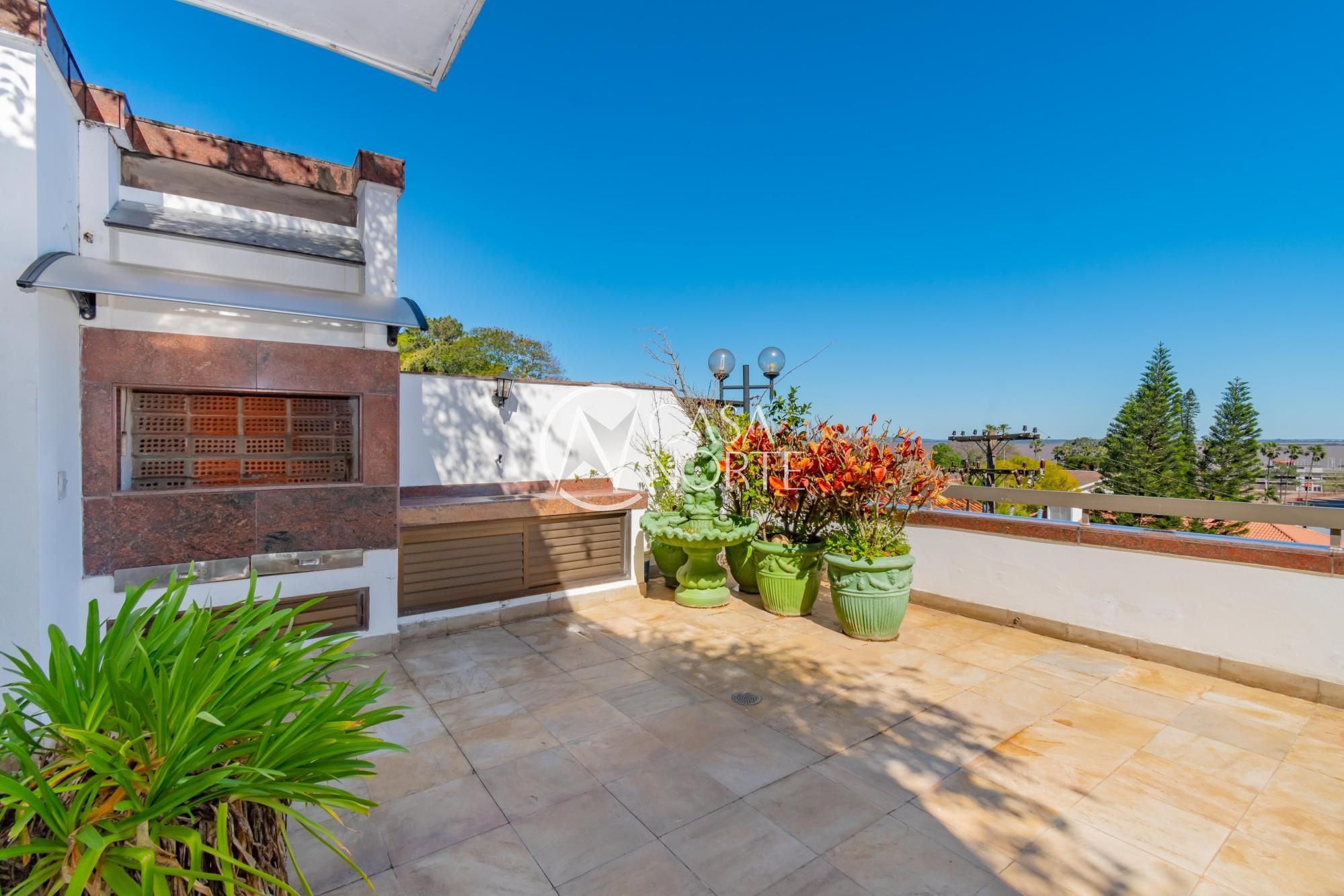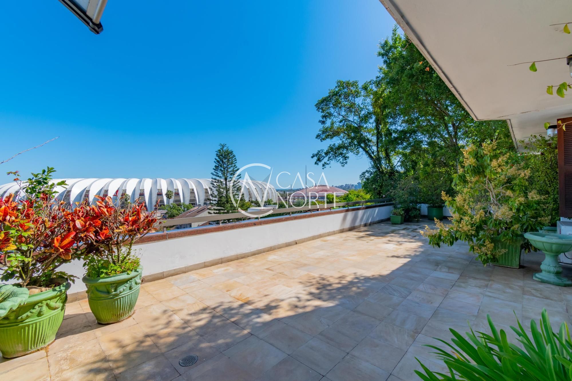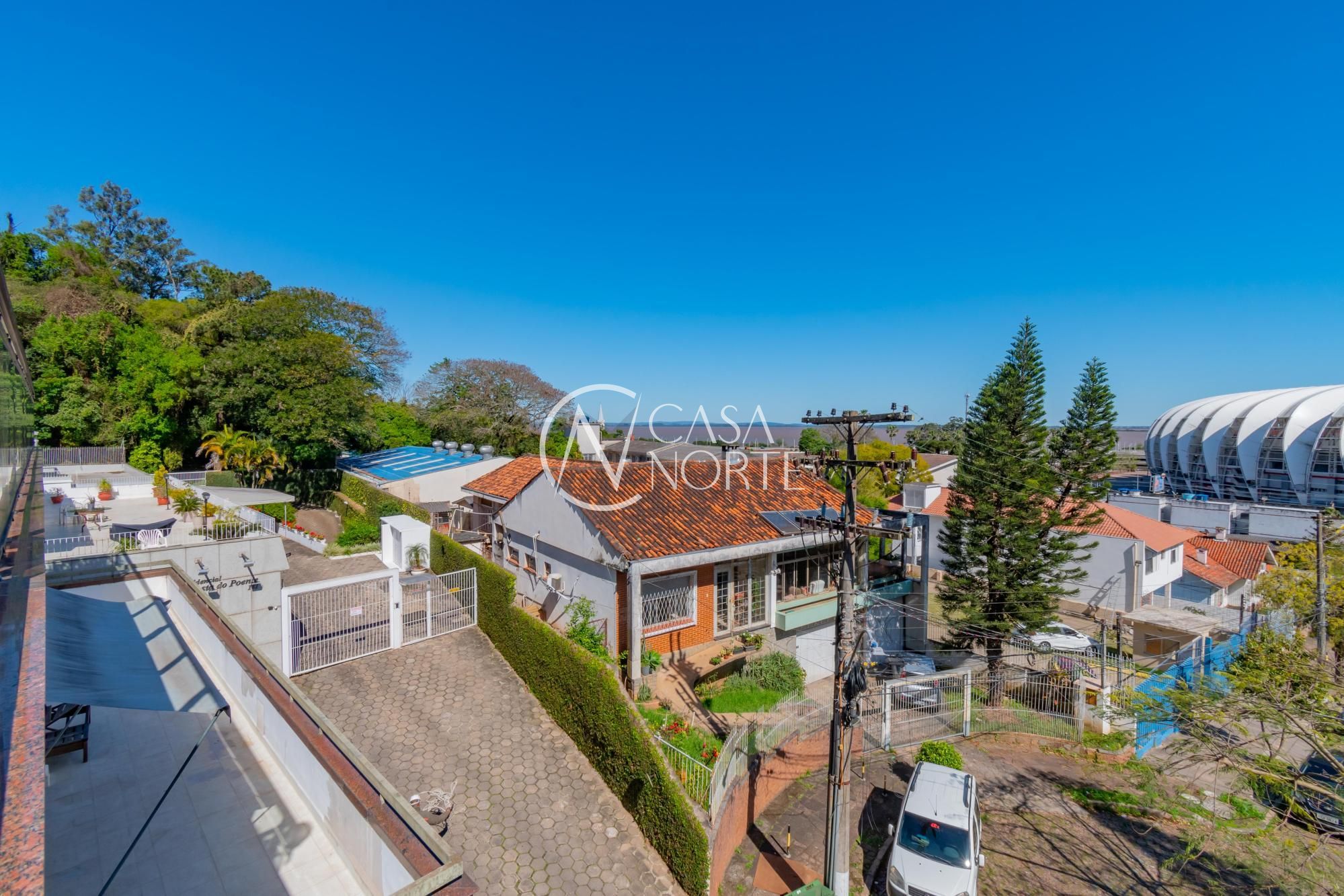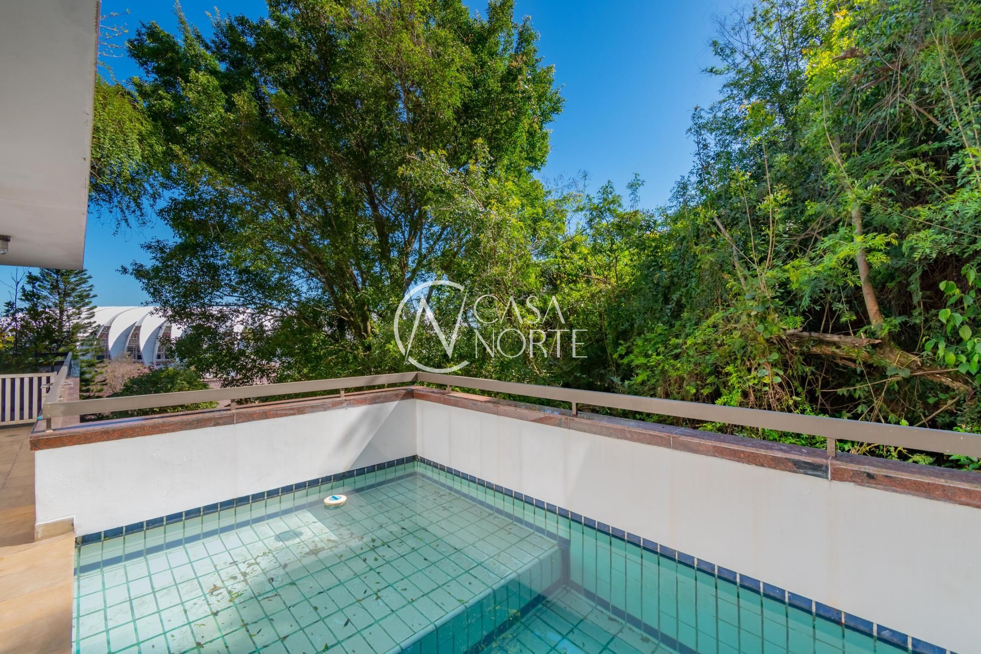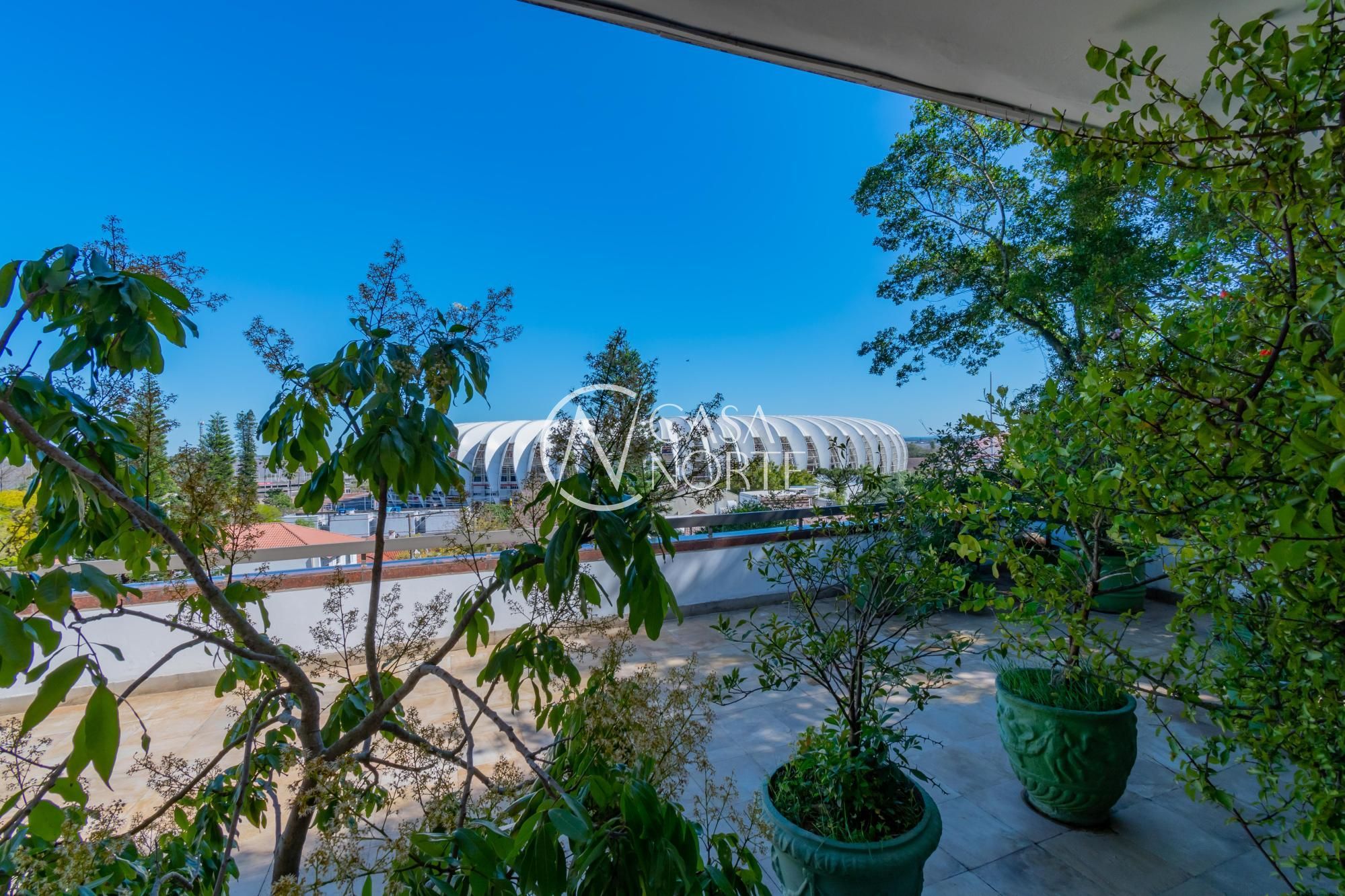 Um terraço de 80m², com piscina e vista para o Estádio Beira Rio e rio Guaíba.