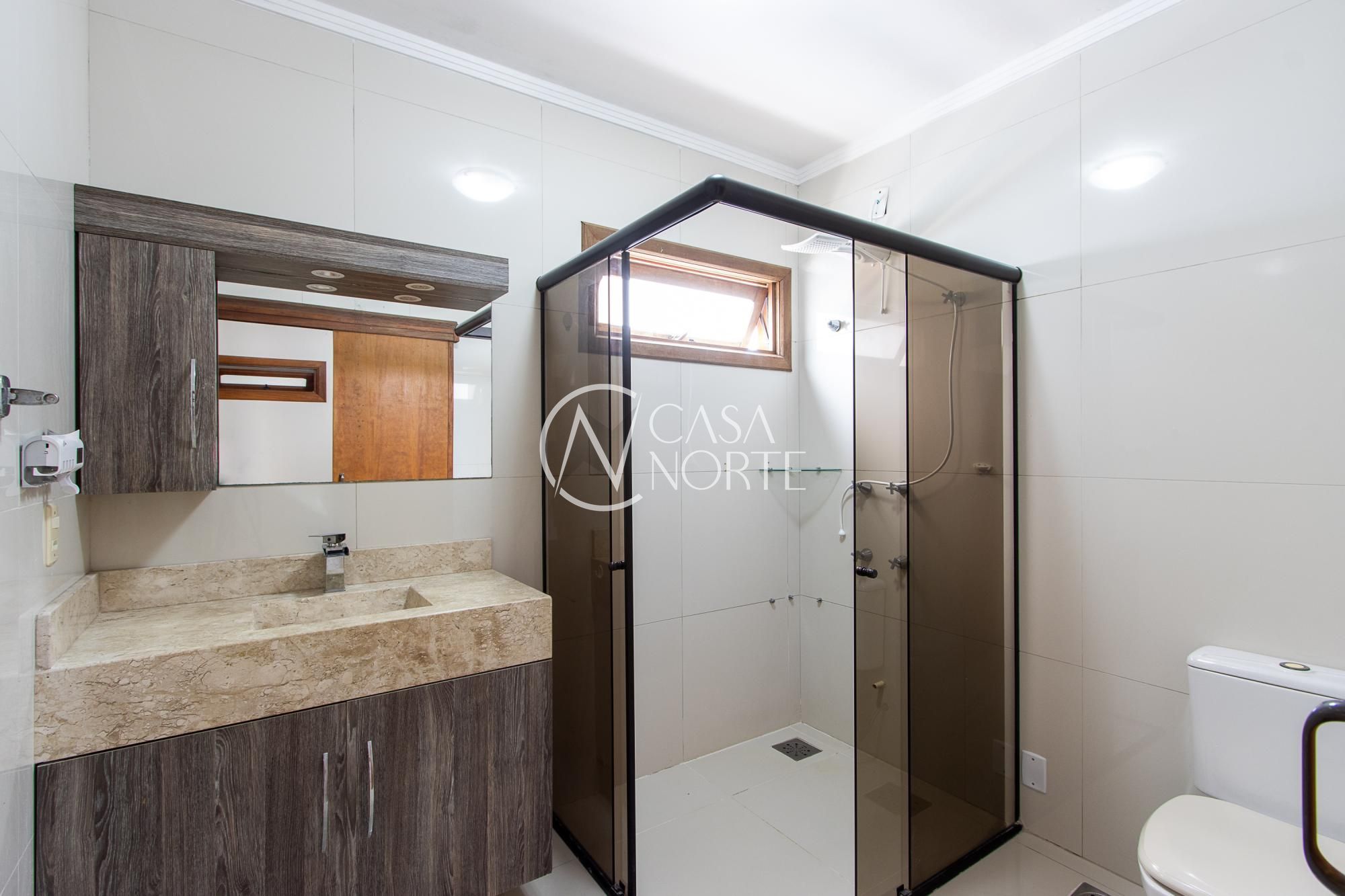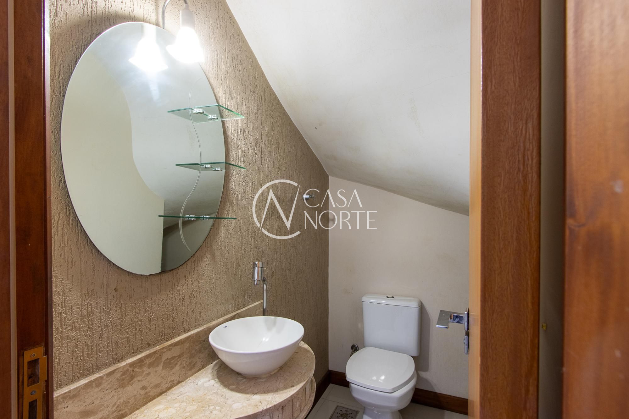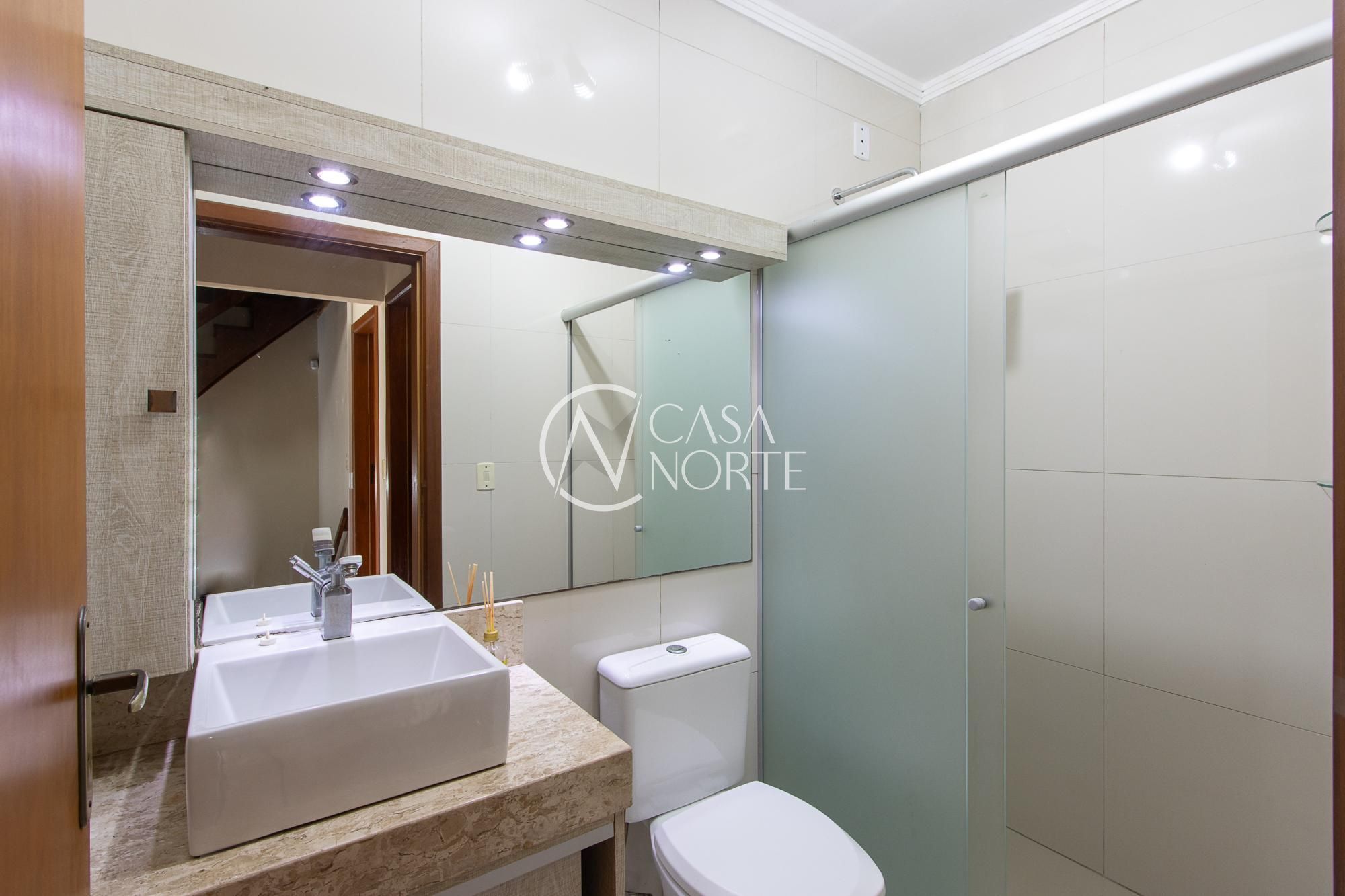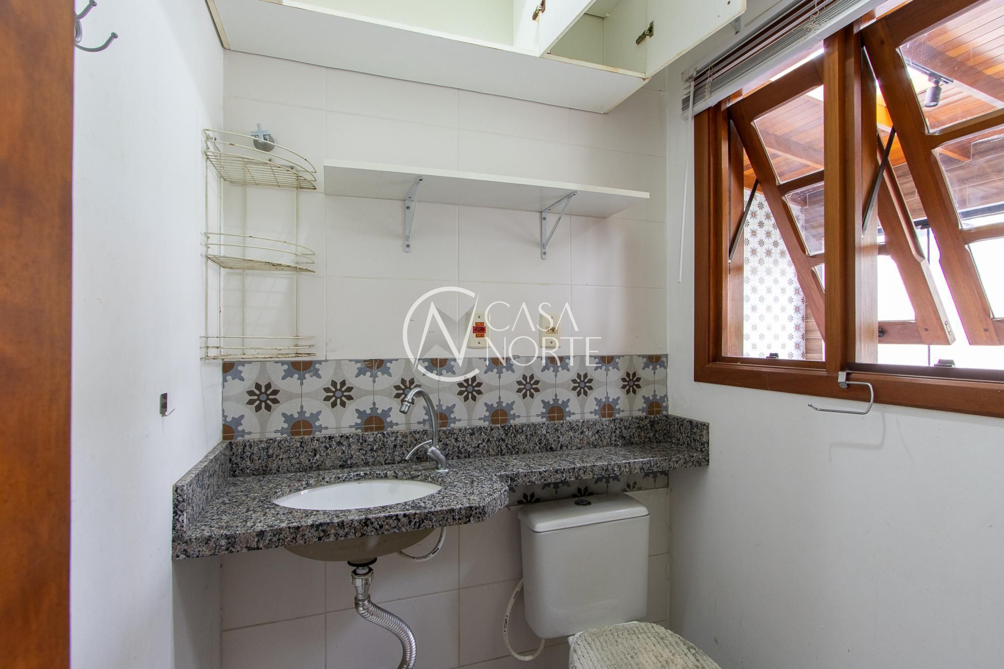 O imóvel conta com 4 banheiros: um na suíte, um banheiro social no andar superior que atende aos outros dois quartos, um lavabo no térreo e um banheiro externo na área da piscina (sem chuveiro), ideal para dar suporte aos momentos de lazer.
