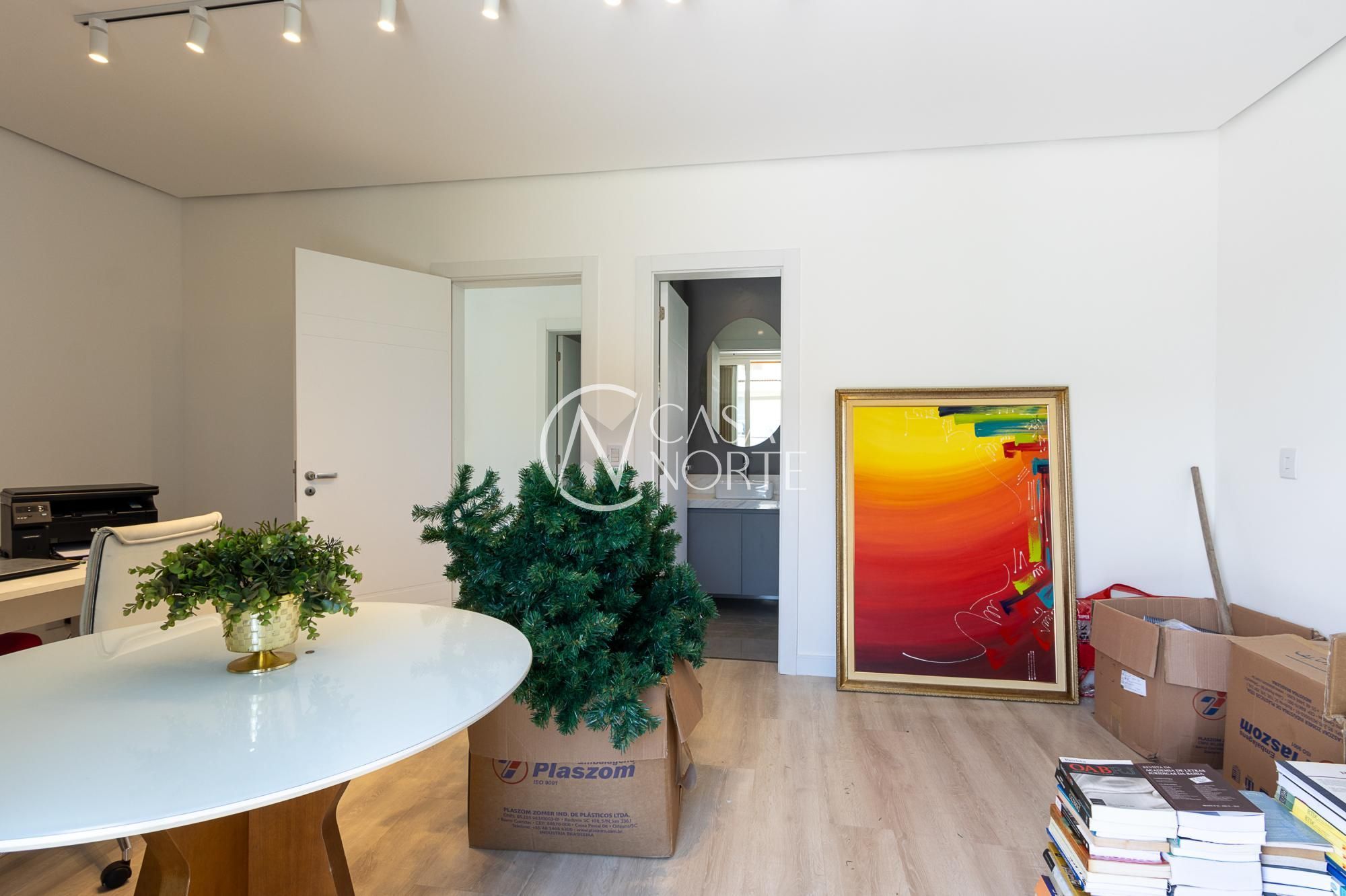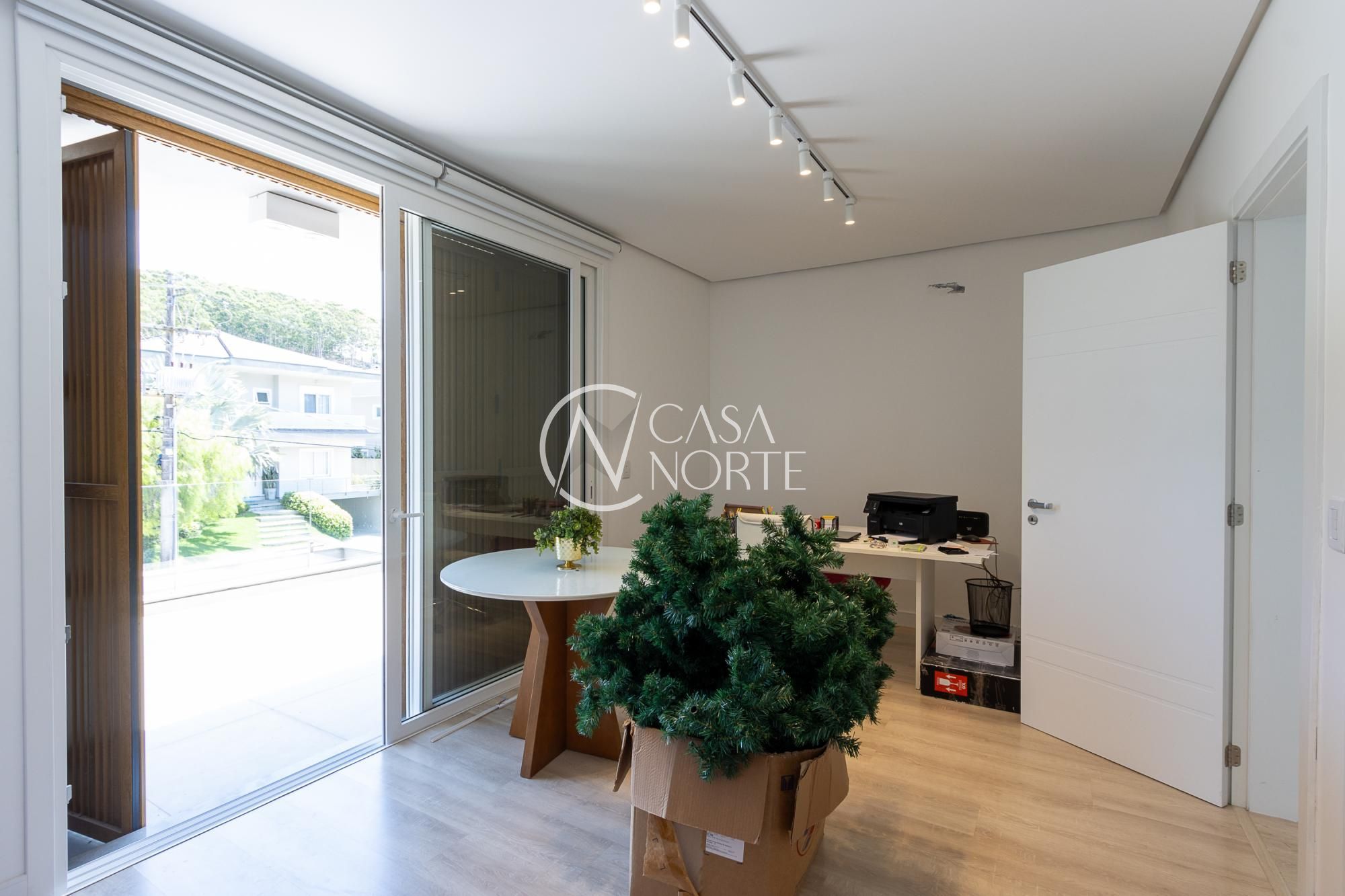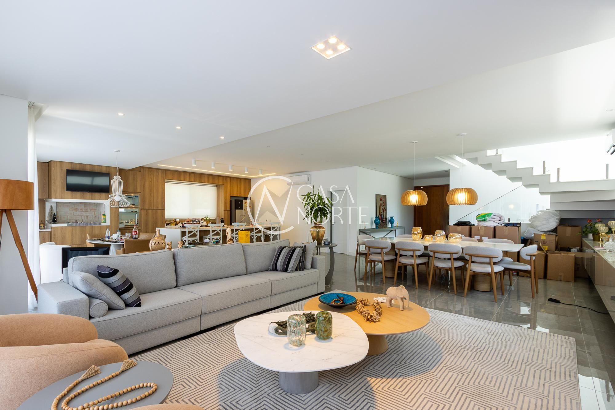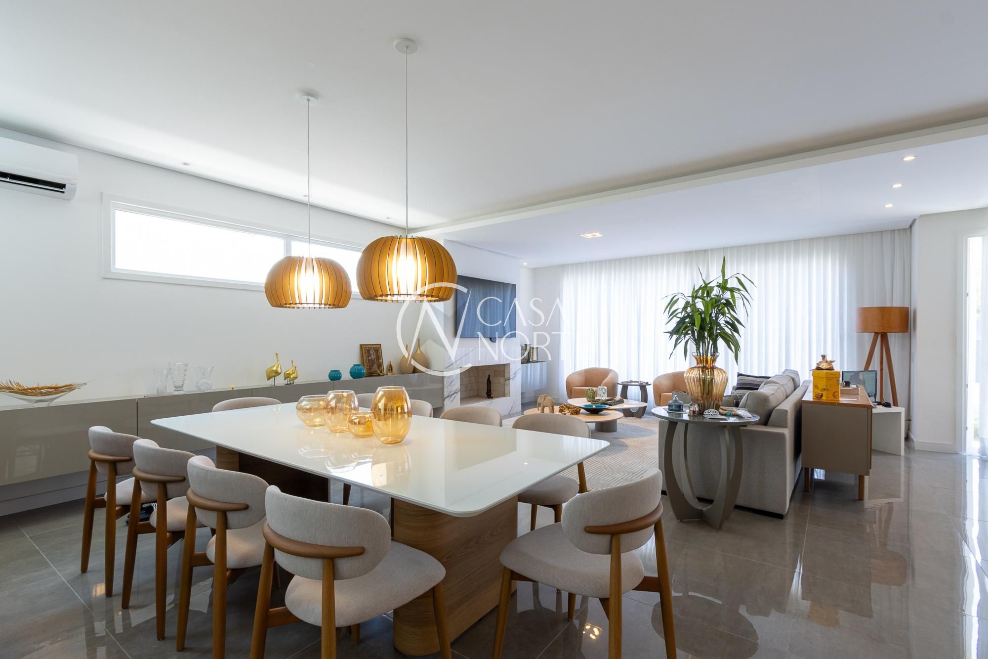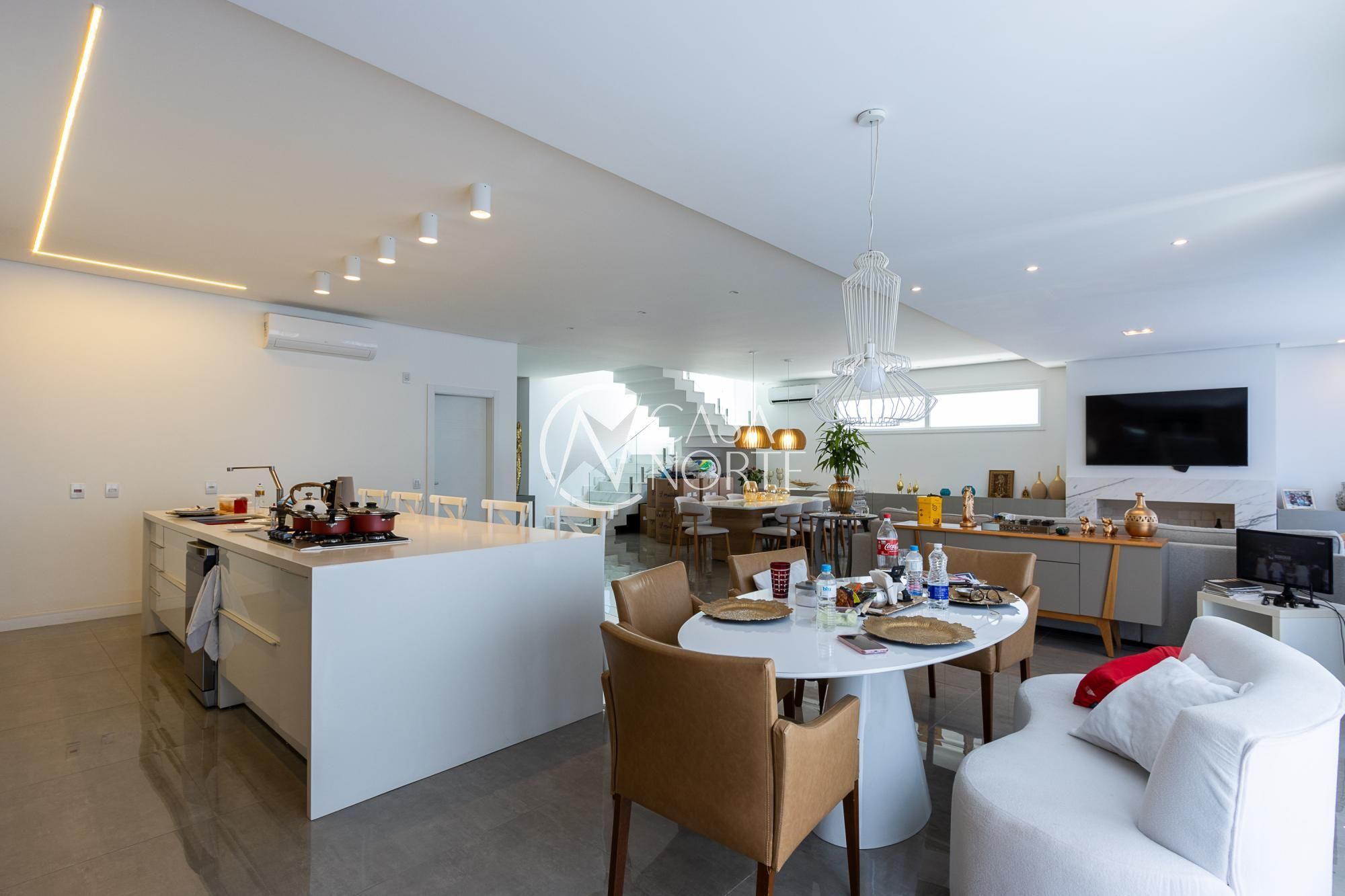 No andar térreo, os ambientes são amplos e integrados, com abertura para o pátio com piscina. Sala de estar com lareira, lavanderia, despensa e um ambiente versátil, ideal para escritório ou suíte térrea.