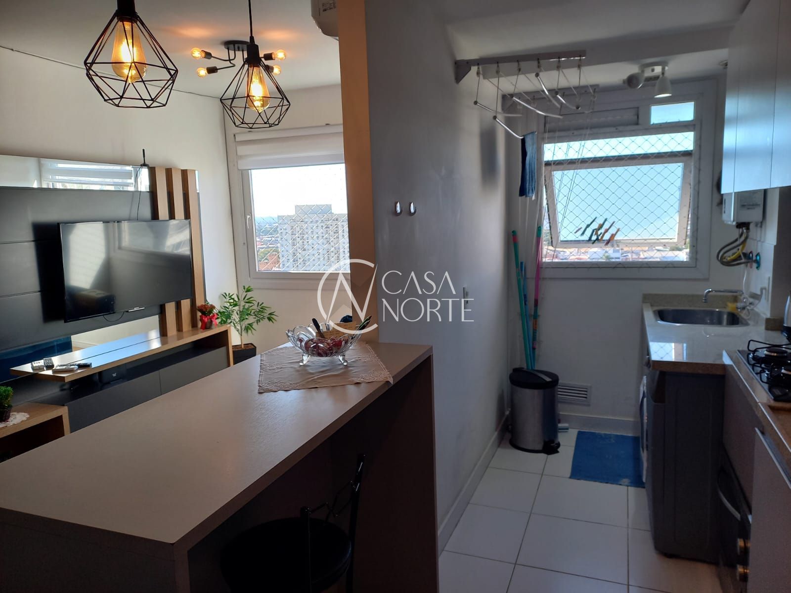 Sala em dois ambientes, sala de tv e sala de jantar integrada com churrasqueira e cozinha americana planejada com área de serviço ensolarada e 2 dormitórios com privacidade e 2 banheiros. Ótima posição solar(Leste), linda vista aberta e móveis planejados de ótima qualidade.