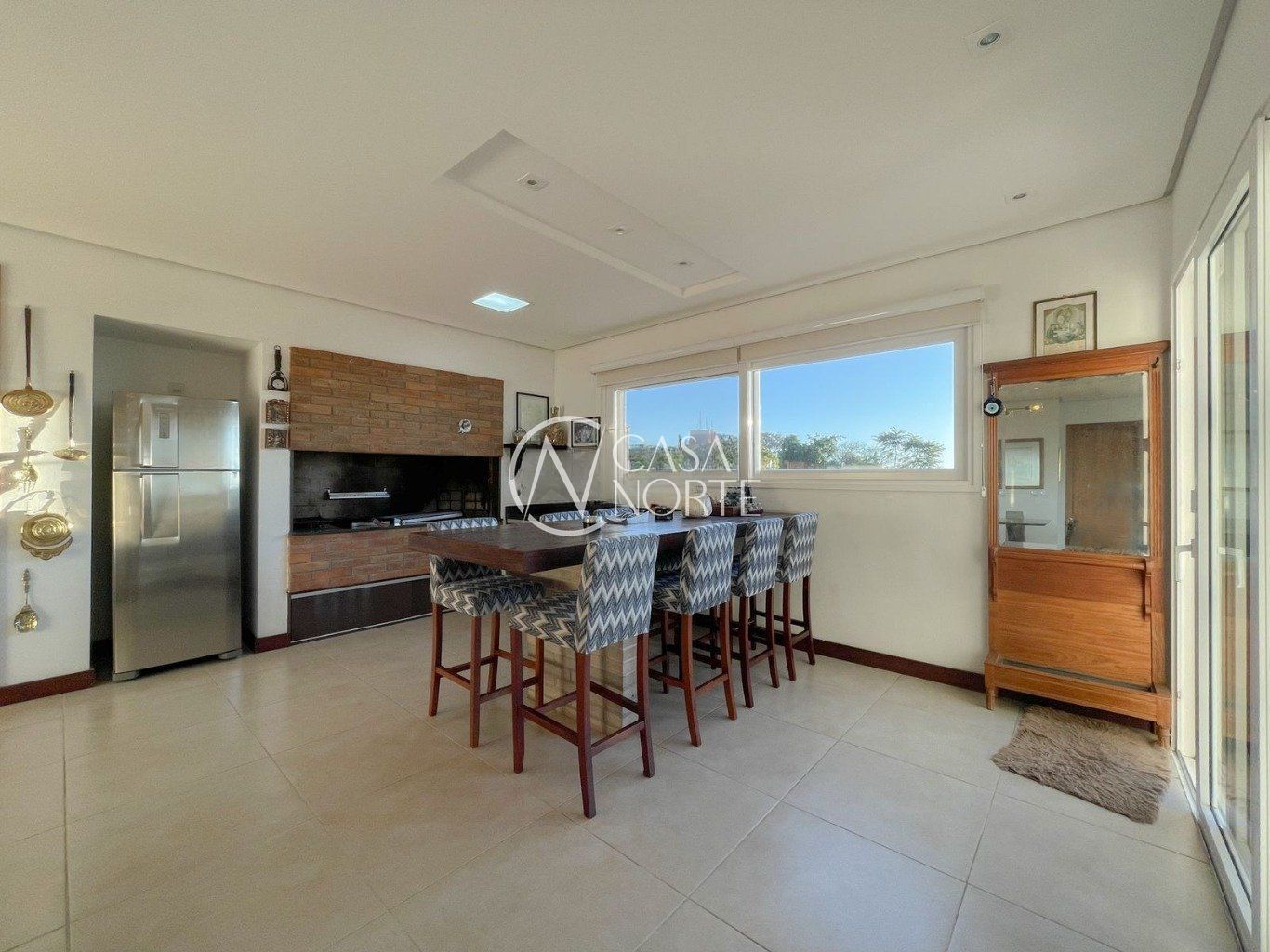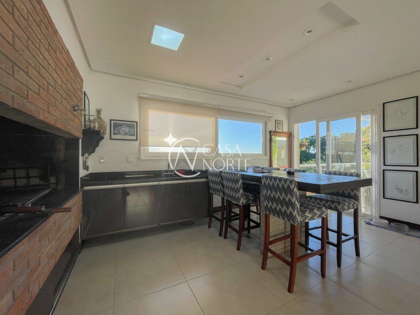 No terceiro pavimento, o living se transforma em um camarote exclusivo. A integração perfeita entre a cozinha gourmet, a churrasqueira e a lareira criam o ambiente ideal para receber, tudo isso emoldurado por uma vista panorâmica e inesquecível do Guaíba.