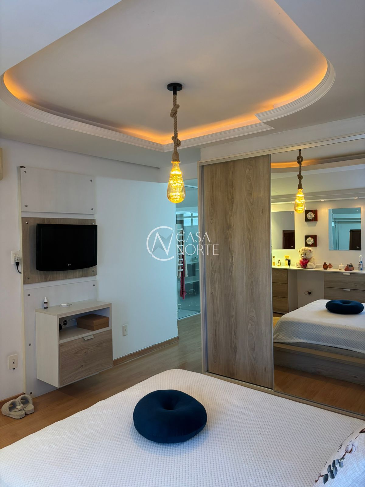 No andar superior, suíte master com 35 m². No pavimento térreo, uma segunda suíte completa, oferecendo praticidade e acessibilidade. Sala ampla com lareira, sala de jantar integrada e um aconchegante espaço para leitura. Todos os banheiros possuem ventilação natural. Cozinha equipada com móveis planejados de excelente padrão e área de serviço separada.