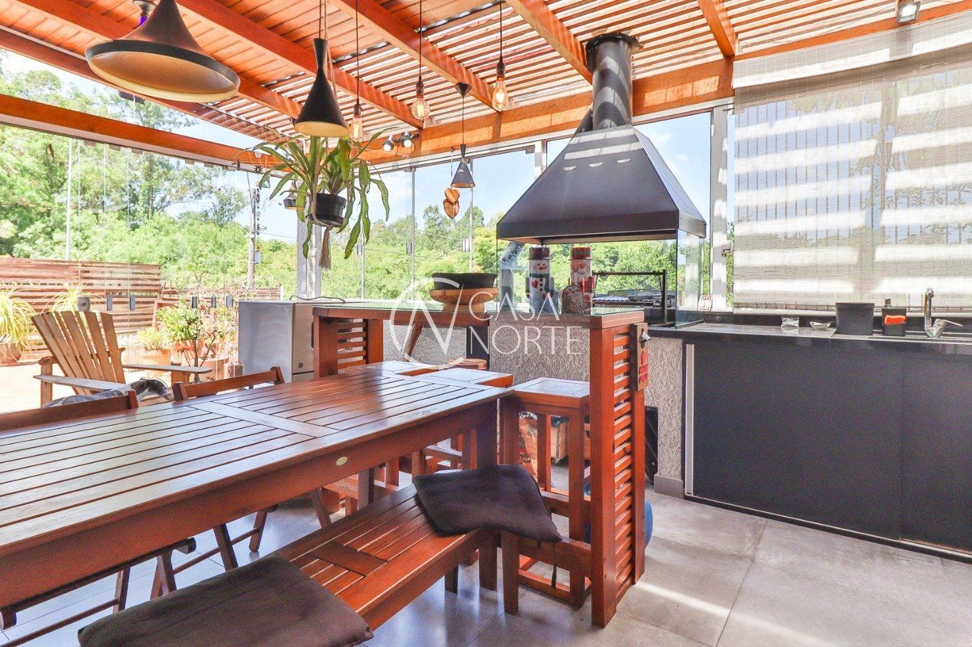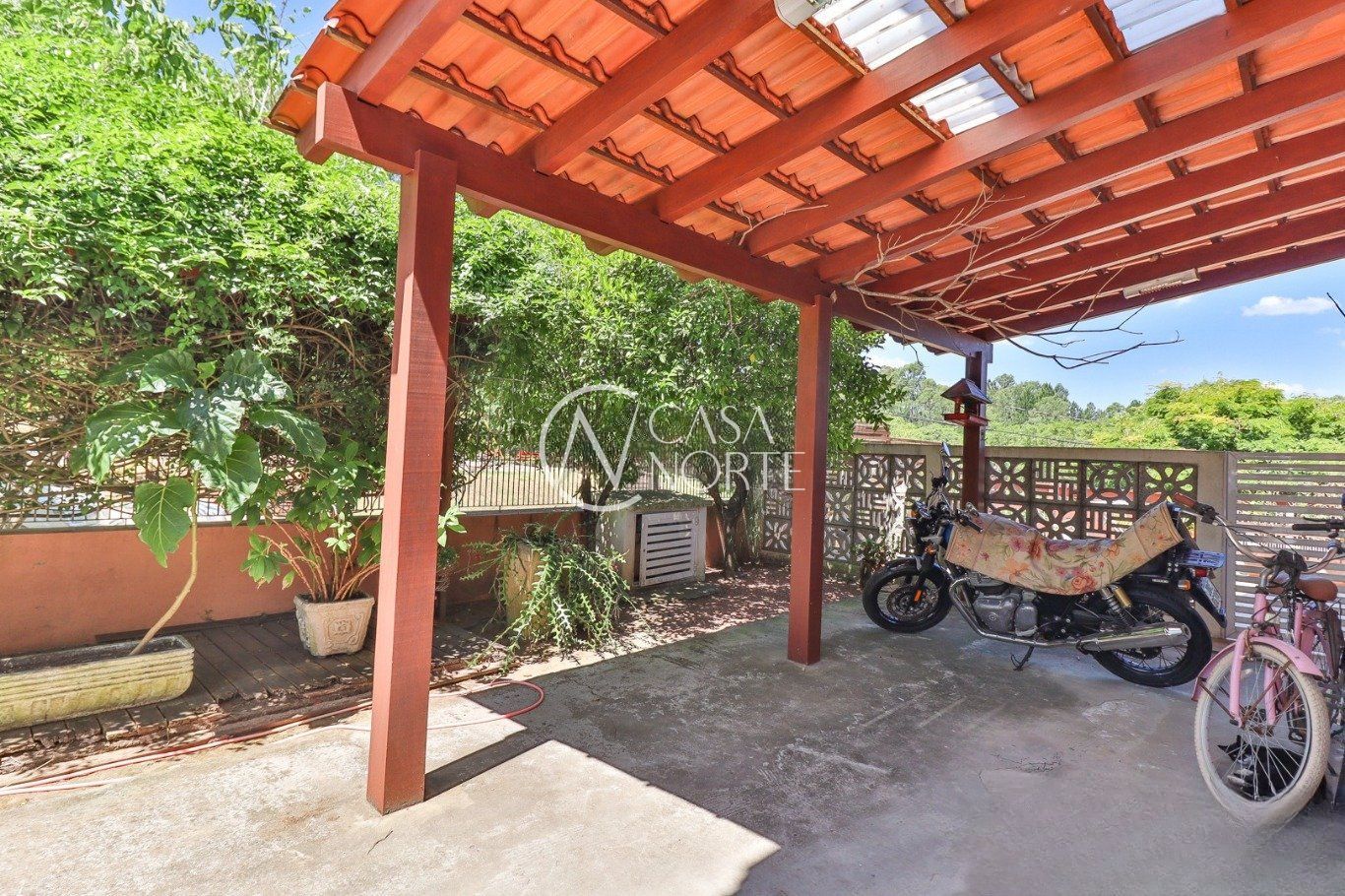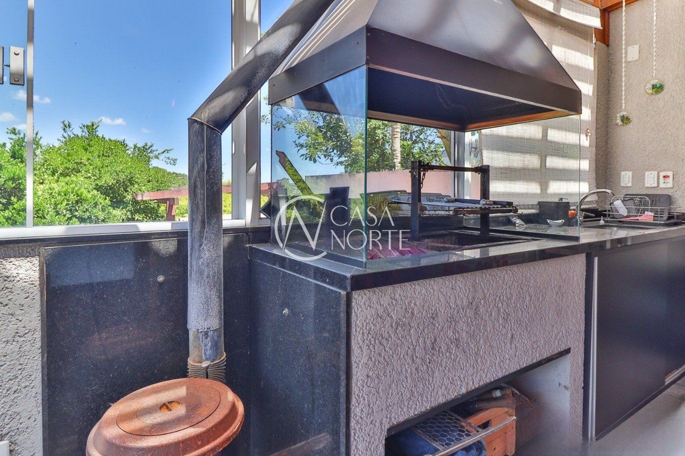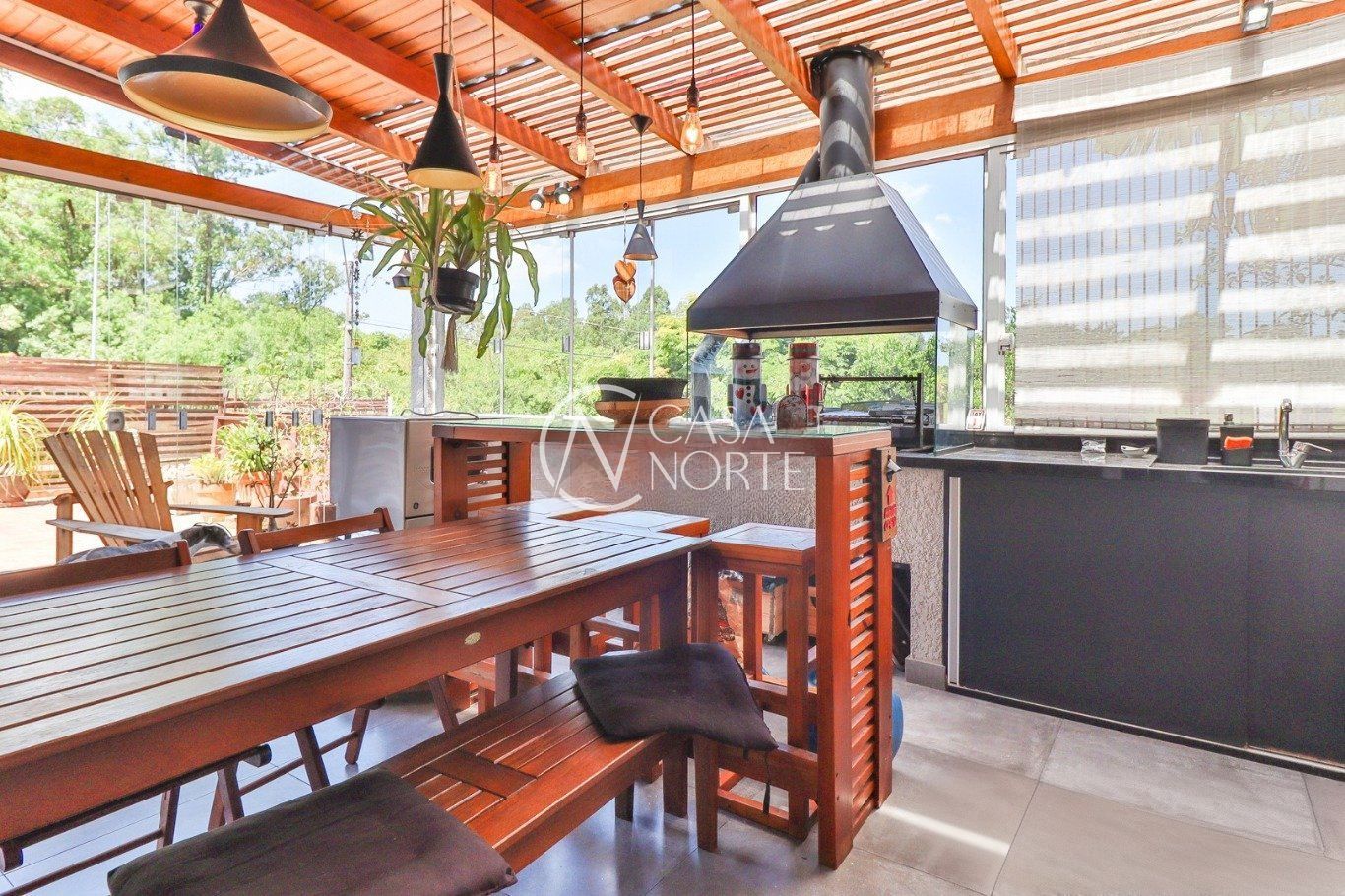Possui vaga para até 3 carros, espaço gourmet com churrasqueira e fogão a lenha, além de amplo pátio com possibilidade de piscina privativa.