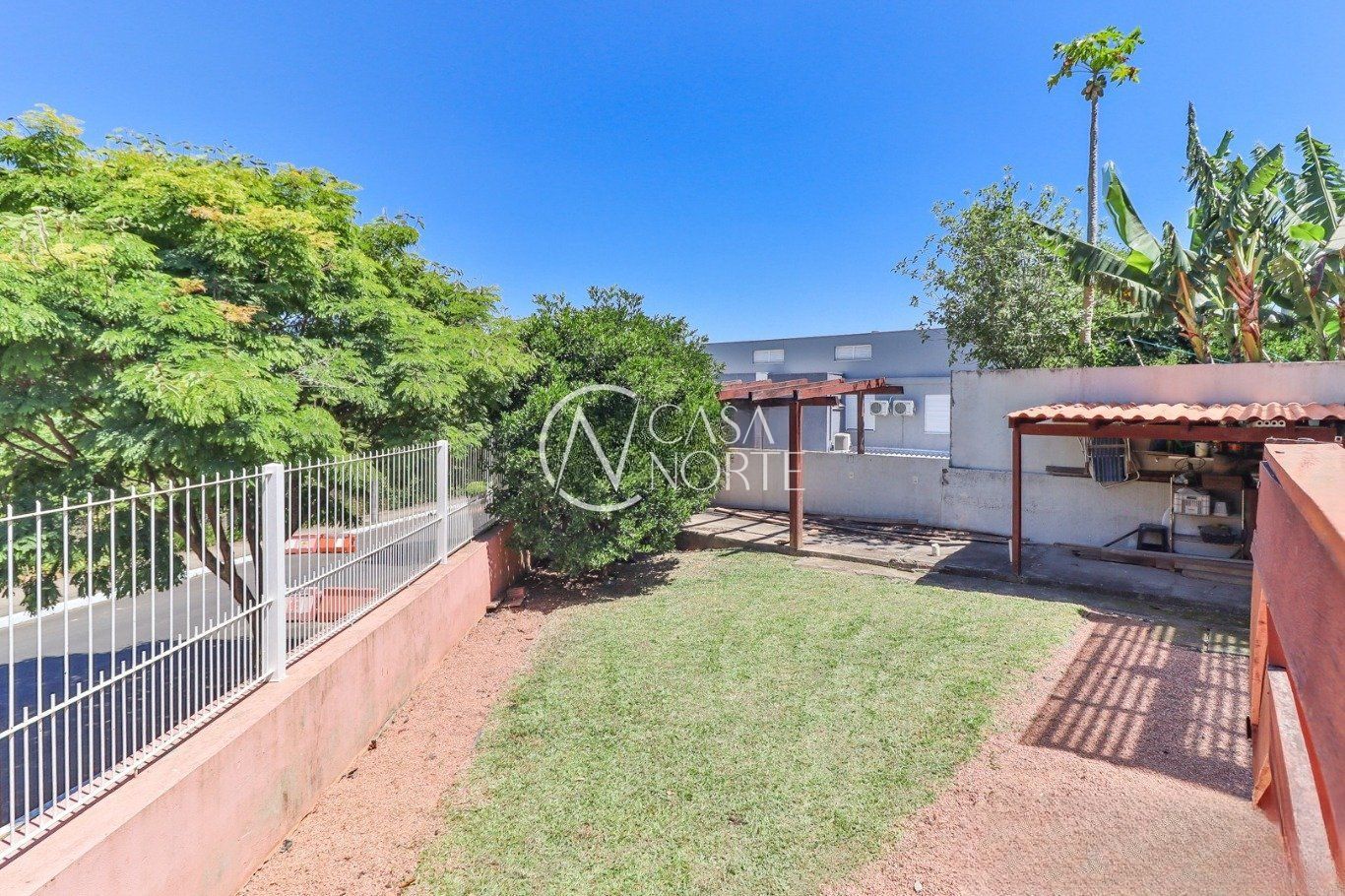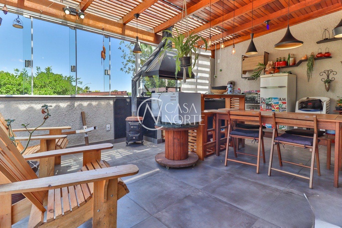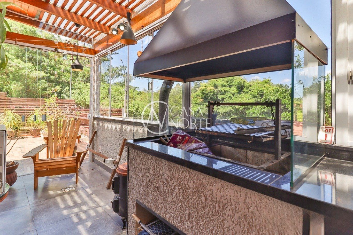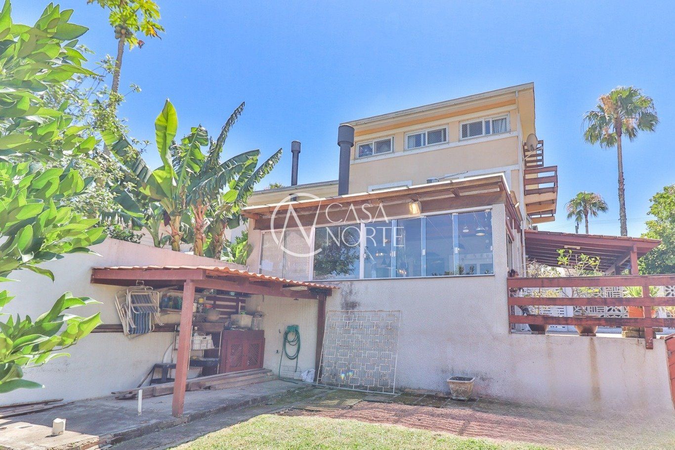 Possui vaga para até 3 carros, espaço gourmet com churrasqueira e fogão a lenha, além de amplo pátio com possibilidade de piscina privativa.