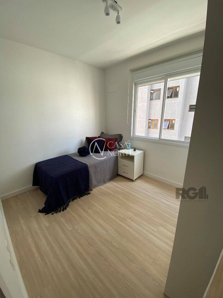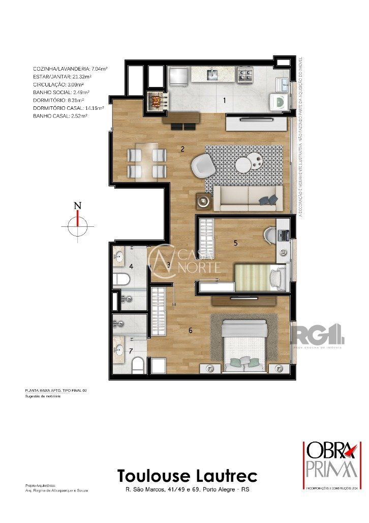 Apartamento de 2 dormitórios com uma suíte, banheiro social, sala de estar/ jantar e cozinha americana com churrasqueira.