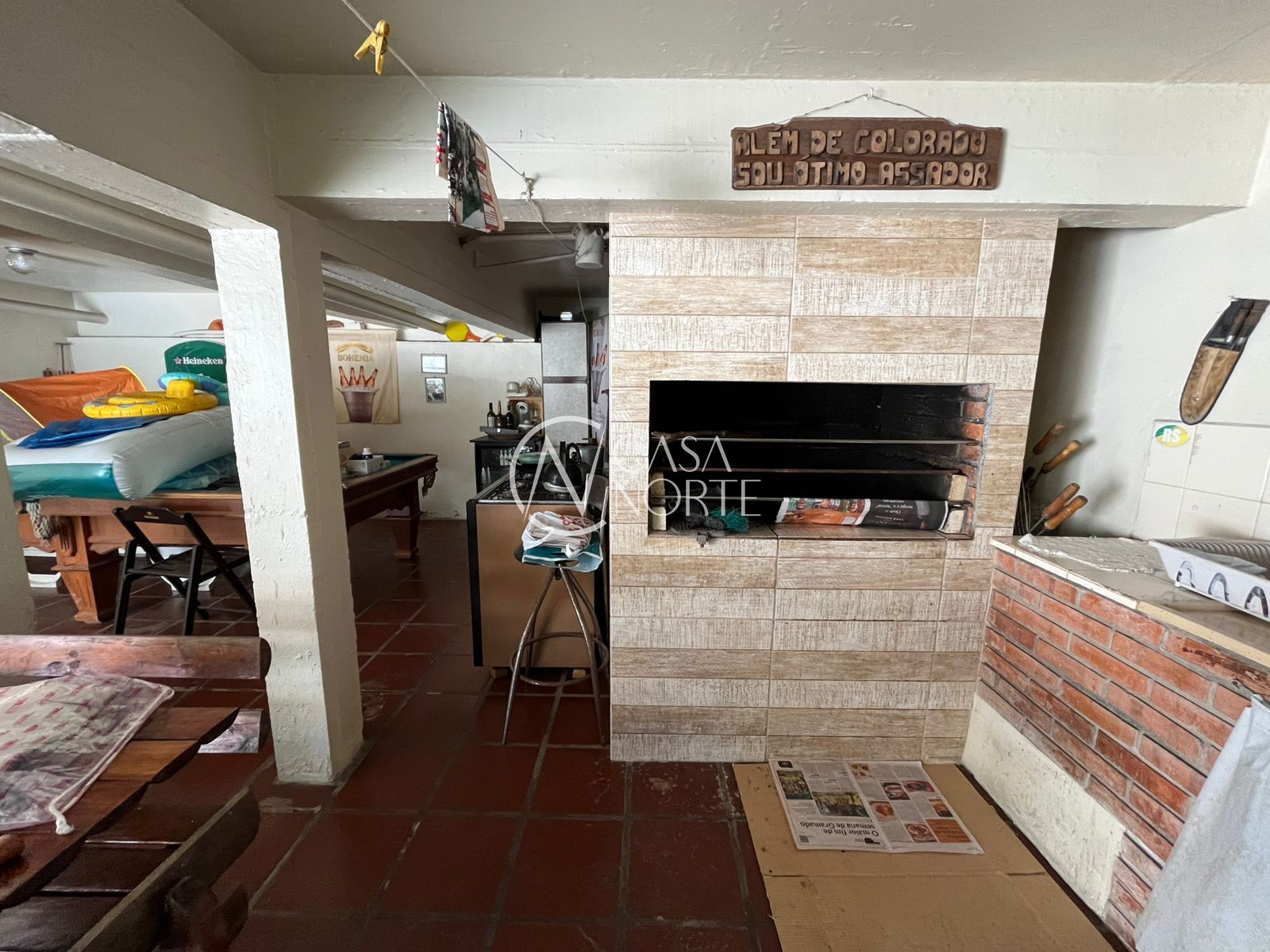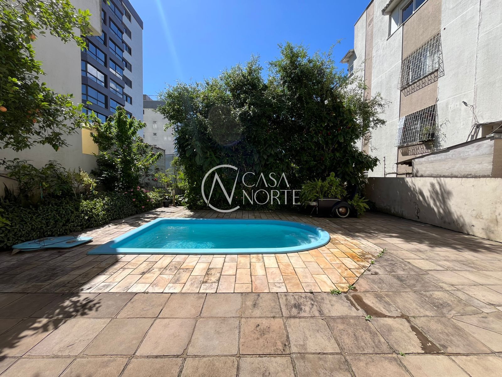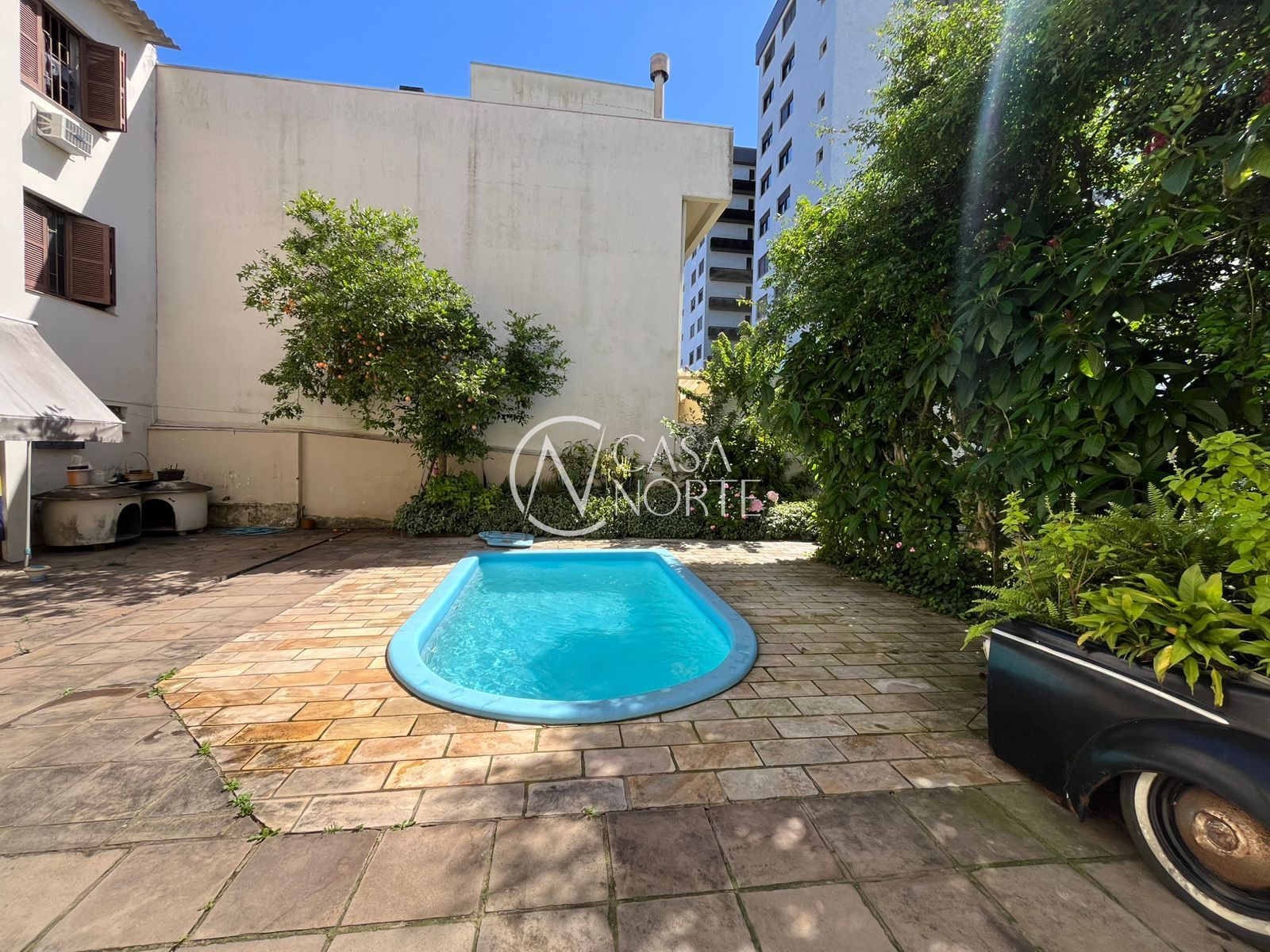 Conta com área na frente e pátio nos fundos, grande, com piscina, horta e uma área coberta perfeita para salão de festas, com churrasqueira.