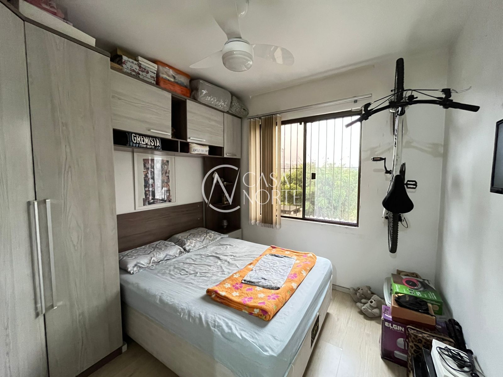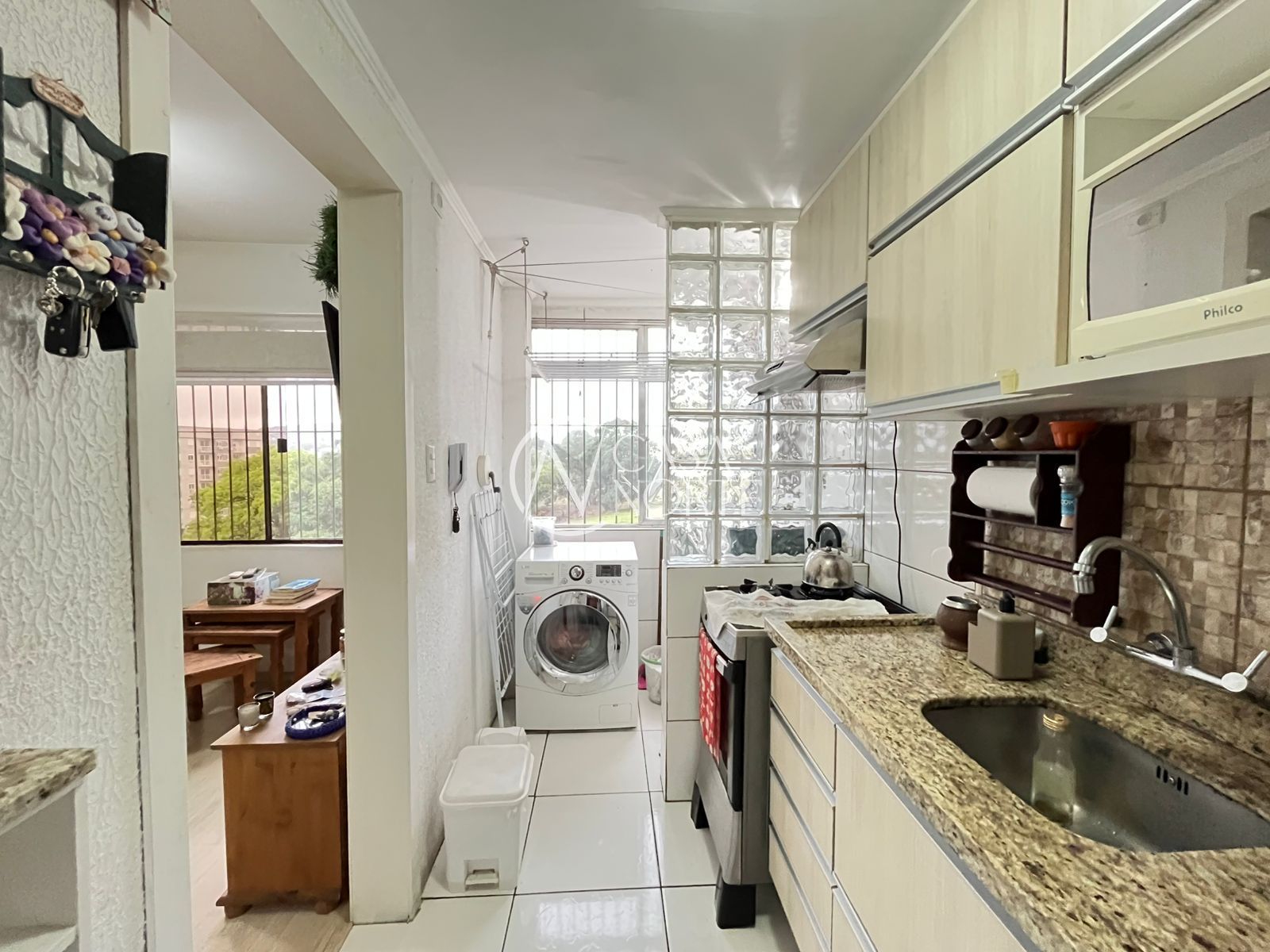 A sala tem espaço para mesa de jantar e living para TV. Cozinha com móveis sob medida. A lavanderia é separada, com espaço para máquina e tanque. No espaço de circulação entre os cômodos, tem um armário com bastante espaço. Banheiro com box de vidro e móveis novos. O dormitório é amplo, fica a cama box com baú.