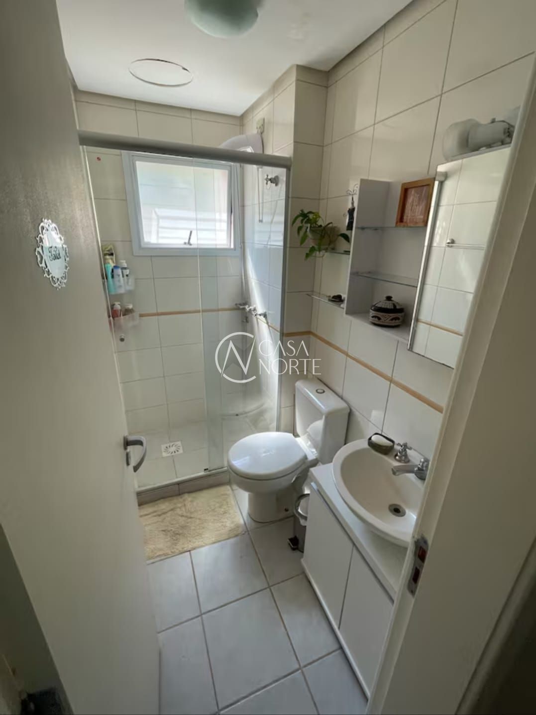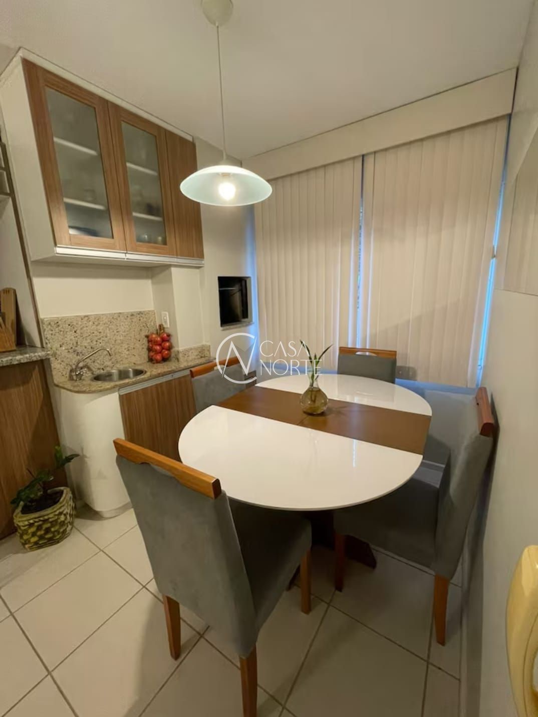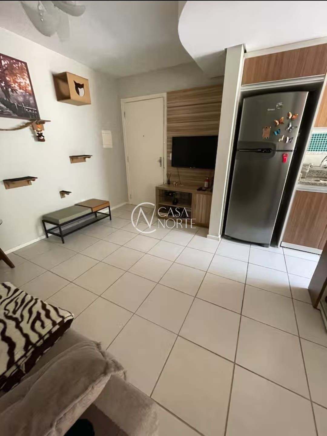 Living para 2 ambientes, cozinha montada, banheiro social com box de vidro.