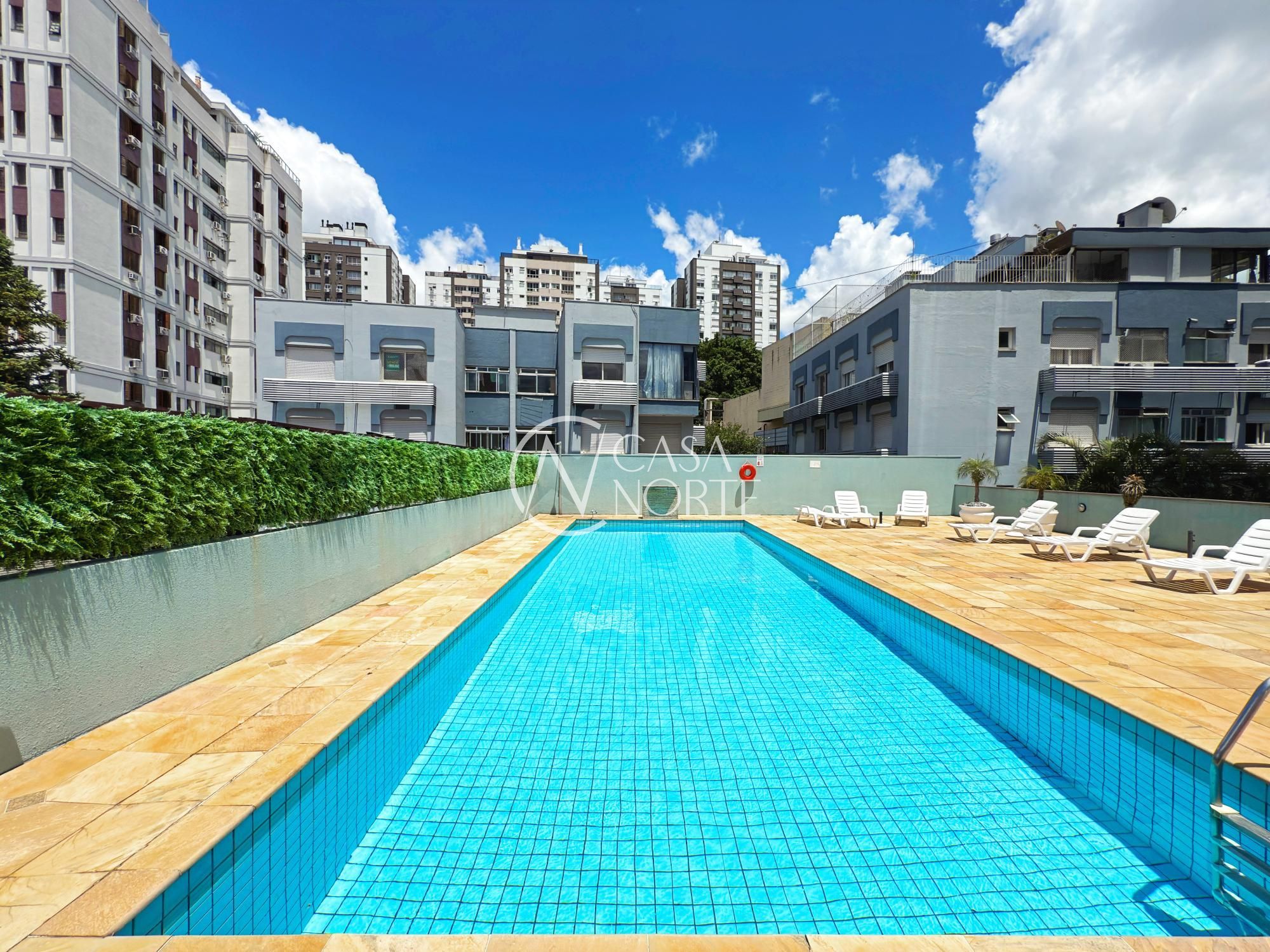 Prédio com condomínio baixo, portaria virtual, salão de festas, elevador, piscina.