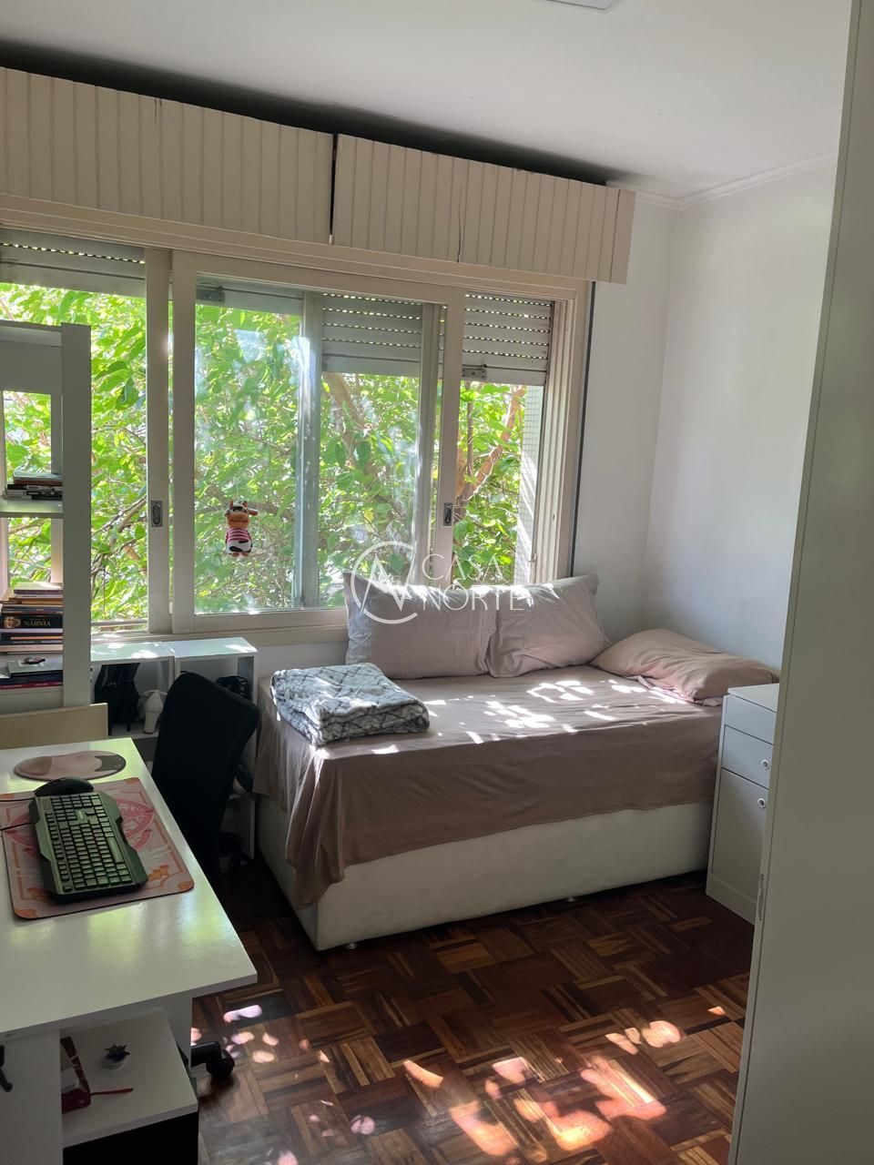 Ampla sala com vista arborizada, 2 dormitórios com privacidade, banheiro social com ventilação natural. 1 peça grande separada, com lareira e sacada, podendo ser o terceiro quarto (suíte máster). Com peças amplas e bem distribuídas, sol da manhã nos 2 quartos, na sala e no suíte separada. Cozinha ampla, área de serviço separada e um pátio privativo com churrasqueira.