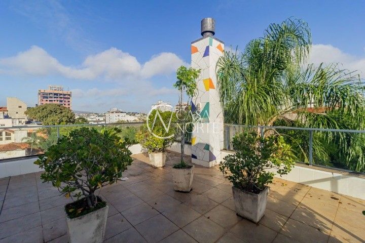 Excelente cobertura localizada no Bairro Petrópolis, ensolarada, área privativa de 301m², sendo o primeiro pavimento composto por três dormitórios (um é suíte), banheiro social, living para dois ambientes com lareira e duas sacadas abertas que podem ser integradas a área social, lavabo, cozinha com churrasqueira, área de serviço e dependência completa de empregada. Segundo pavimento possui um terraço com aproximadamente 150m² de área, com acesso pelo living e de uso exclusivo do apartamento, espera para piscina e possibilidade de construção de um estar com churrasqueira. Imóvel possui três vagas de garagem individuais, lado a lado, no subsolo. Prédio pequeno, com elevador, serviços gerais e monitoramento da empresa STV. O imóvel tem piso e cozinha montada. Agende sua visita !!!