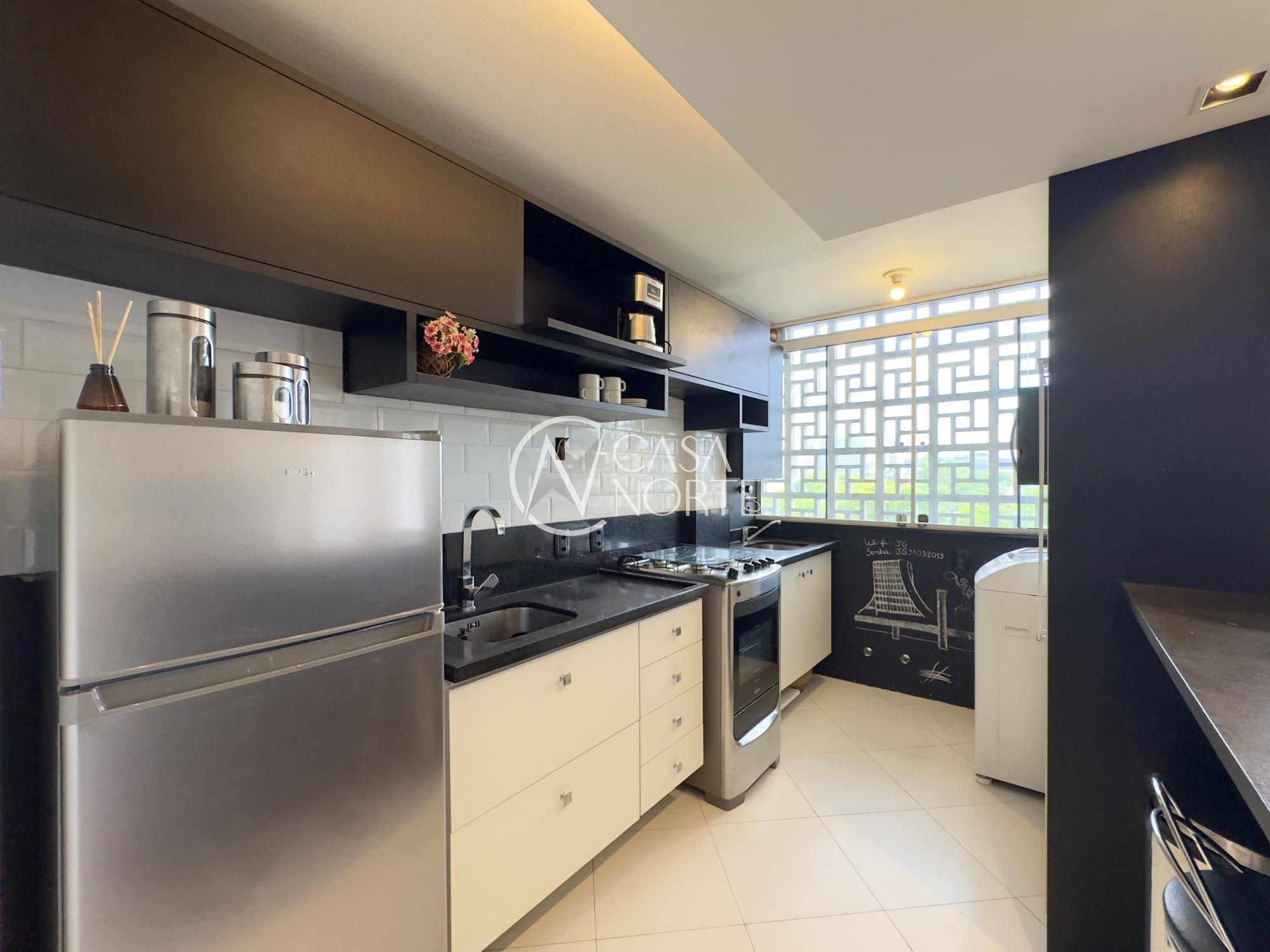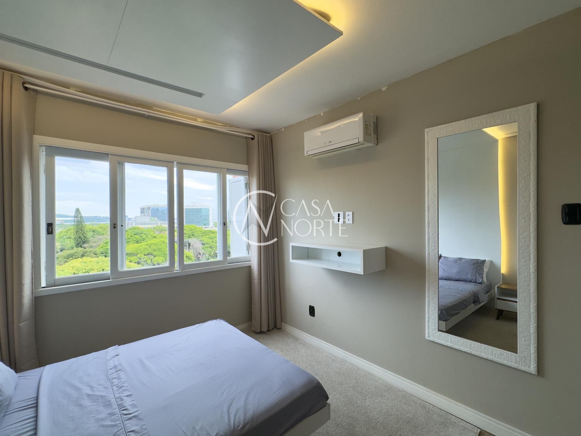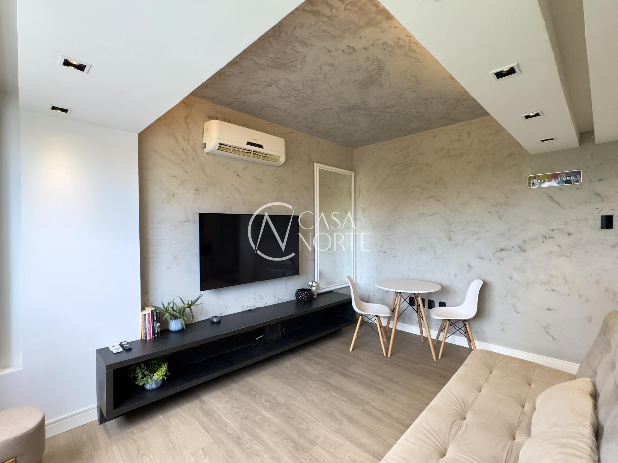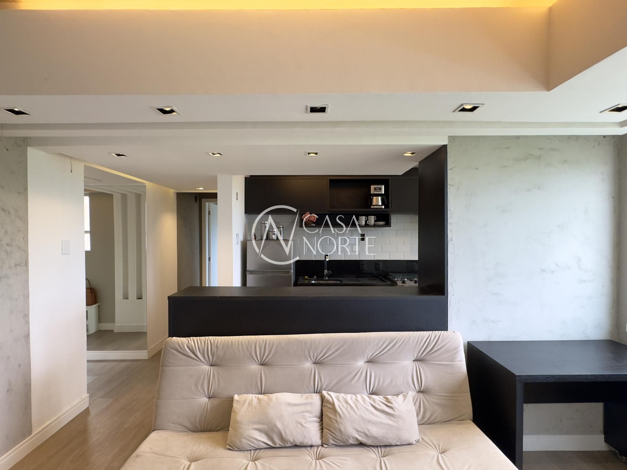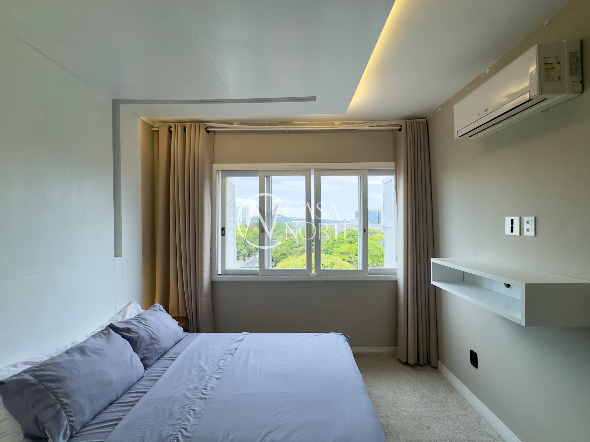 Apartamento mobiliado de 49m², de frente, 1 dormitório, living para dois ambientes, cozinha americana, área de serviço, 1 banheiro e 1 vaga de garagem. Imóvel disposto em andar alto, com linda vista definida para o Guaíba e skyline da cidade.
