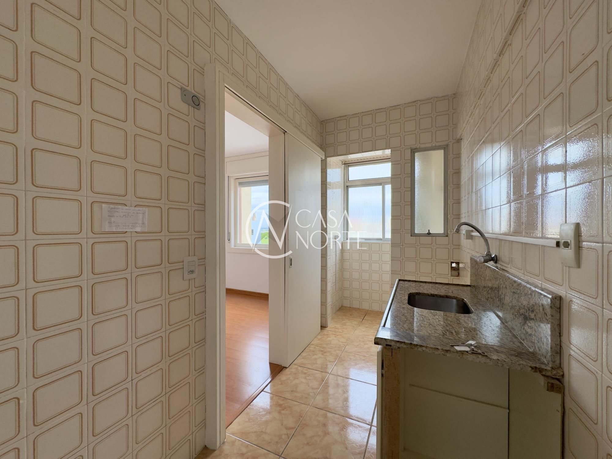 Apartamento de 39m², 1 dormitório, living para dois ambientes, cozinha com possibilidade de integração ao living, área de serviço separada e 1 banheiro. Imóvel disposto em andar alto, com vista para o Guaíba e orientação solar Oeste.