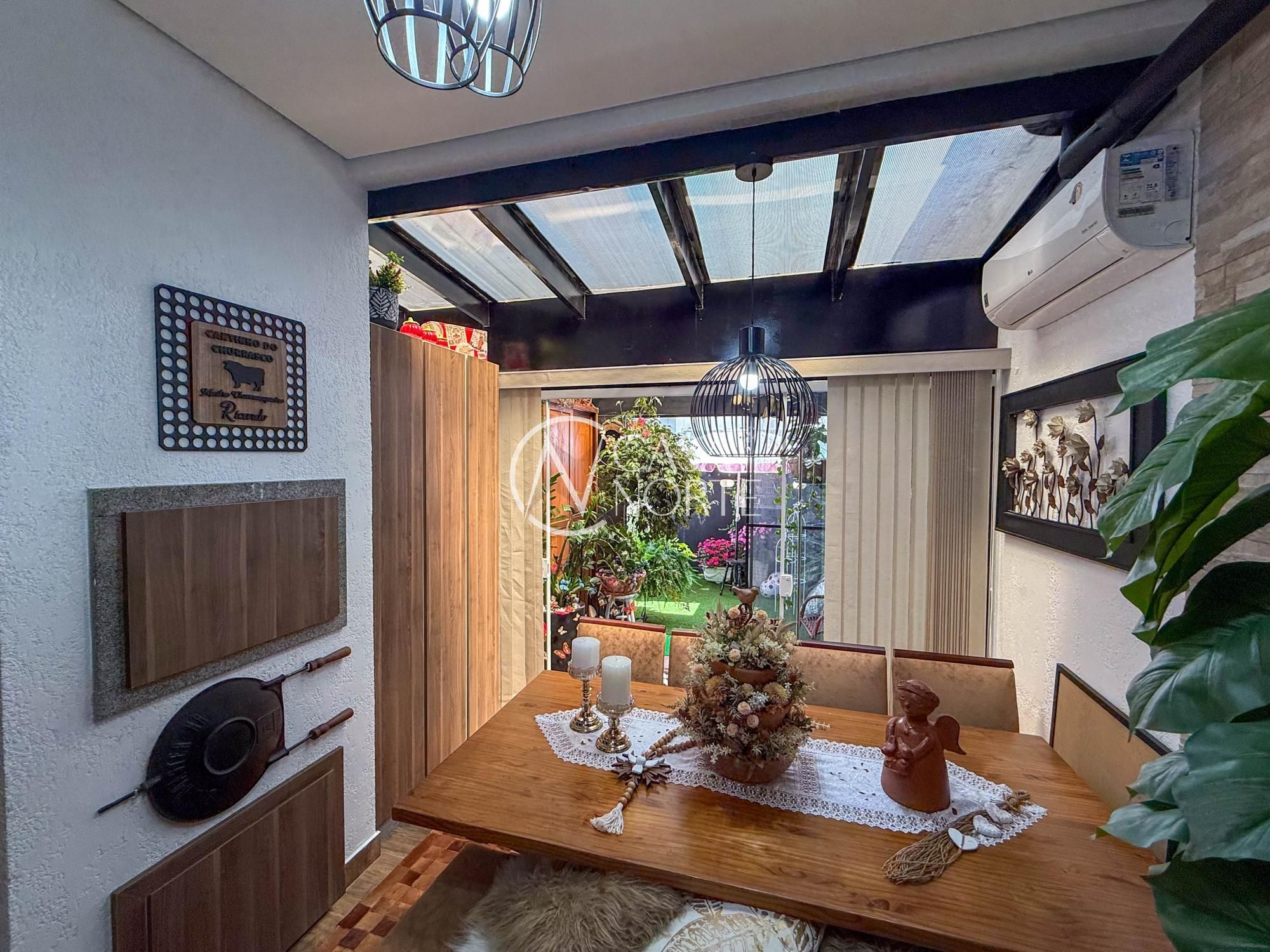 São duas vagas de garagem, pátio nos fundos e área gourmet com