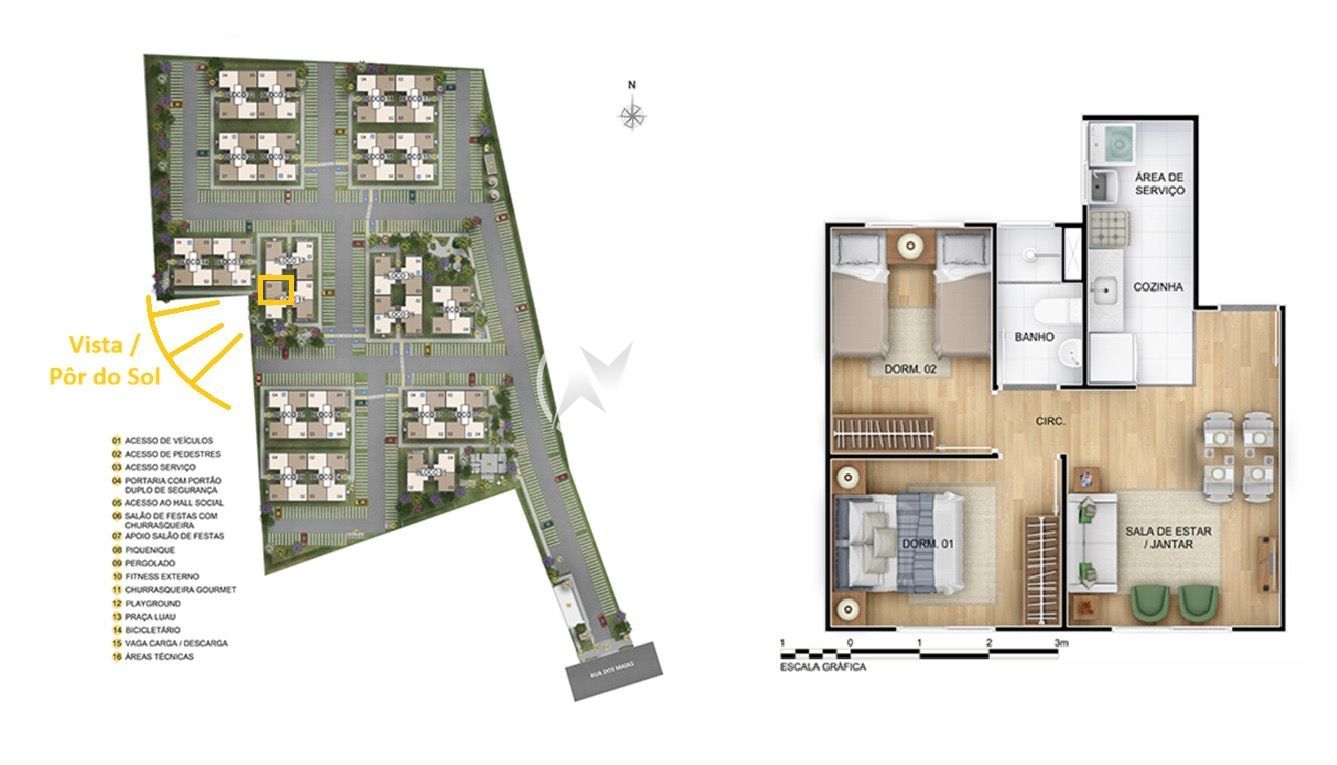 Com linda vista arborizada e voltado para o sol da manhã. No quinto andar, com 1 vaga de garagem rotativa. Condomínio com segurança de portaria 24 horas, mercadinho, quiosques com churrasqueiras, pomar, praças, playground, bicicletário e salão de festas.
