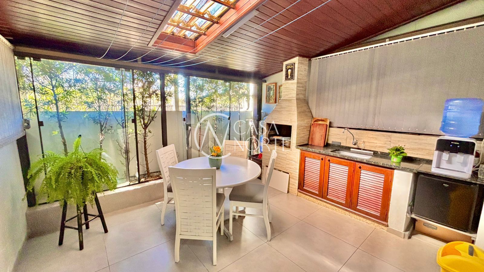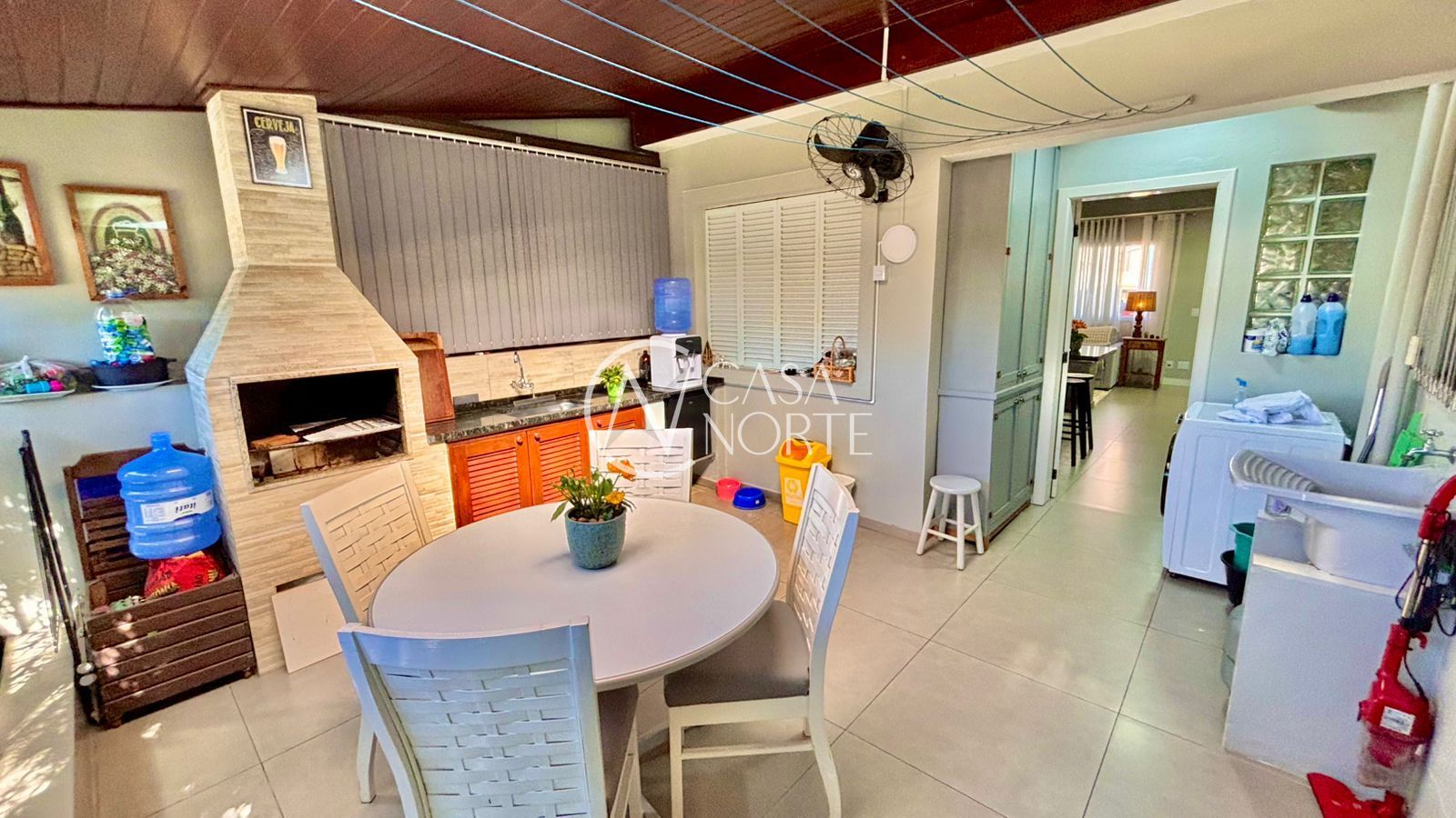 Nos fundos, um espaço fechado e confortável está integrado à casa, oferecendo uma churrasqueira e espaço para confraternizações. Esta área é uma verdadeira extensão da sala, proporcionando uma experiência única de lazer em casa e ampliando o espaço útil.