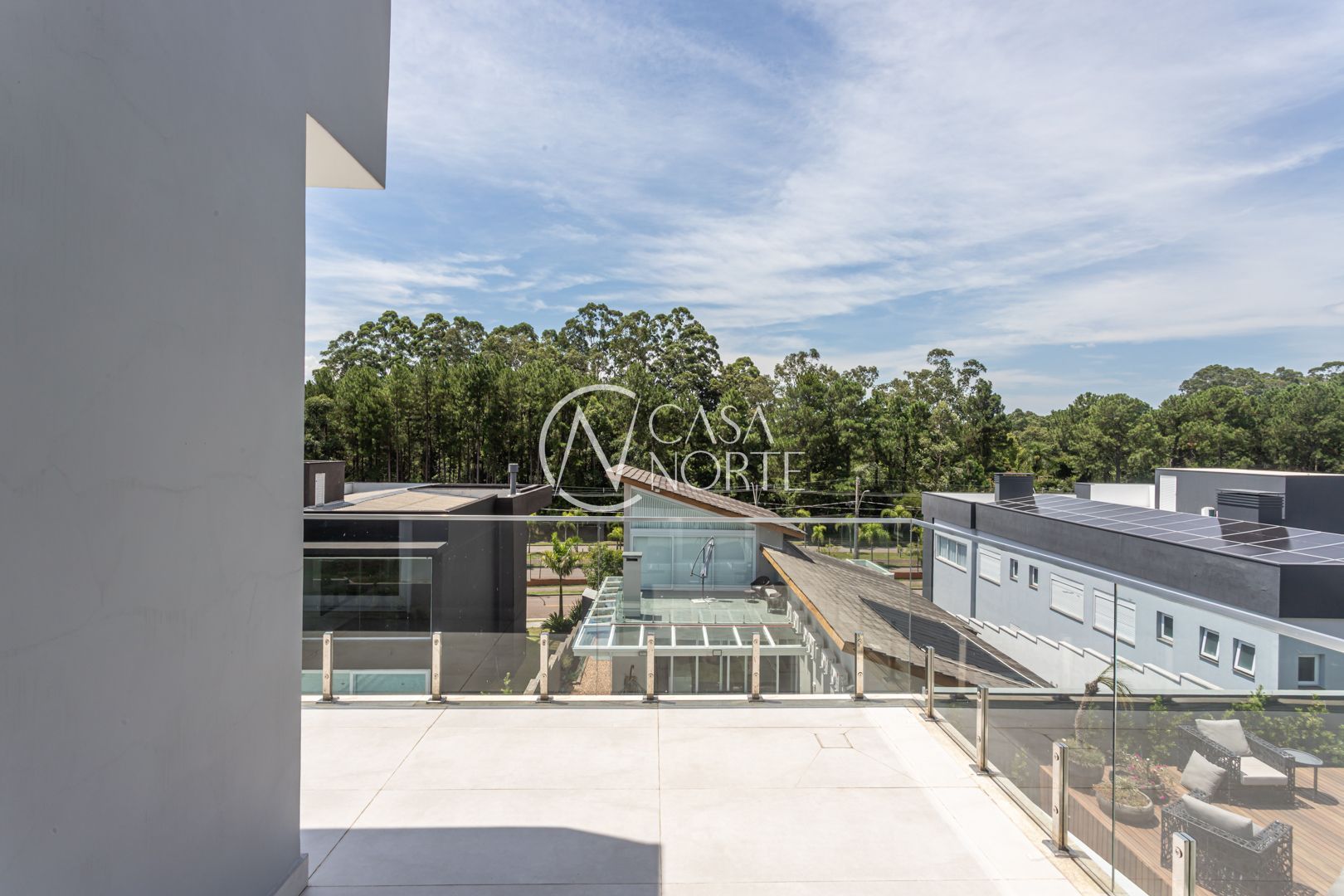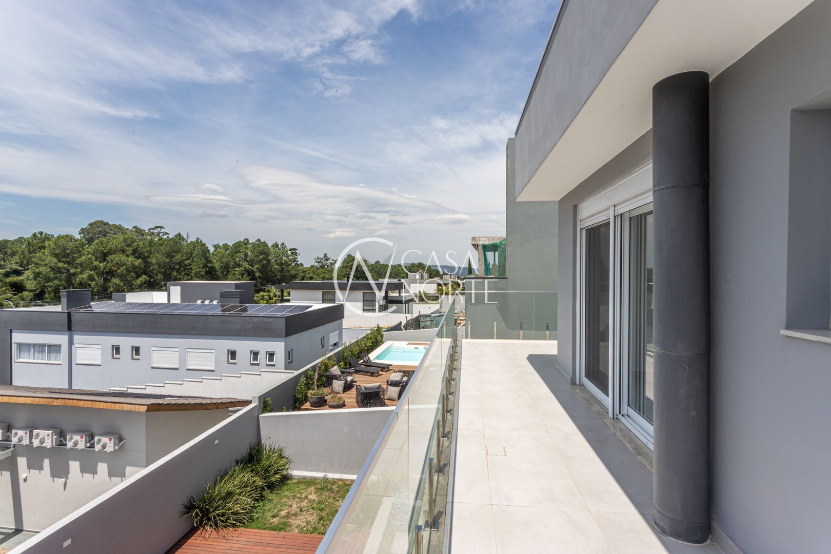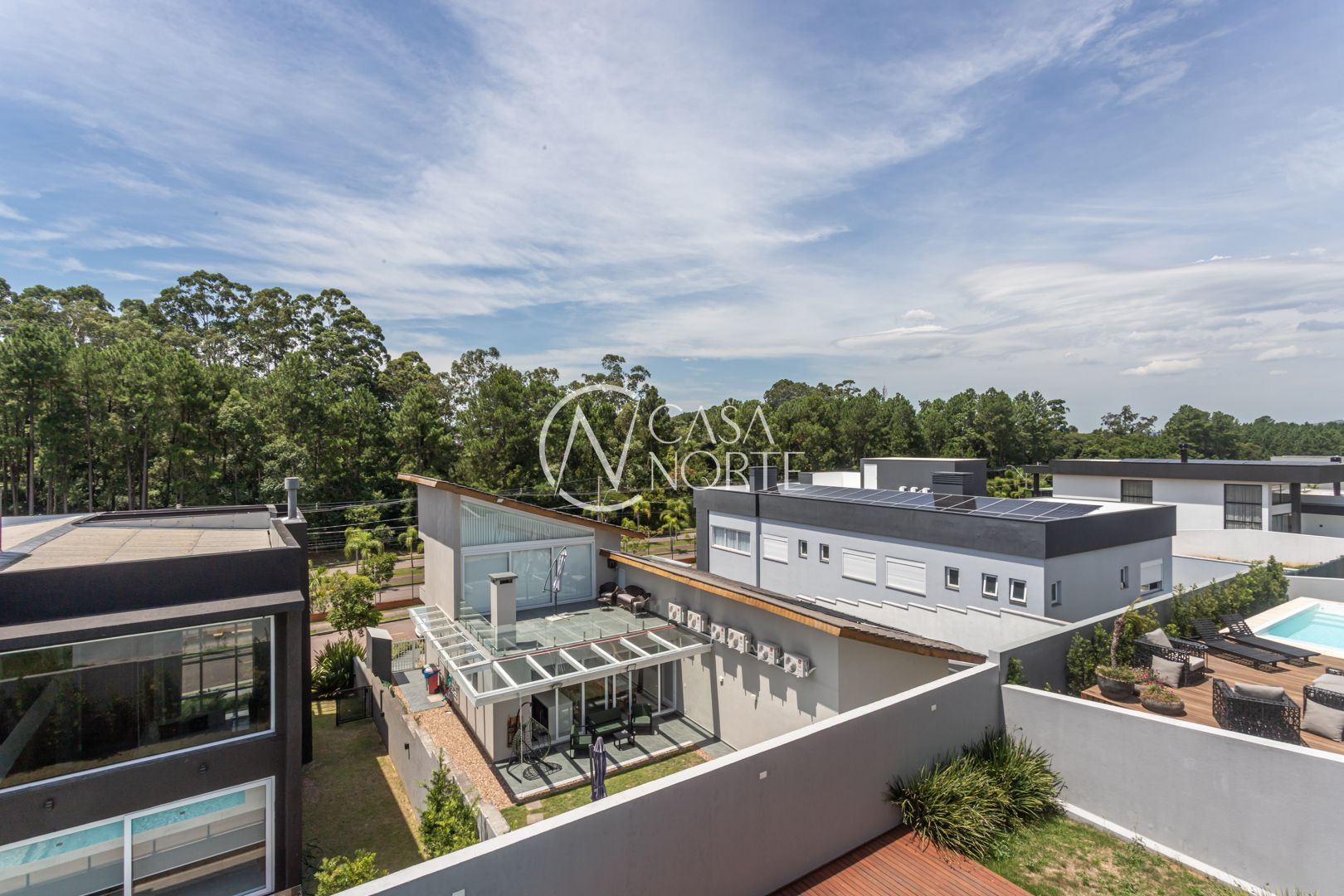 A casa possui esquadrias em alumínio em todos os ambientes, reforçando durabilidade e estética contemporânea.