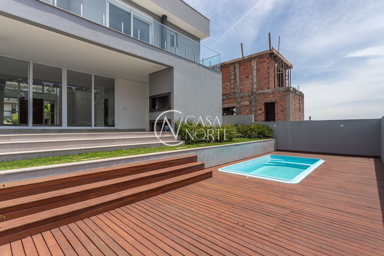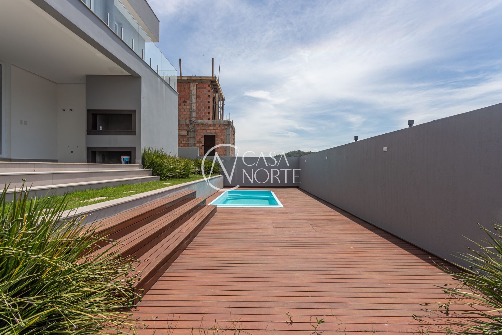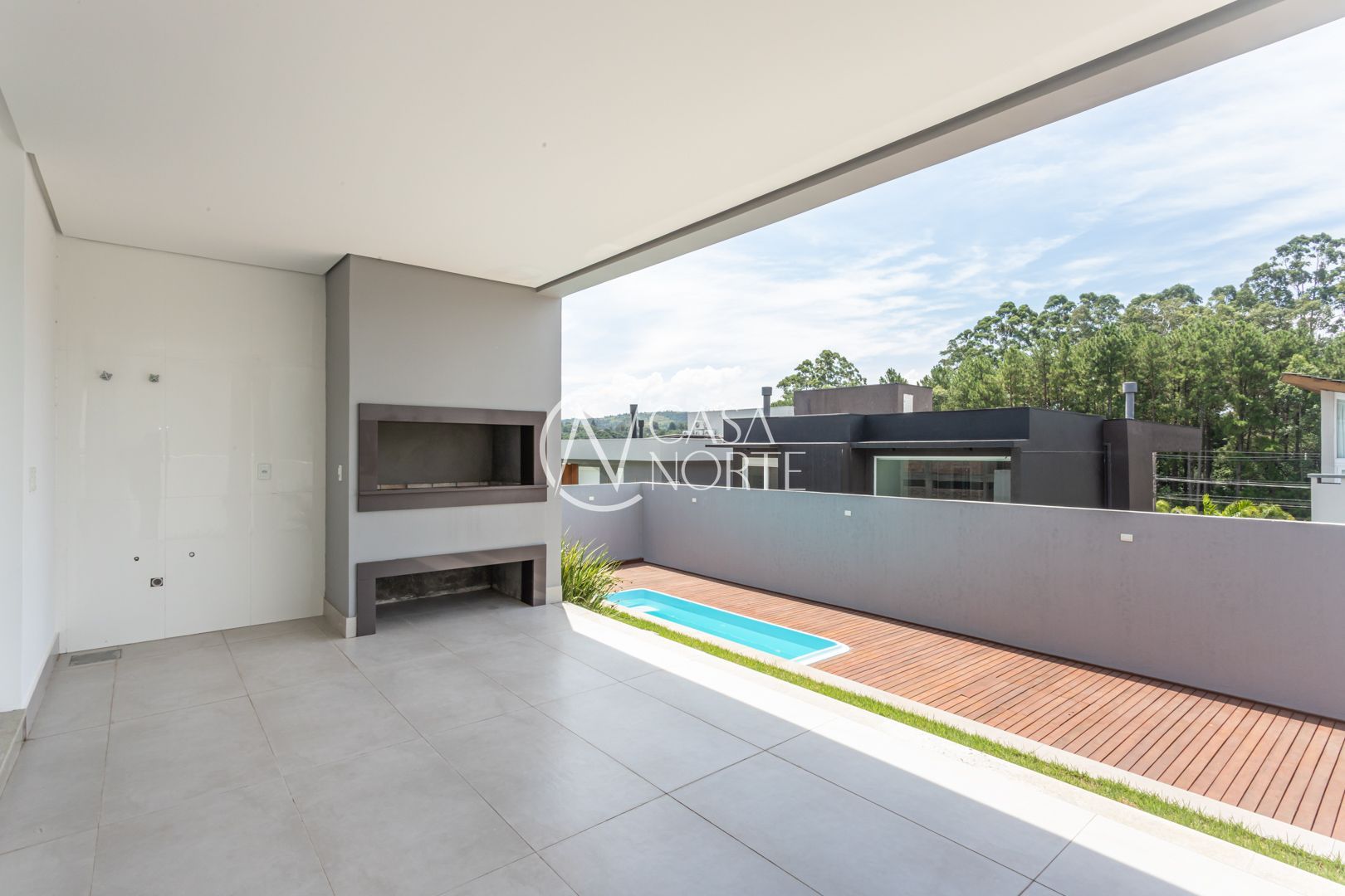 A área externa é um convite ao lazer: churrasqueira coberta, espaço para bancada, deck integrado à piscina e pátio amplo, perfeito para receber amigos e familiares com conforto e privacidade.