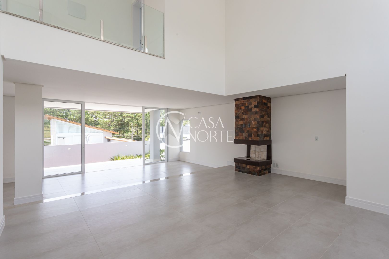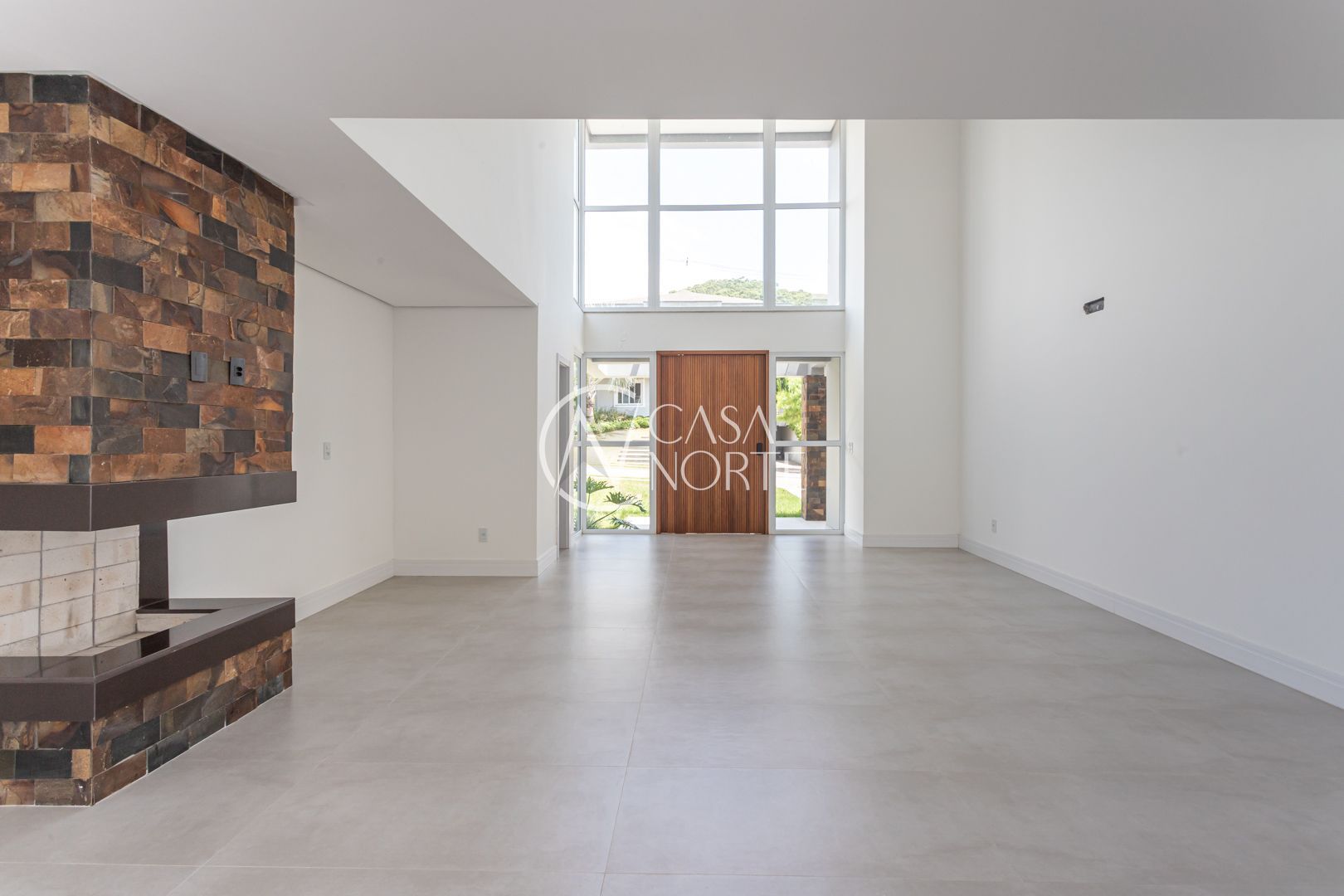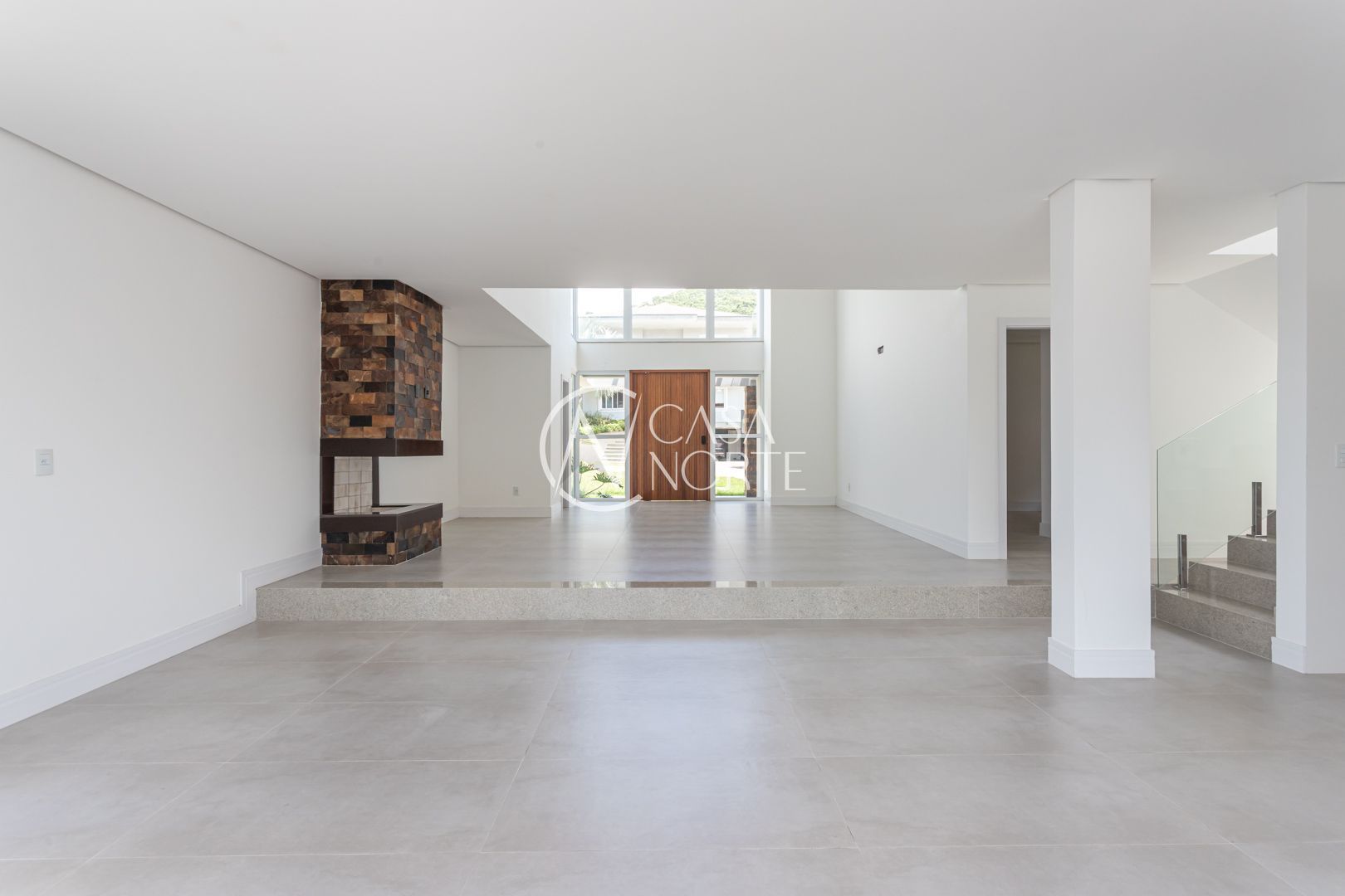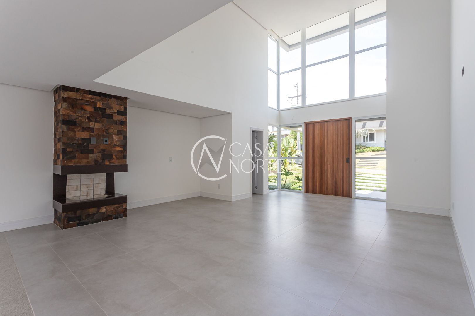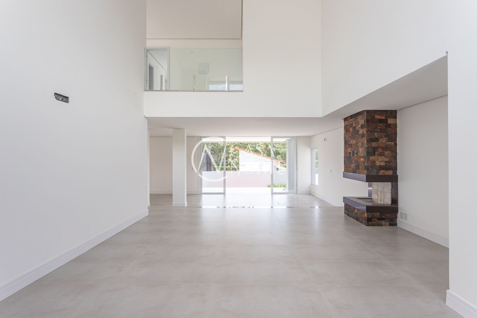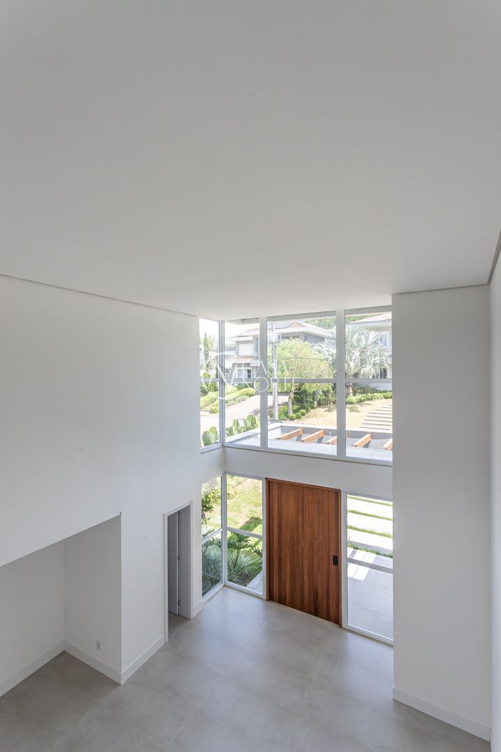 Com 484,92 m² de área privativa, a casa apresenta um living amplo e elegante, com possibilidade de até três ambientes, lareira, pé-direito elevado, piso em porcelanato e grandes esquadrias que garantem excelente iluminação natural e ventilação cruzada.
