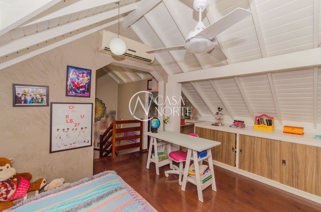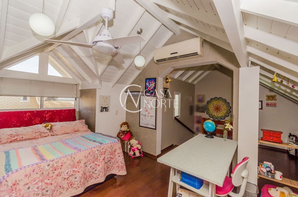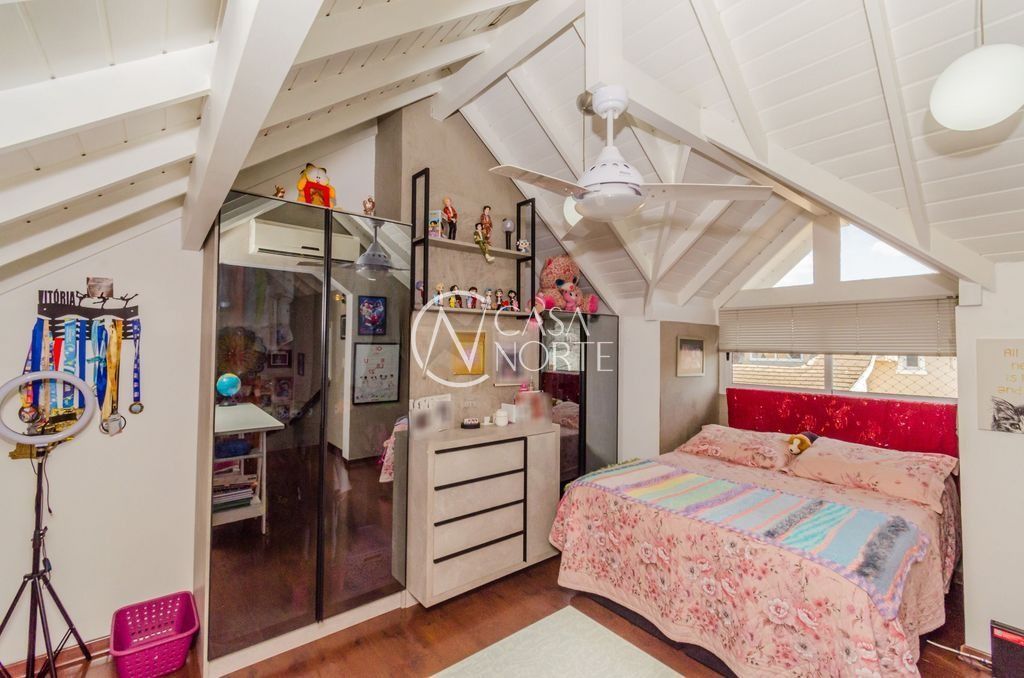 São quatro dormitórios, sendo uma suíte com banheira de hidromassagem e uma suíte americana que atende a dois quartos, garantindo praticidade e privacidade. O sótão foi transformado em um quarto adicional, ideal para visitas, home office ou sala de lazer.